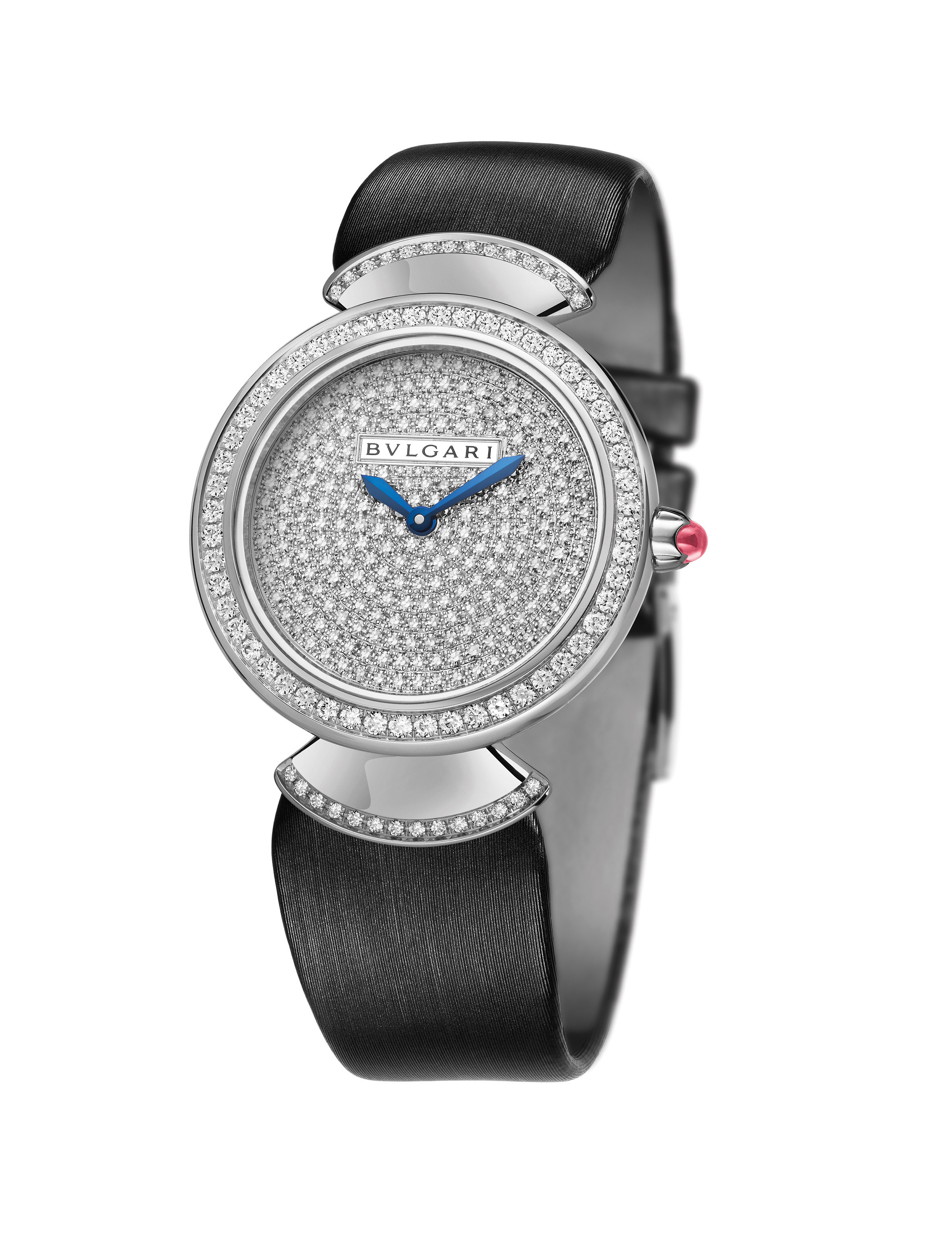 Bulgari fait la démonstration de sa double exigence, à la fois joaillière et horlogère. Pour la Maison romaine, un élément ne doit jamais être complètement et uniquement dédié à la seule performance pure, mais n’est jamais seulement non plus imaginé pour être exclusivement décoratif. Divas’ Dream puise une part de son inspiration dans la permanence de la beauté de Rome, cité majestueuse drapée dans sa robe d’éternité, et plus particulièrement un motif remarquable des mosaïques ornant les thermes romains de Caracalla. Un motif désormais emblématique des collections de Haute Joaillerie qui se marie avec le boîtier rond d’une montre. Des courbes parfaitement naturelles et suaves qui viennent non seulement souligner le dessin de la boîte, mais qui sont aussi le gage de l’adaptation du bracelet de satin grâce à un surprenant système secret d’articulation qui permet, en plus, de donner à la montre une souplesse inattendue, gage de parfait confort lorsque la montre est au poignet. Toute la force du design se révèle alors.