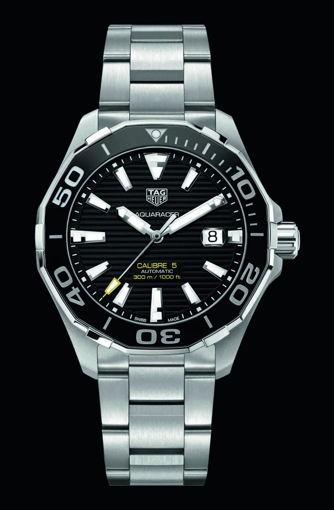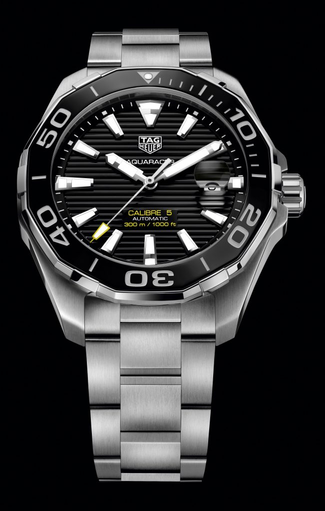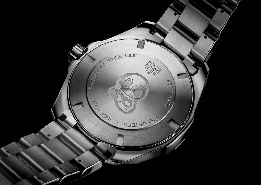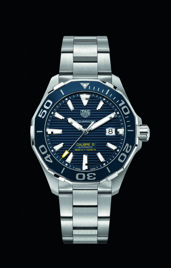 Pour l’édition 2016, l’Aquaracer devient plus puissante et massive avec une boite plus grande – 43 mm contre 41 mm auparavant. La lunette en céramique a été « reliftée » pour lui donner un look plus racé avec les chiffres gravés et laqués argent. On retrouve aussi la loupe (réintroduite l’année dernière) sur le guichet date. A l’intérieur, bat le mouvement mécanique automatique Calibre 5 qui a fait ses preuves, précis et fiable.