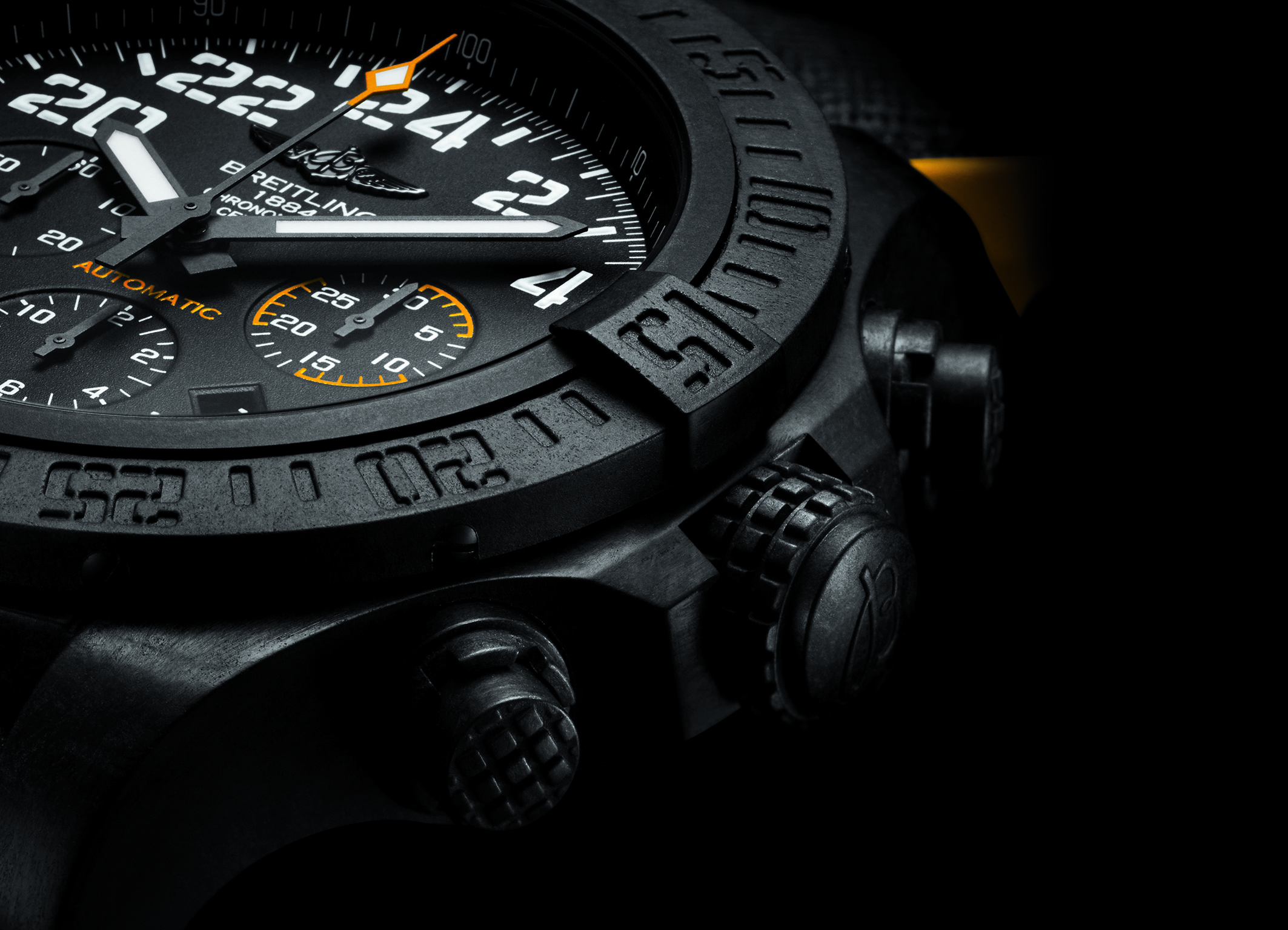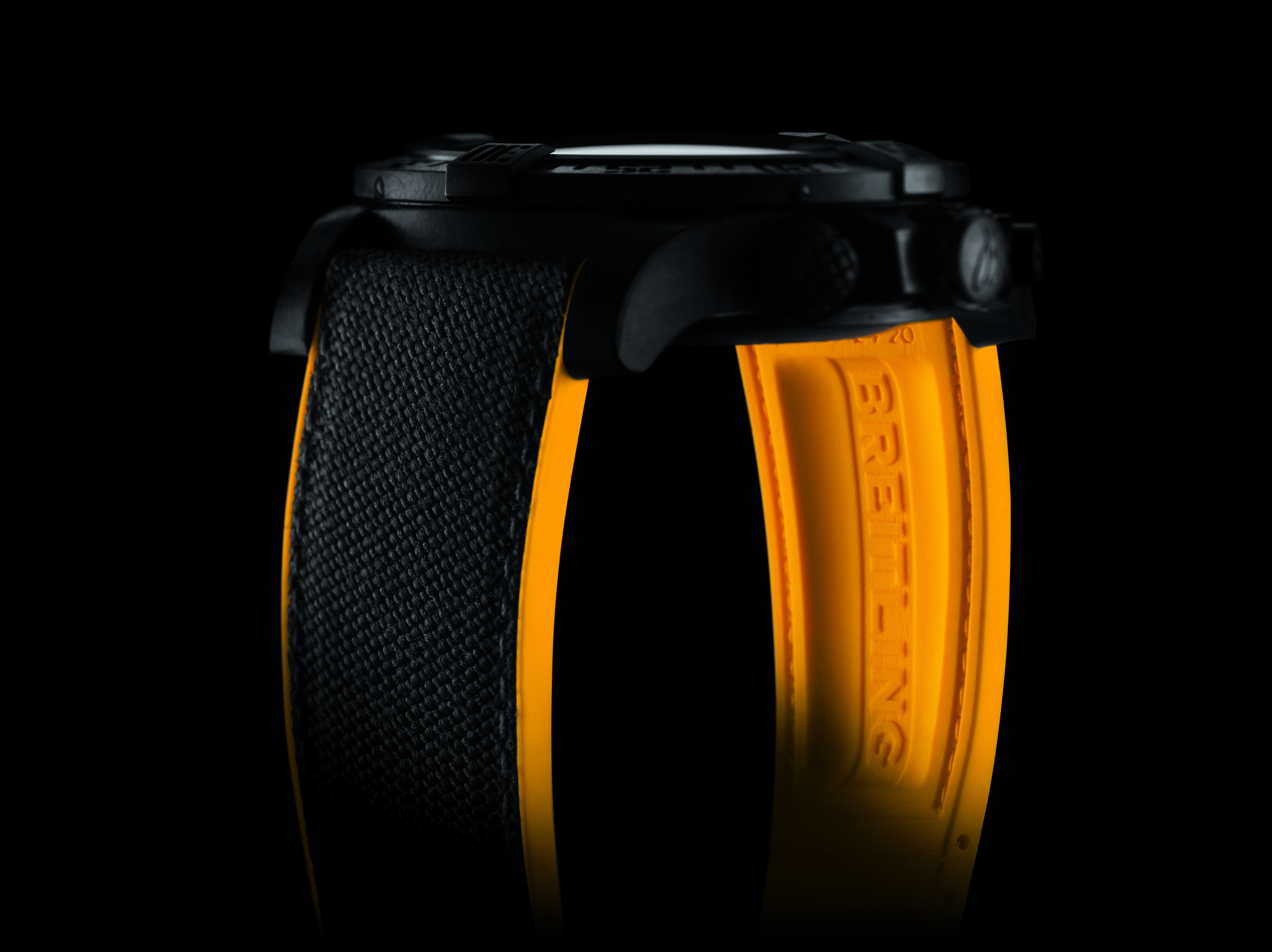 Extrême performance, grâce à l’utilisation novatrice du Breitlight®, une première mondiale sur un boîtier de montre. 3,3 fois plus léger que le titane et 5,8 fois plus que l’acier, mais nettement plus dur, ce matériau high-tech exclusif se distingue par de nombreuses qualités: résistance exceptionnelle aux rayures, à la traction et à la corrosion, amagnétisme, stabilité thermique, caractère anallergique – sans oublier un «toucher» plus chaud que le métal et un effet légèrement marbré renforçant l’originalité du design.