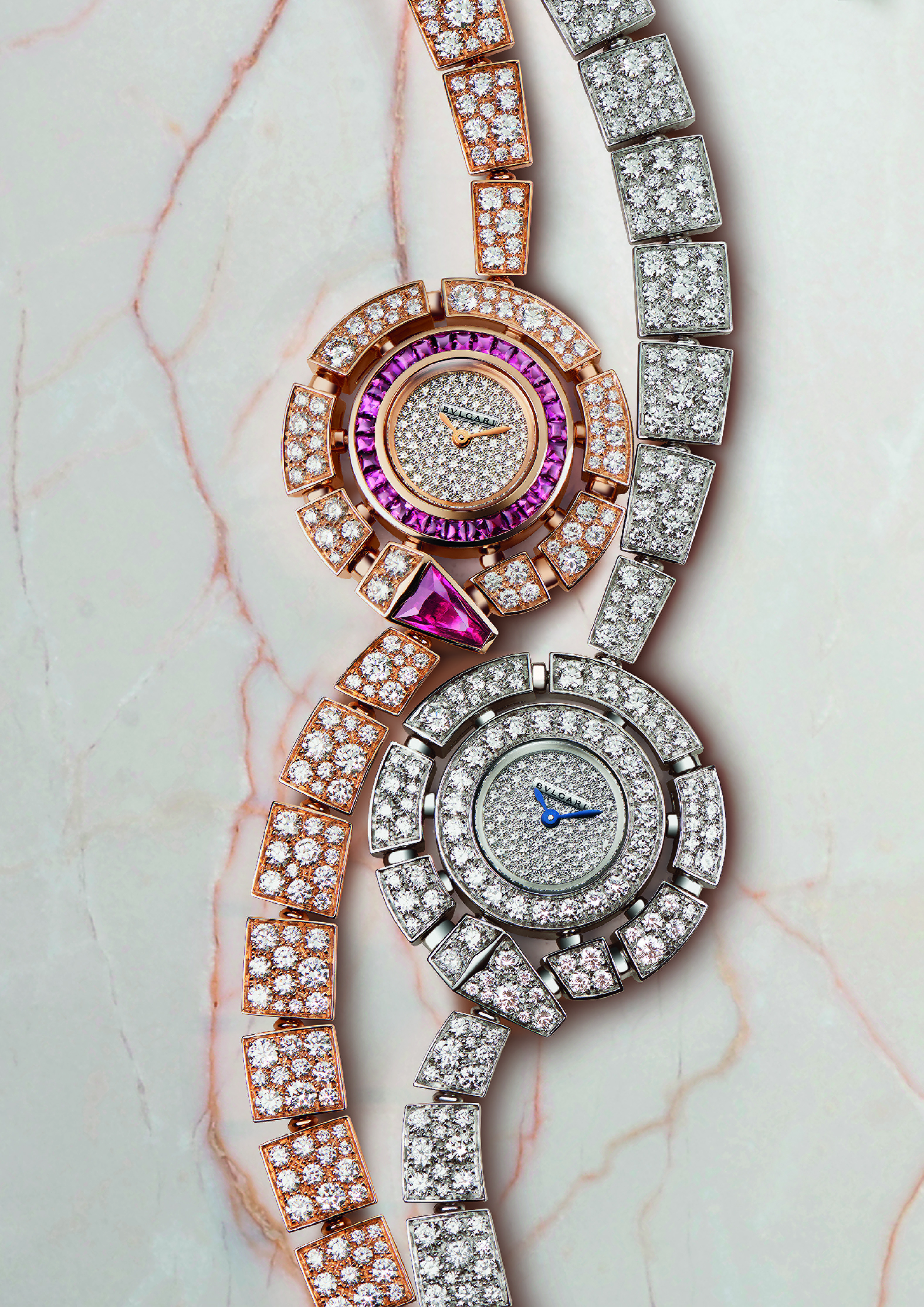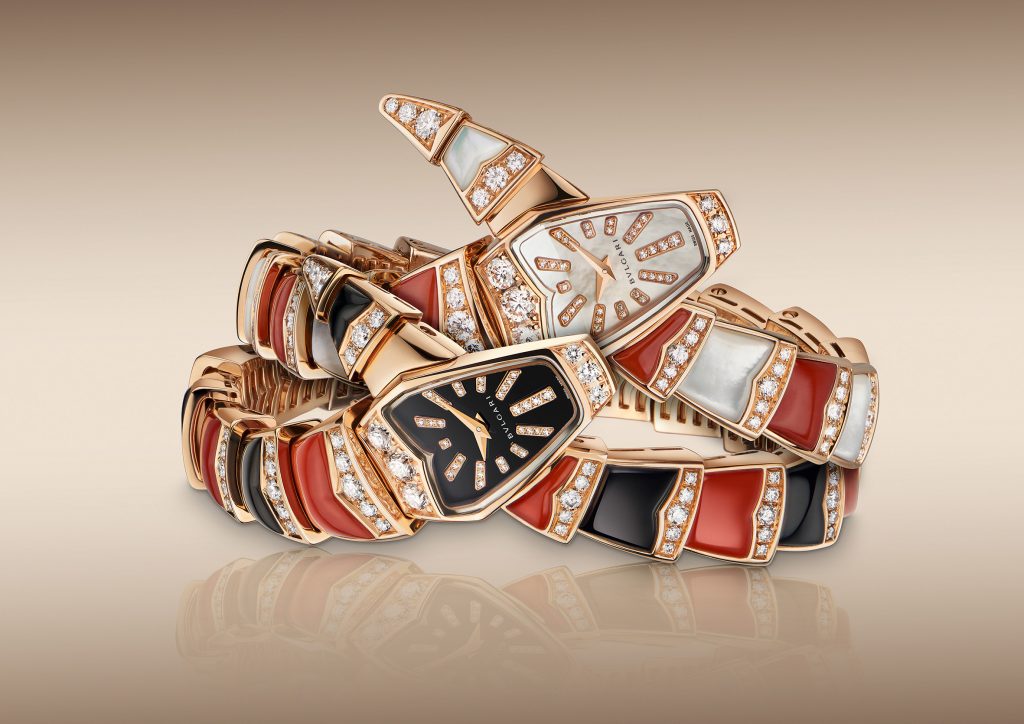 Dès lors que le thème du serpent est éternel, Bulgari donne une nouvelle interprétation à la ligne joaillière plus classiquement montée sur bracelet faisant un tour de poignet, Serpenti Joaillerie, et dont le design caractéristique voit la tête du reptile reposer sur sa queue. Cette ligne fait la part belle aux combinaisons chromatiques que procurent diamants, nacre de couleur, corail, onyx ou encore turquoise montés sur une structure en or rose.
