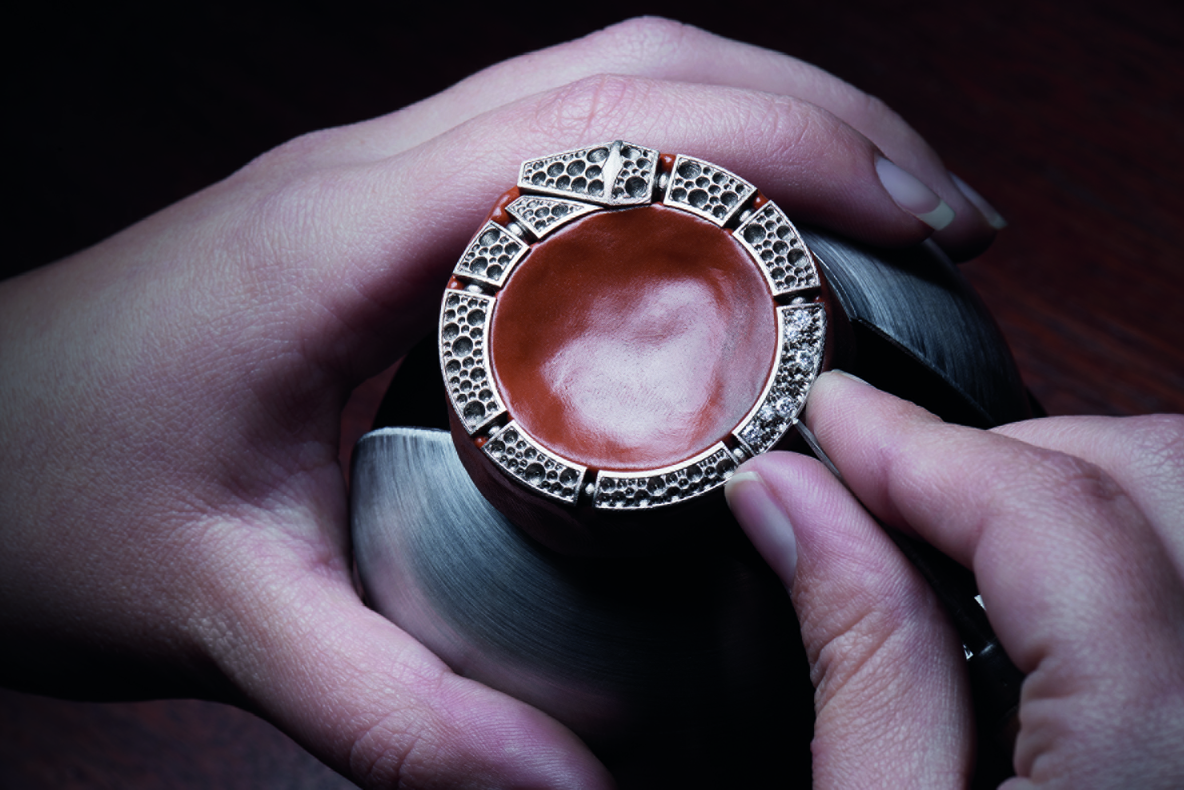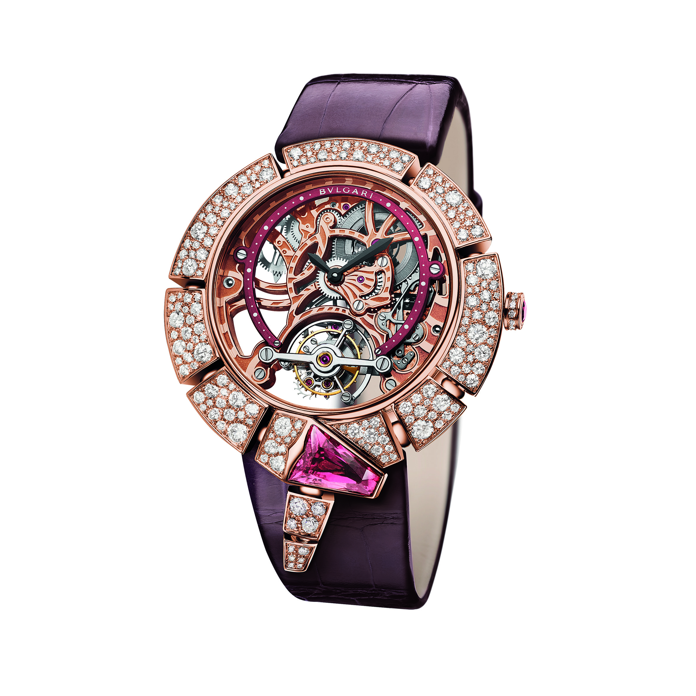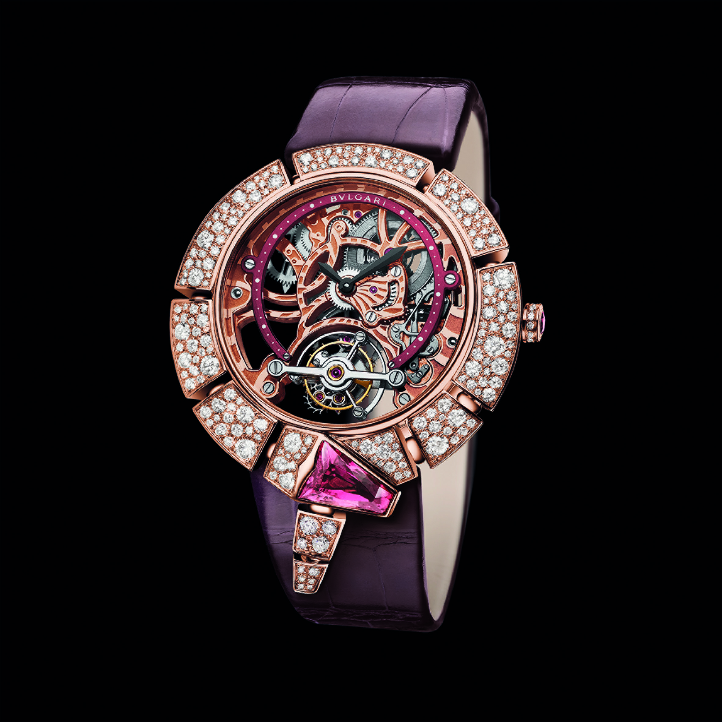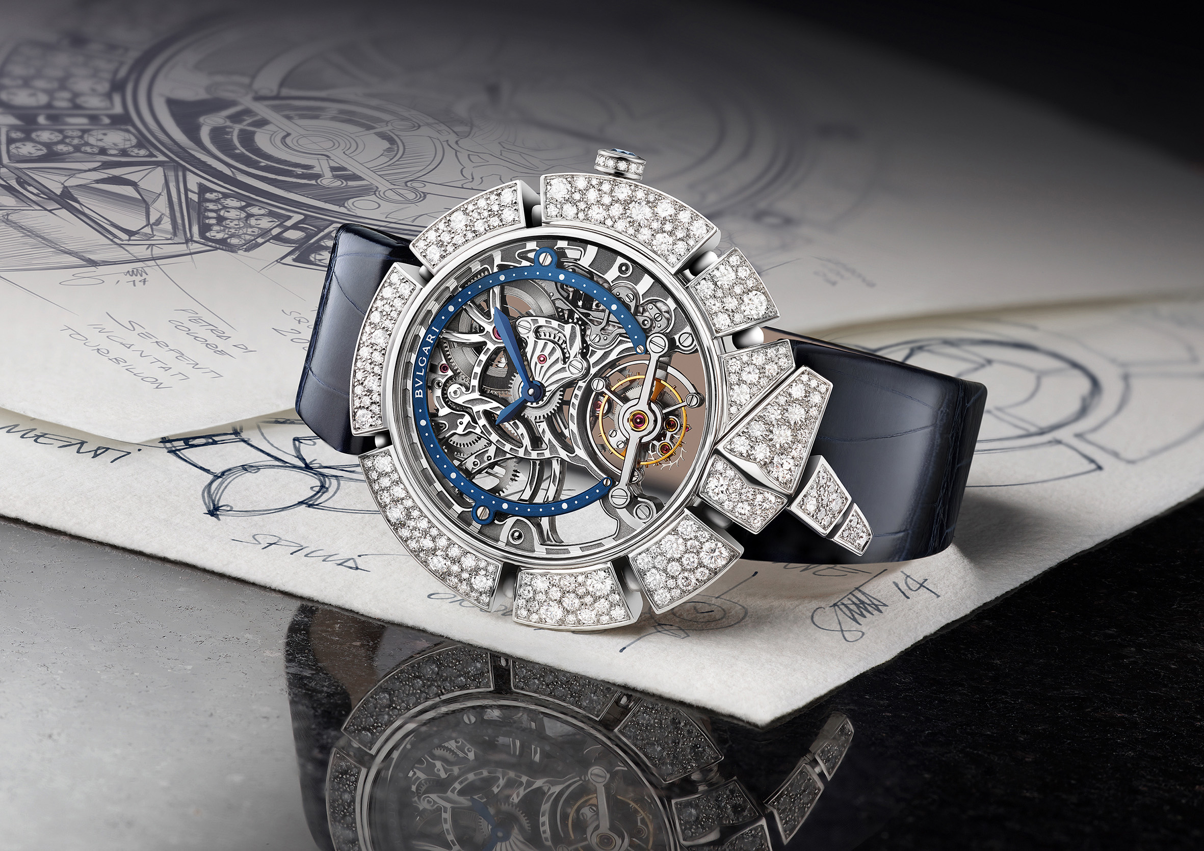 C’est ainsi que Serpenti Incantati offre une nouvelle vie à son symbole. Après s’être enroulé autour du poignet, le serpent se réinvente aujourd’hui en épousant, pour la toute première fois, le boîtier d’une montre ronde: le reptile s’enroule autour du cadran de la montre pour enserrer un calibre manufacture à Tourbillon intégralement squeletté. Gracile et aérien, ce mouvement est une œuvre d’art: platine et ponts sont ciselés dans l’or rose ou blanc, les flancs sont étirés, pourtours et moulures sont tous anglés et systématiquement polis. Les aciers subissent eux aussi semblable traitement. Ces minutieuses opérations sont complétées par les finitions de surface chères à la Haute Horlogerie: perlage et colimaçonnage parachèvent l’ensemble d’un travail à forte valeur ajoutée pour un résultat spectaculaire.