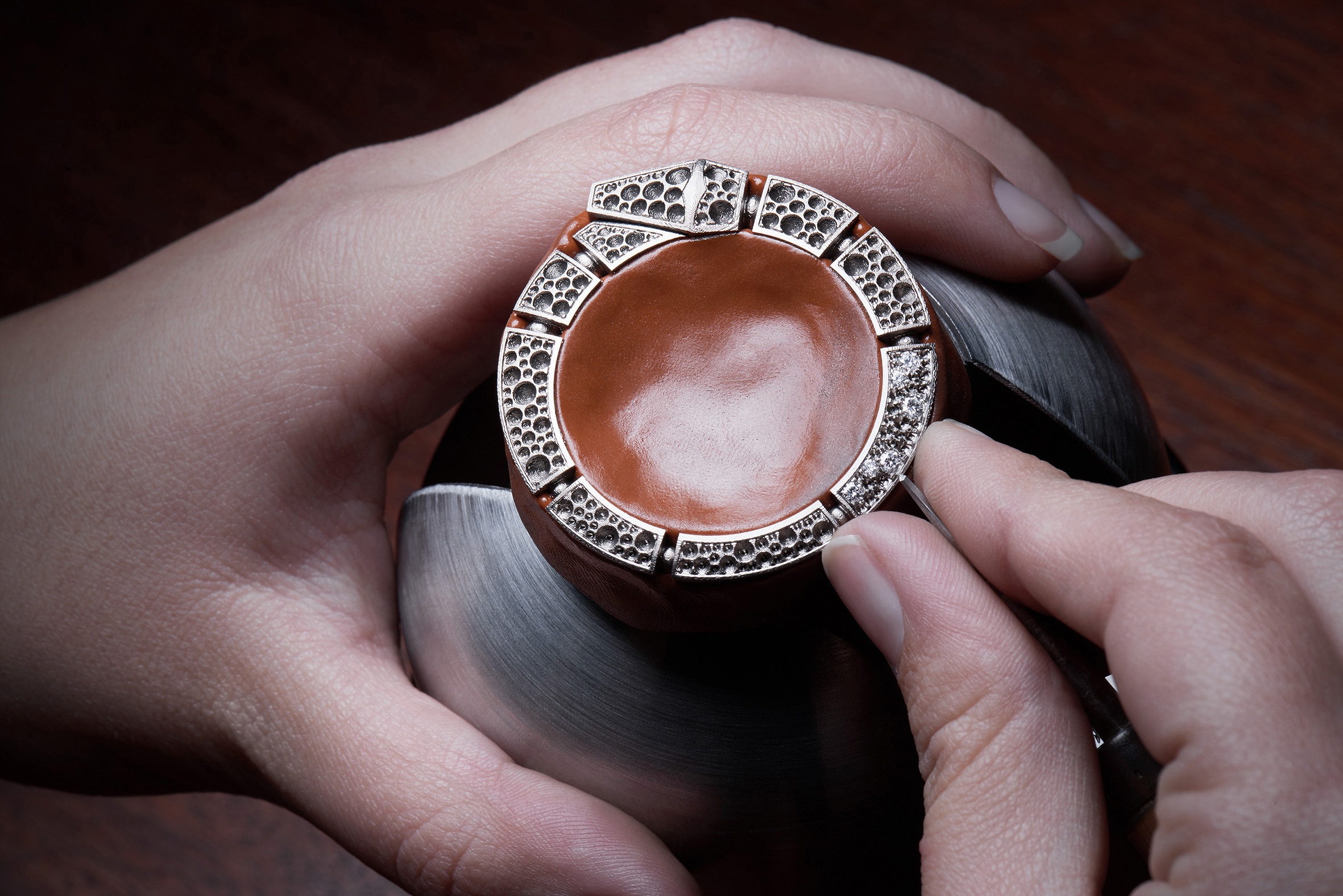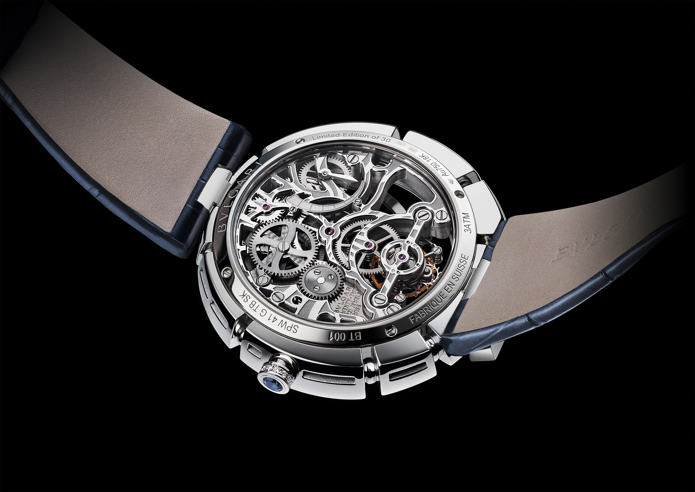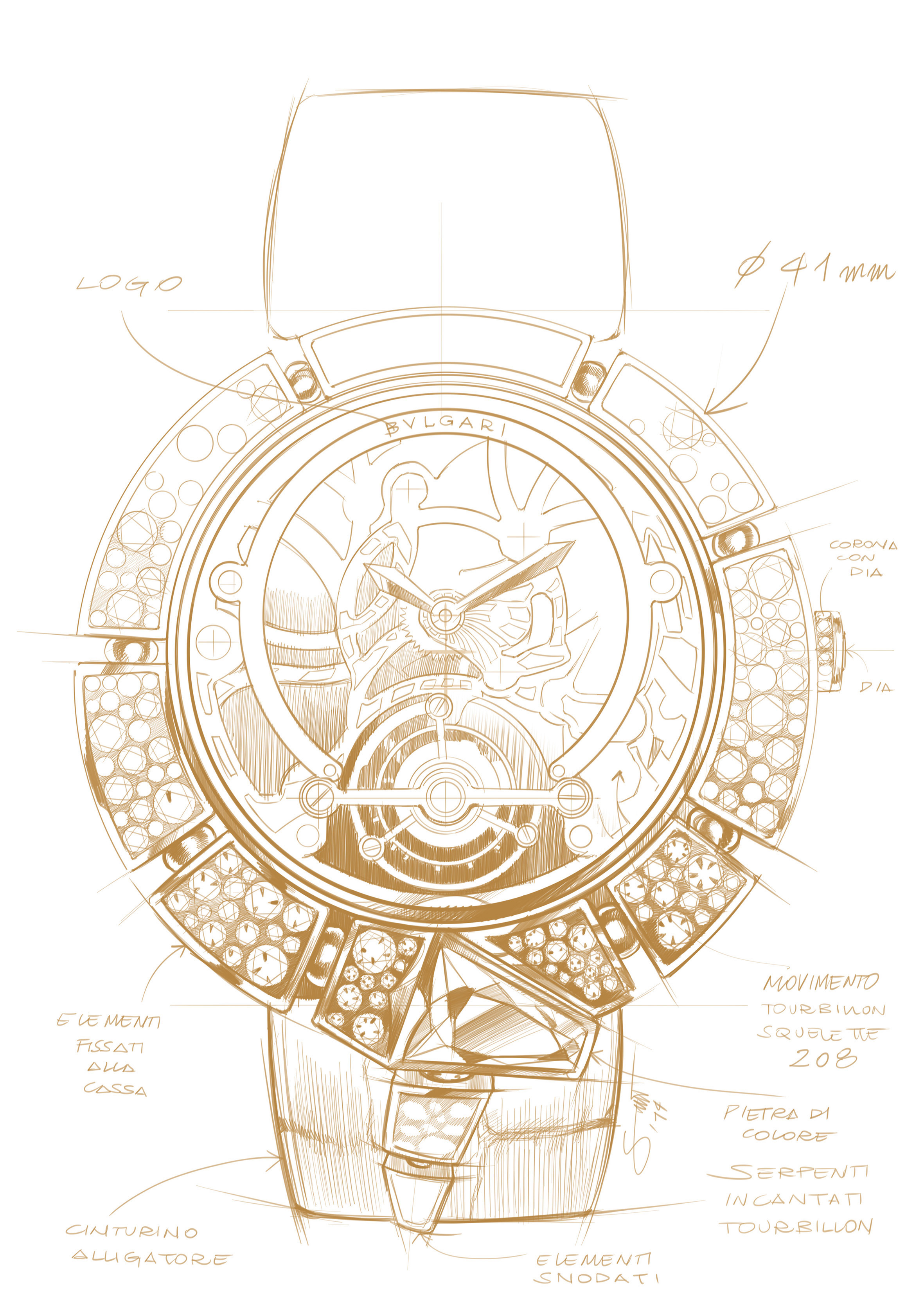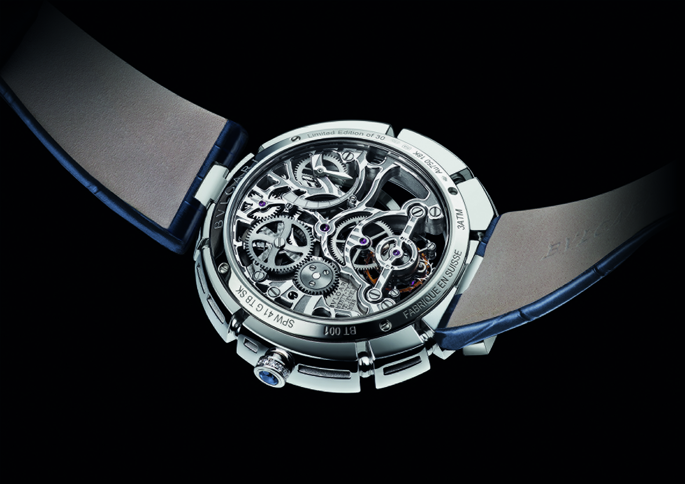 C’est ainsi que Serpenti Incantati offre une nouvelle vie à son symbole. Après s’être enroulé autour du poignet, le serpent se réinvente aujourd’hui en épousant, pour la toute première fois, le boîtier d’une montre ronde: le reptile s’enroule autour du cadran de la montre pour enserrer un calibre manufacture à Tourbillon intégralement squeletté. Gracile et aérien, ce mouvement est une œuvre d’art: platine et ponts sont ciselés dans l’or rose ou blanc, les flancs sont étirés, pourtours et moulures sont tous anglés et systématiquement polis. Les aciers subissent eux aussi semblable traitement. Ces minutieuses opérations sont complétées par les finitions de surface chères à la Haute Horlogerie: perlage et colimaçonnage parachèvent l’ensemble d’un travail à forte valeur ajoutée pour un résultat spectaculaire.