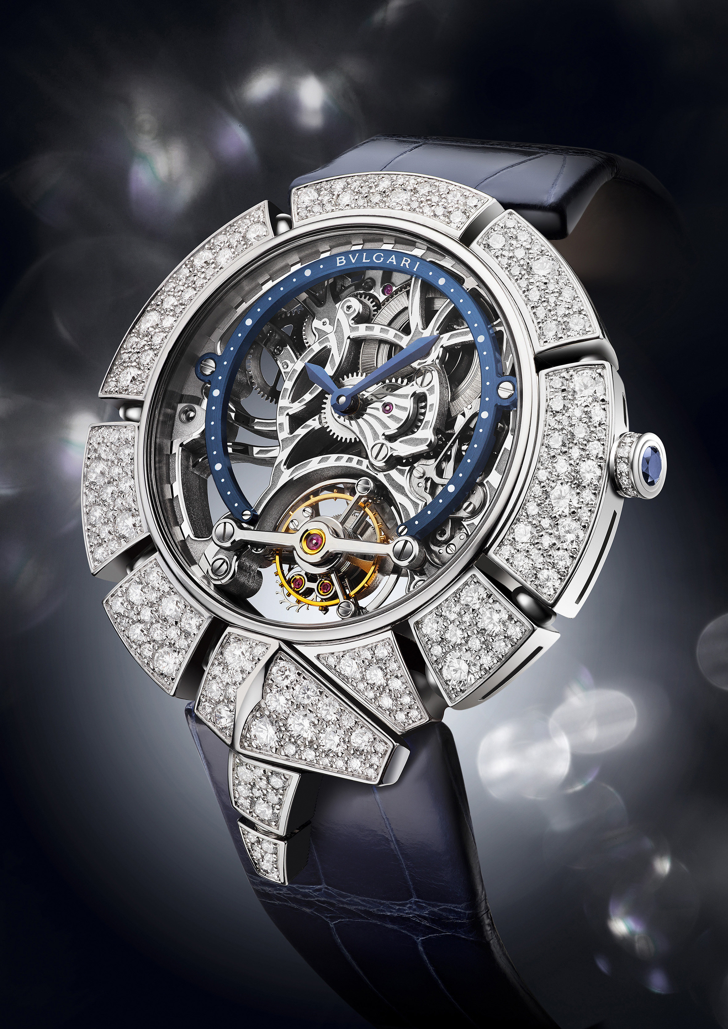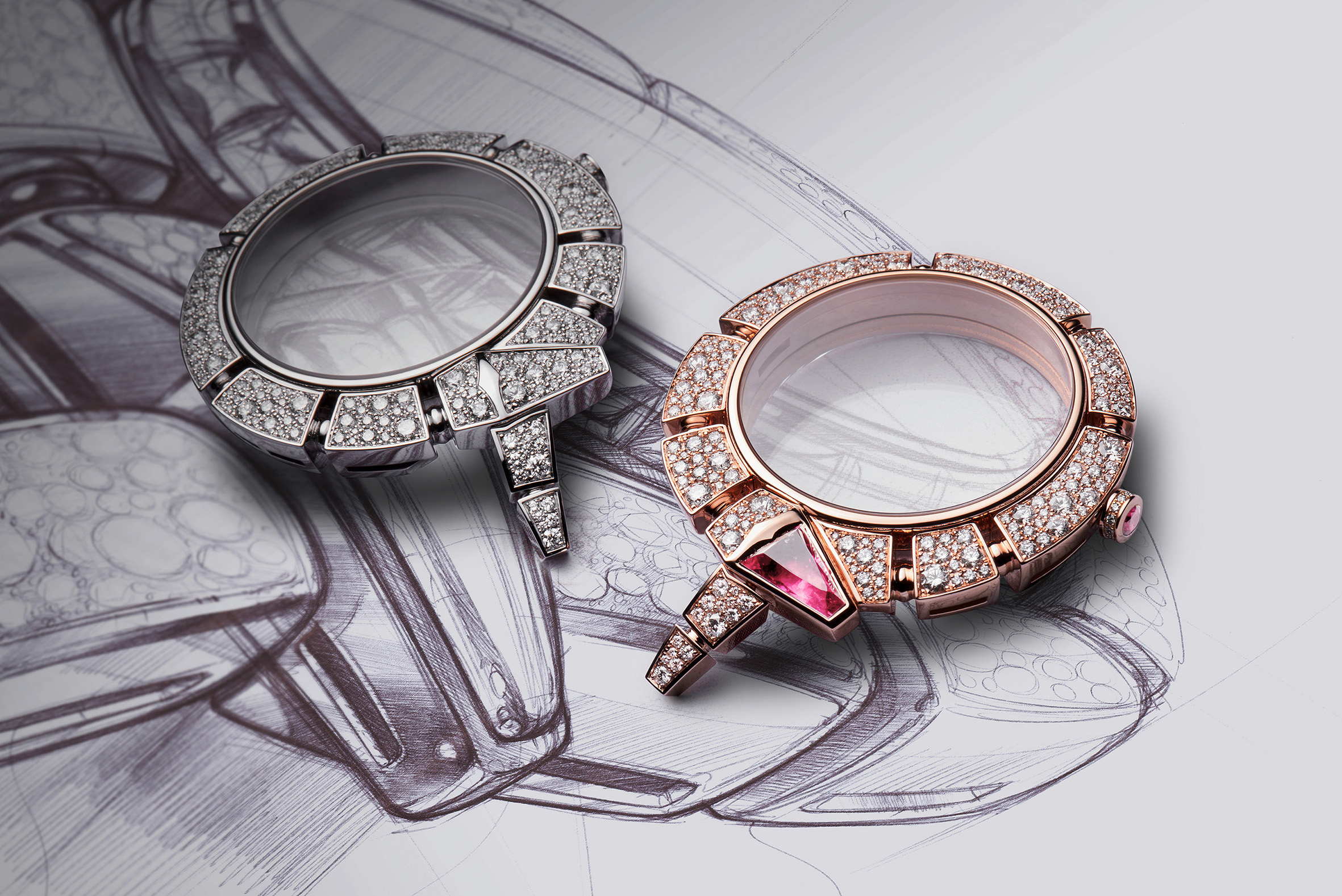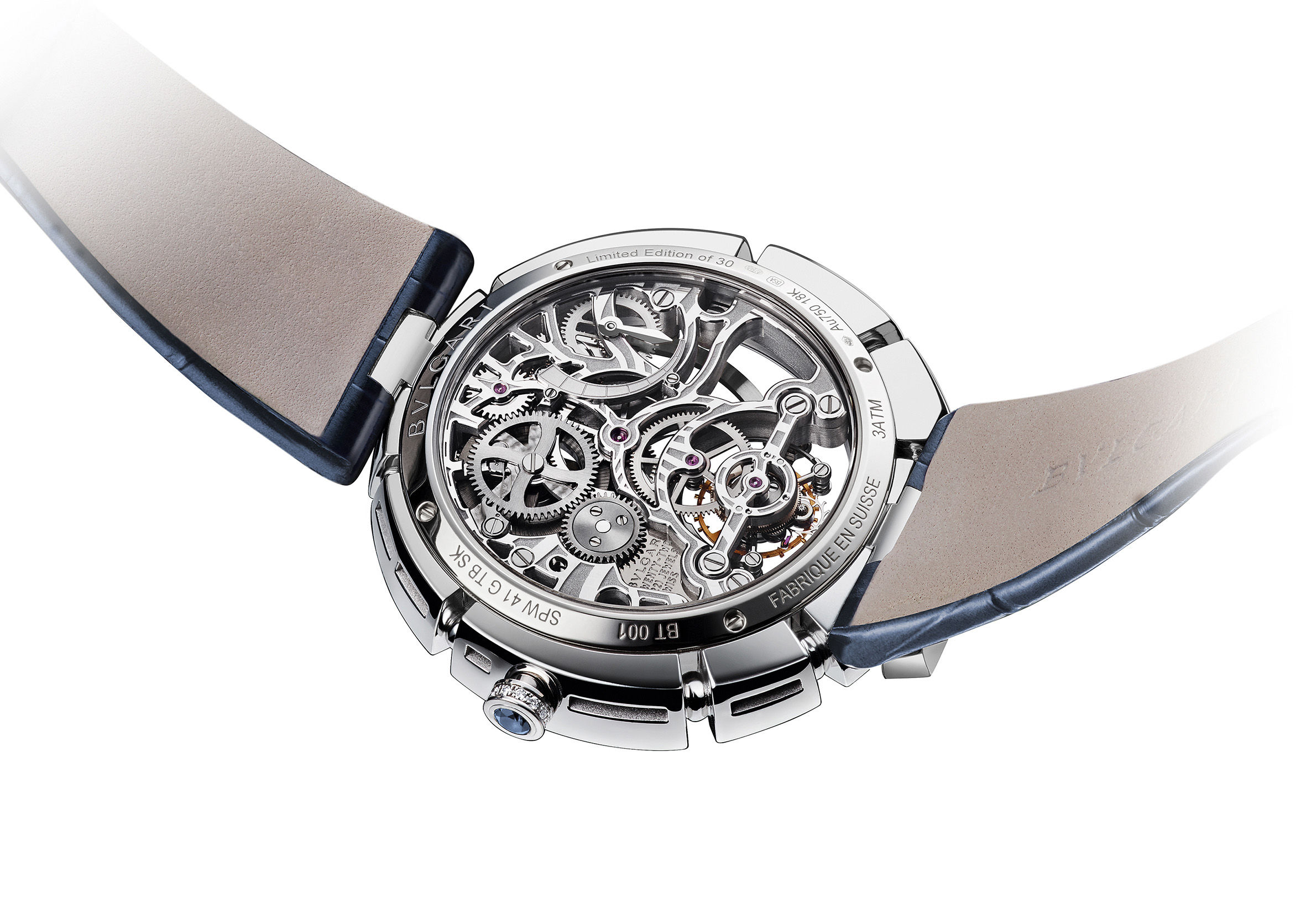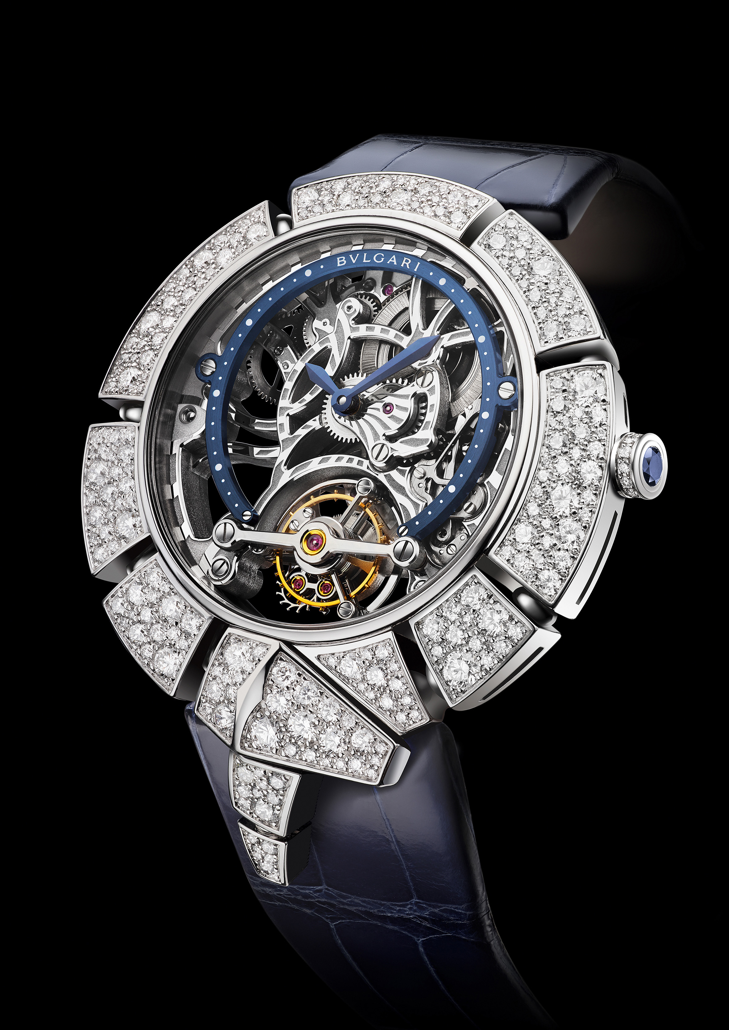 C’est ainsi que Serpenti Incantati offre une nouvelle vie à son symbole. Après s’être enroulé autour du poignet, le serpent se réinvente aujourd’hui en épousant, pour la toute première fois, le boîtier d’une montre ronde: le reptile s’enroule autour du cadran de la montre pour enserrer un calibre manufacture à Tourbillon intégralement squeletté. Gracile et aérien, ce mouvement est une œuvre d’art: platine et ponts sont ciselés dans l’or rose ou blanc, les flancs sont étirés, pourtours et moulures sont tous anglés et systématiquement polis. Les aciers subissent eux aussi semblable traitement. Ces minutieuses opérations sont complétées par les finitions de surface chères à la Haute Horlogerie: perlage et colimaçonnage parachèvent l’ensemble d’un travail à forte valeur ajoutée pour un résultat spectaculaire.