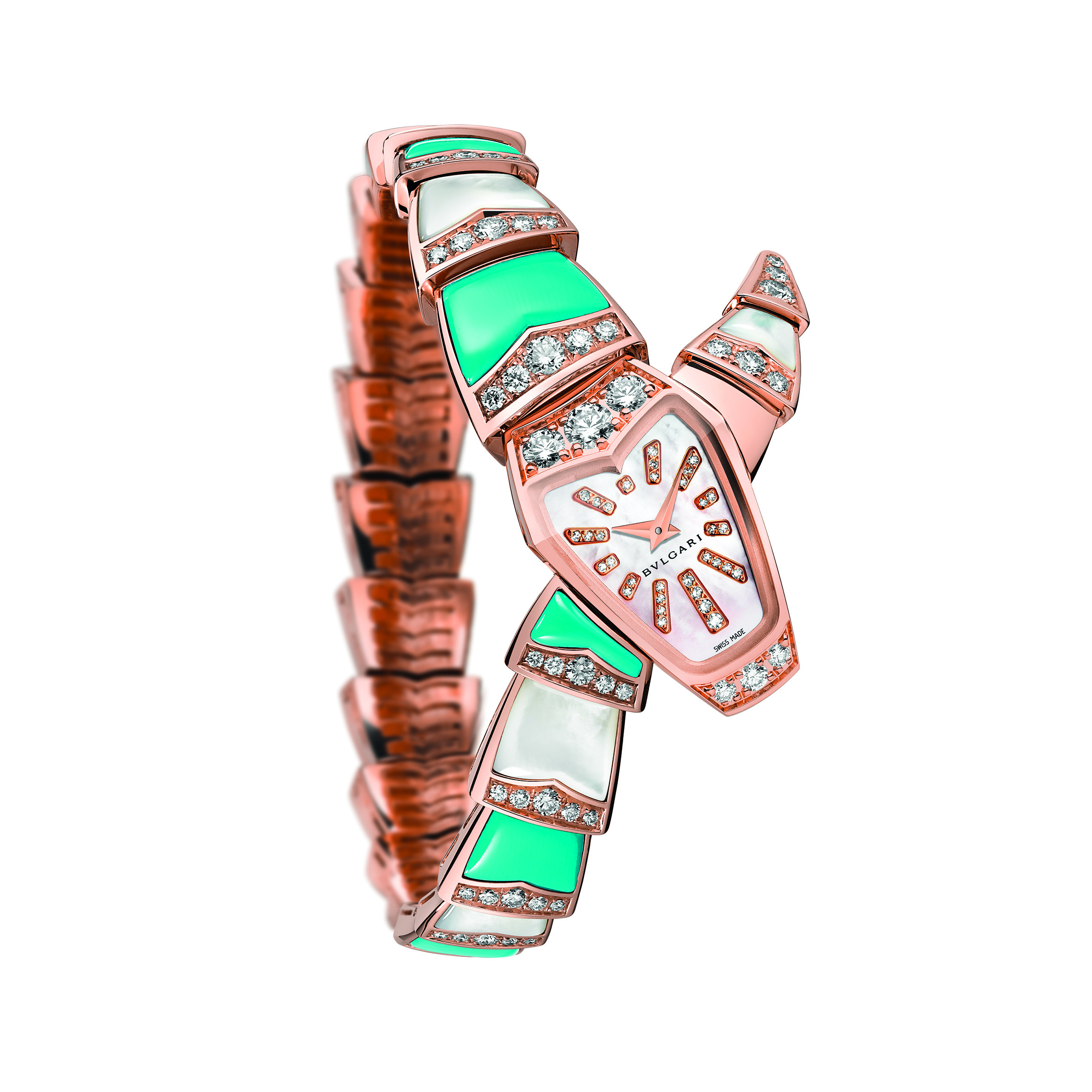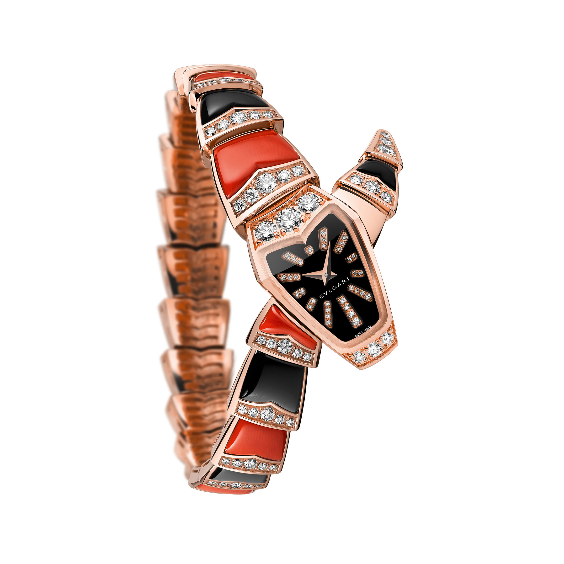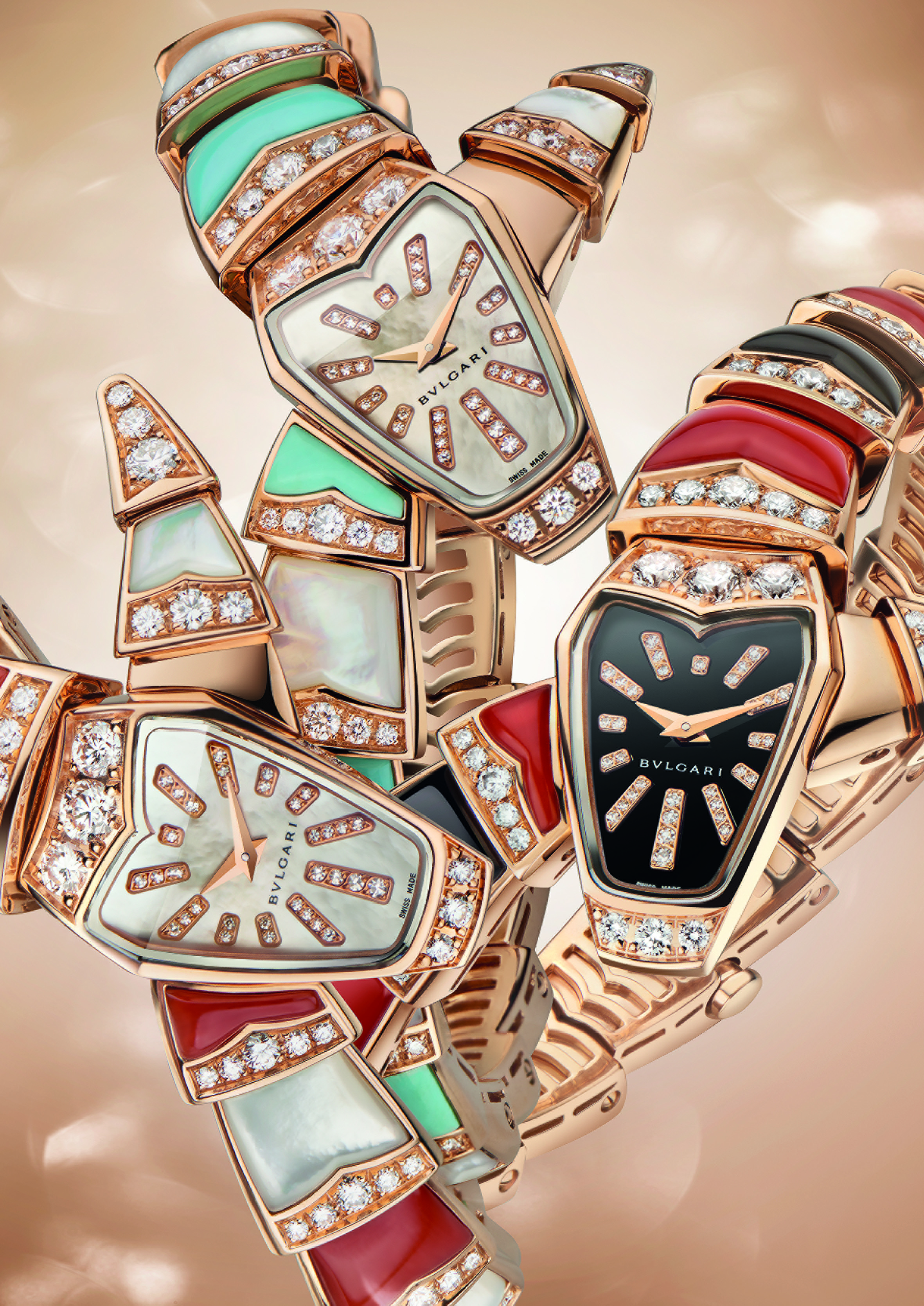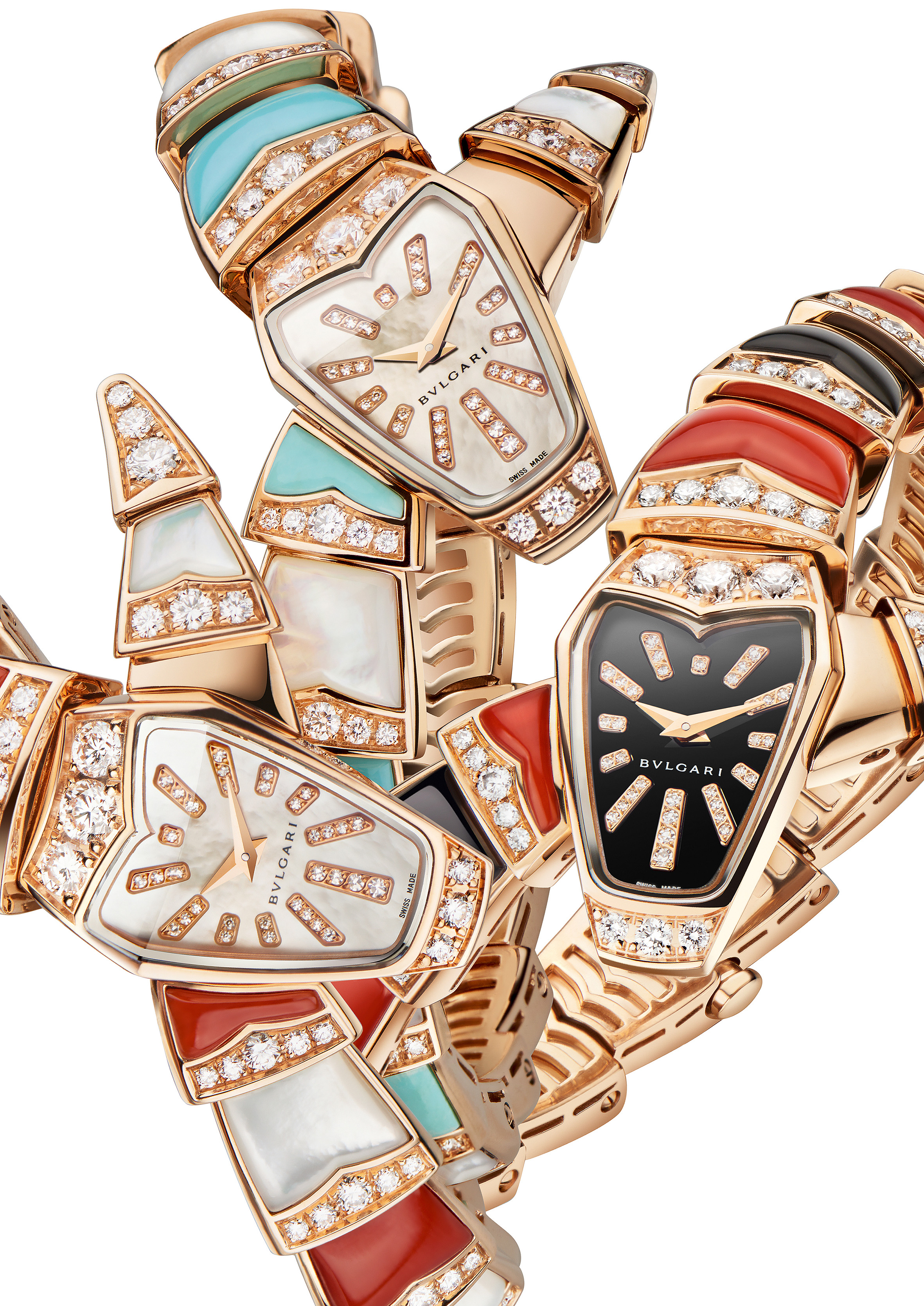 Sur un registre formel propre à cette exécution, la Maison présente trois pièces joaillières et colorées, interprétations scintillantes dont l’une marie sur son bracelet nacre et corail, la seconde nacre et turquoise alors que la dernière associe onyx et corail. Un délicat rang de diamants surmonte les éléments du bracelet qui se prolonge sur la tête du serpent, en or rose sertie elle aussi de diamants. La version onyx et corail présente un cadran noir laqué avec index en diamants taille brillant alors que les autres exécutions affichent toutes deux un cadran de nacre rose parsemé également d’index diamants taille brillant.