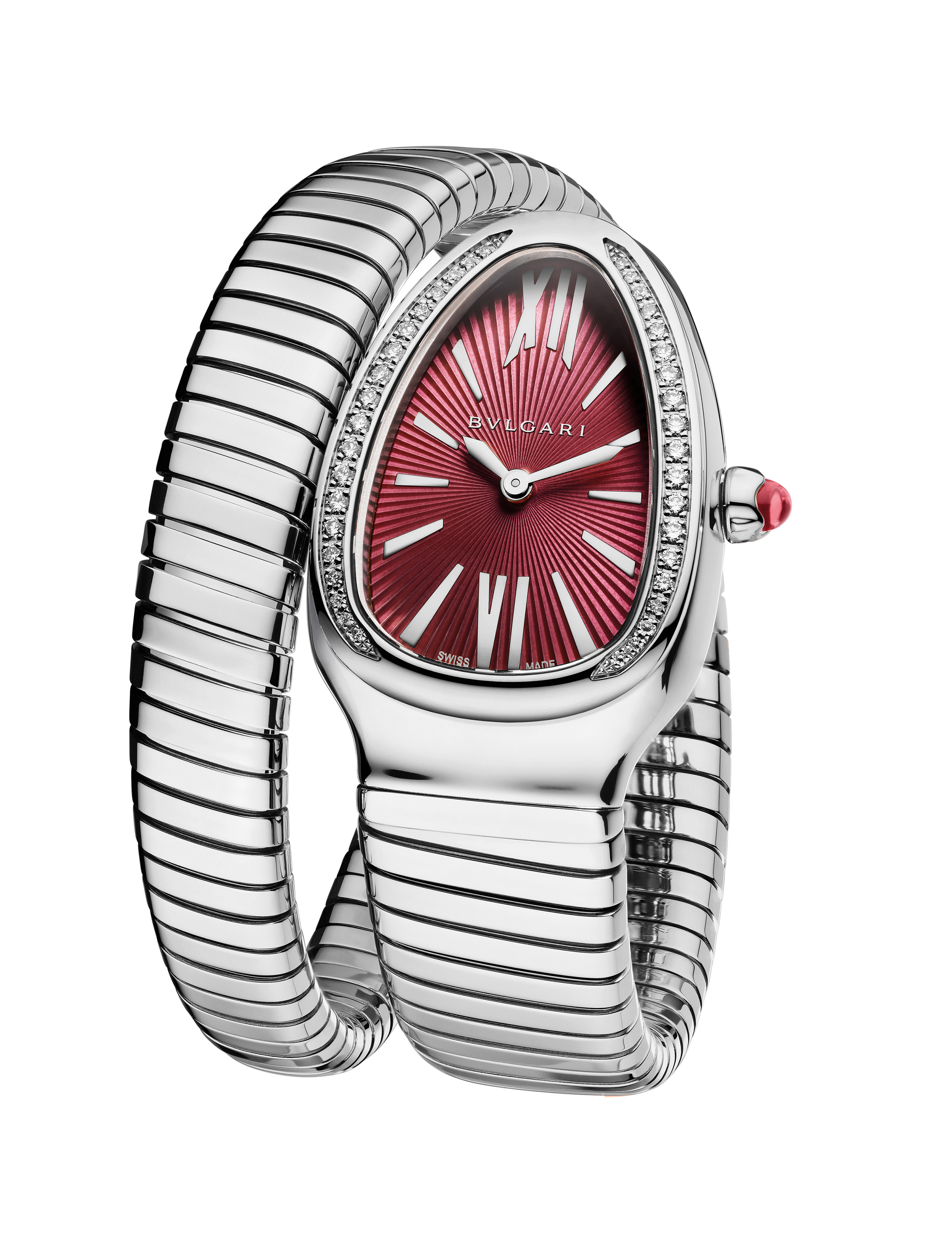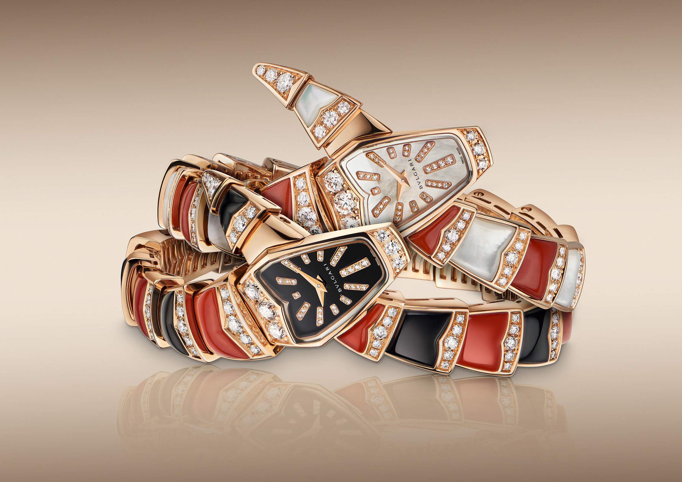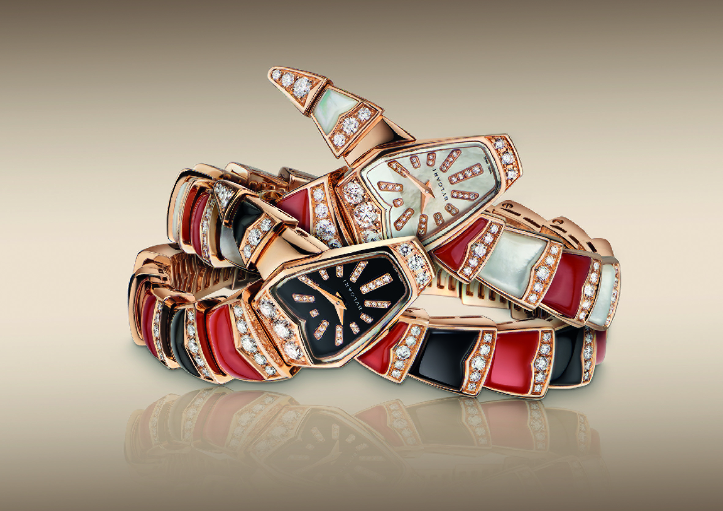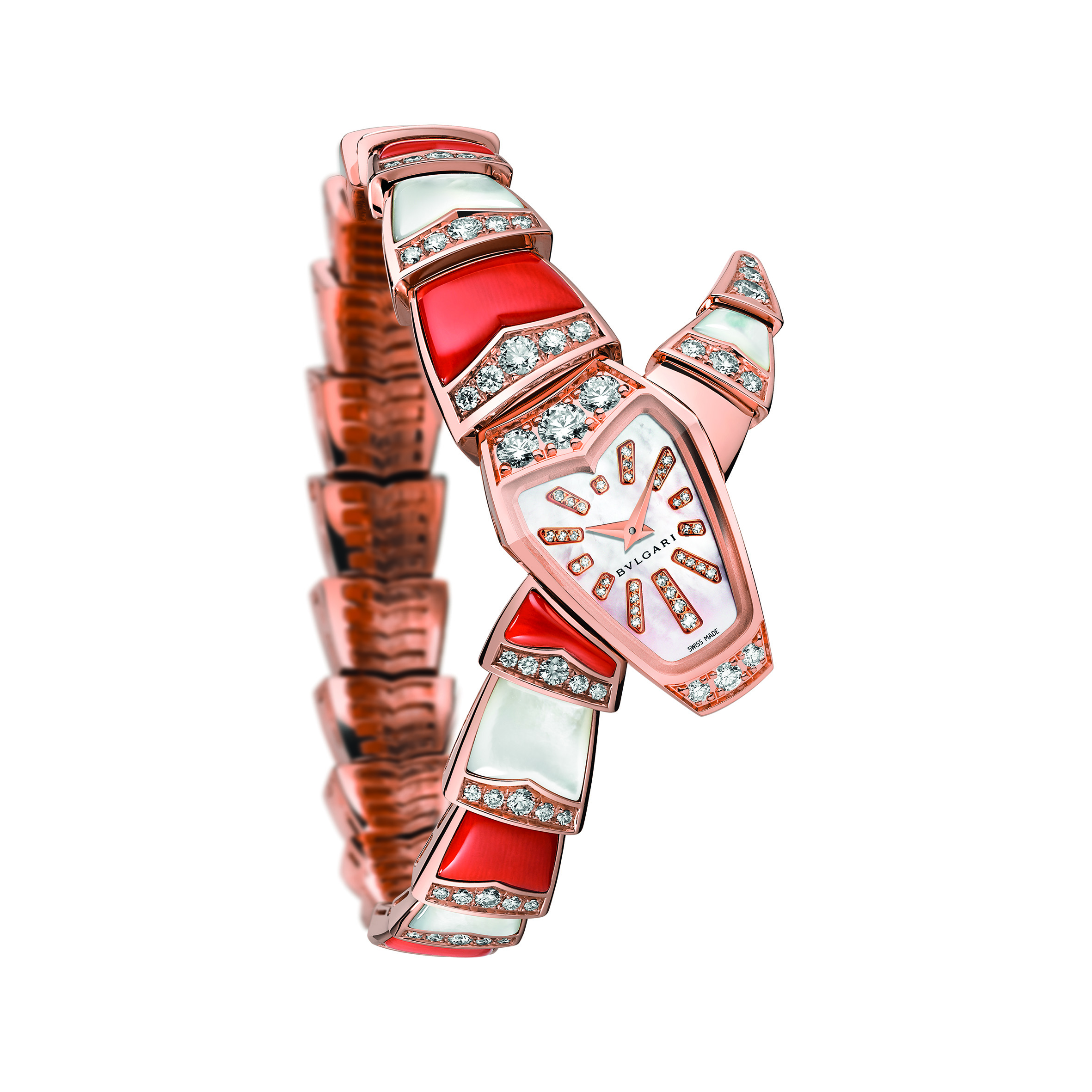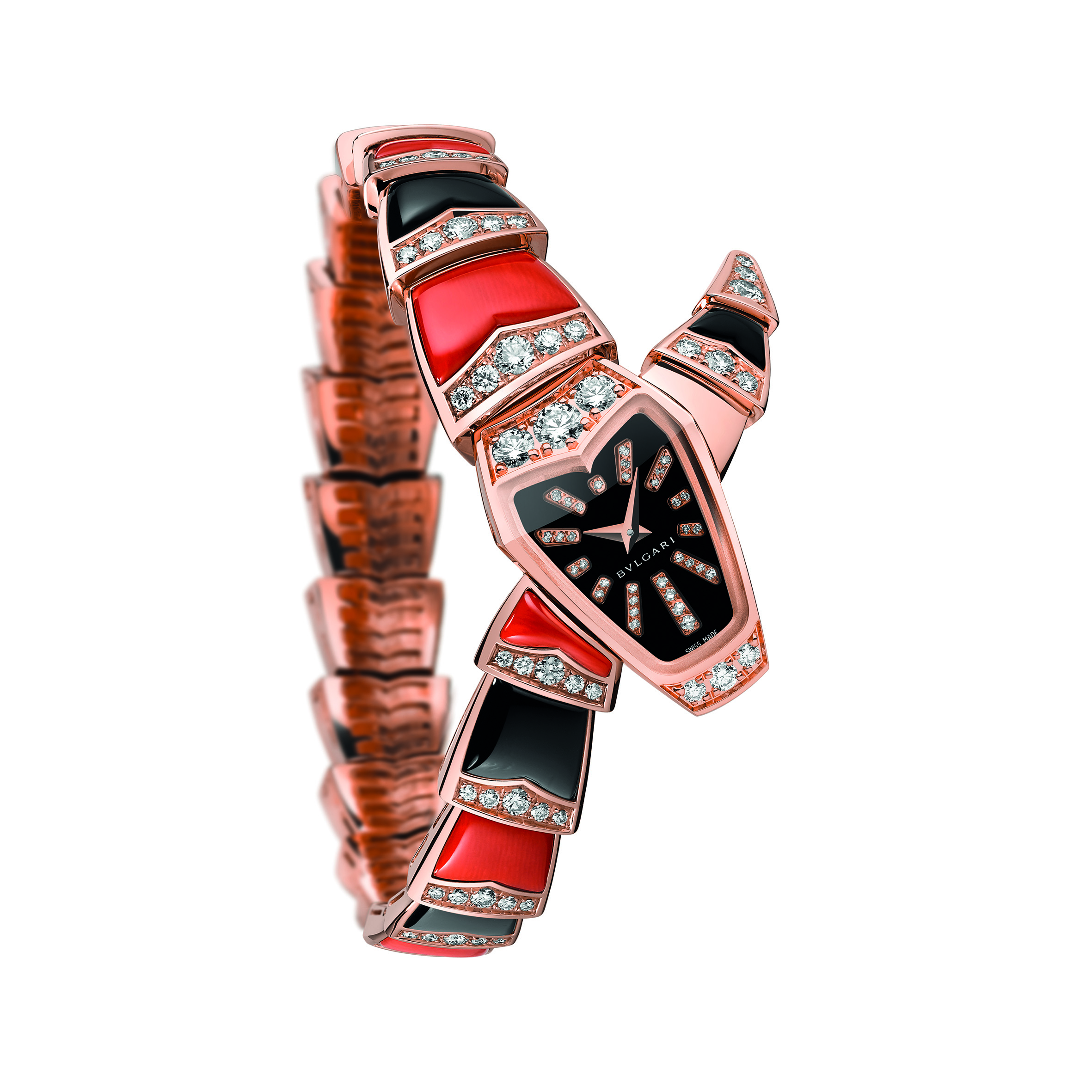 Sur un registre formel propre à cette exécution, la Maison présente trois pièces joaillières et colorées, interprétations scintillantes dont l’une marie sur son bracelet nacre et corail, la seconde nacre et turquoise alors que la dernière associe onyx et corail. Un délicat rang de diamants surmonte les éléments du bracelet qui se prolonge sur la tête du serpent, en or rose sertie elle aussi de diamants. La version onyx et corail présente un cadran noir laqué avec index en diamants taille brillant alors que les autres exécutions affichent toutes deux un cadran de nacre rose parsemé également d’index diamants taille brillant.