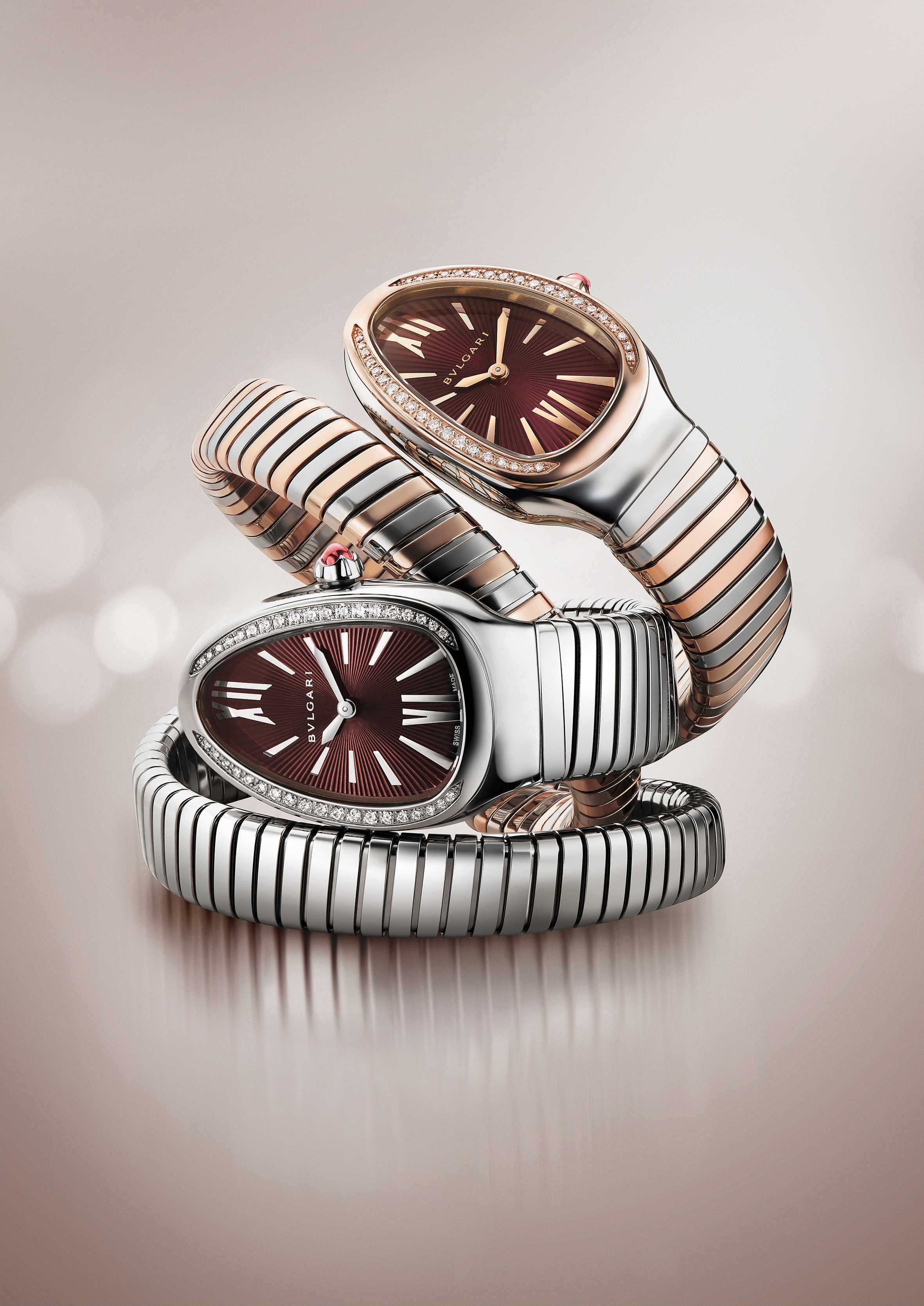Mais, plus sagement, Serpenti Tubogas sait aussi se faire plus discrète dans ses deux nouvelles versions sur un tour de poignet assorties d’un cadran violet rappelant l’améthyste. L’une a l’éclat net de l’acier poli. La matière sublime le caractère architectural et technique du bracelet articulé. L’autre, jouant sur la combinaison des reflets chromés et or, démontre la maîtrise de la maison Bulgari pour façonner la matière et particulièrement les métaux. Baptisés ainsi en référence à l’esthétique moderniste et industrielle des tubes d’échappement des voitures sportives de luxe de la période Art Déco, les premiers bijoux souples de Bulgari apparaissent en 1932. Rapidement, le joaillier décline aussi une collection de montres, unique en son genre, et au style affirmé. Ce bracelet s’enroulant à double tour avec volupté en est l’atout majeur.
