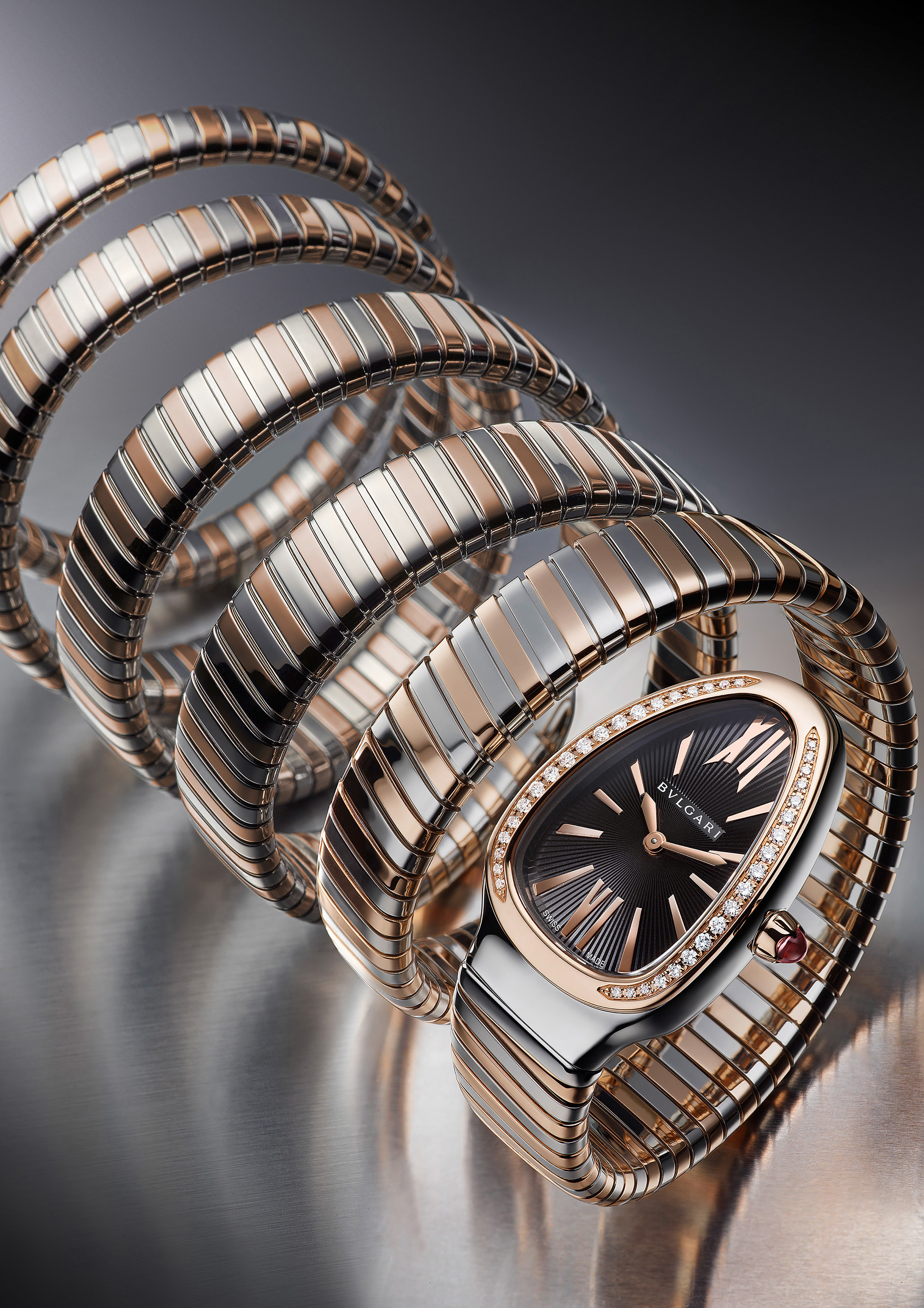 En parallèle et associé au thème du serpent, Bulgari réinterprète un autre de ses symboles: le bracelet Tubogas, dont trois interprétations sont proposées à commencer par une version inouïe dont les 5 rangs d’acier et or rose mettent littéralement en scène l’avant-bras de celle qui la porte! Du poignet à la commissure du coude, Serpenti dévoile sur cinq rangs son infinie souplesse et son exceptionnelle faculté d’adaptation. A la fois bracelet, parure et devenant telle une seconde peau.