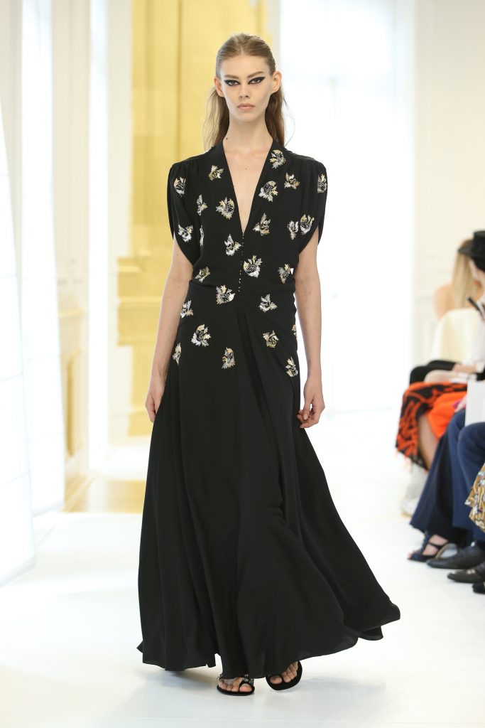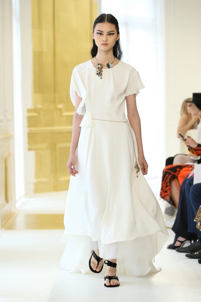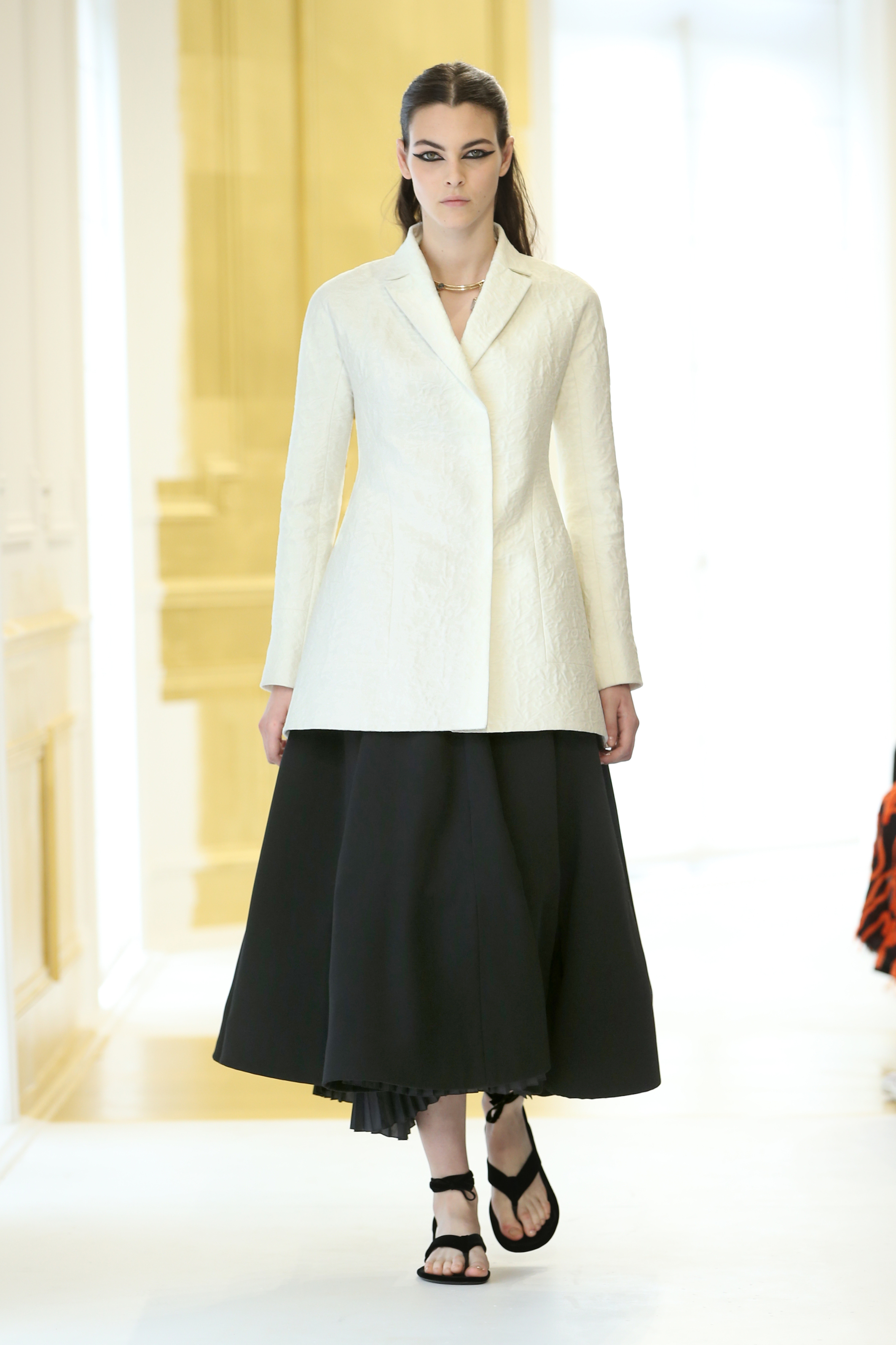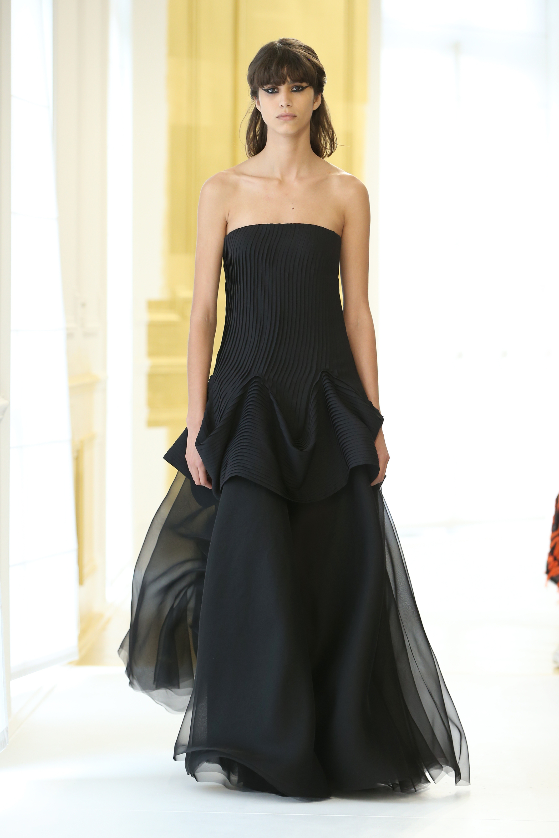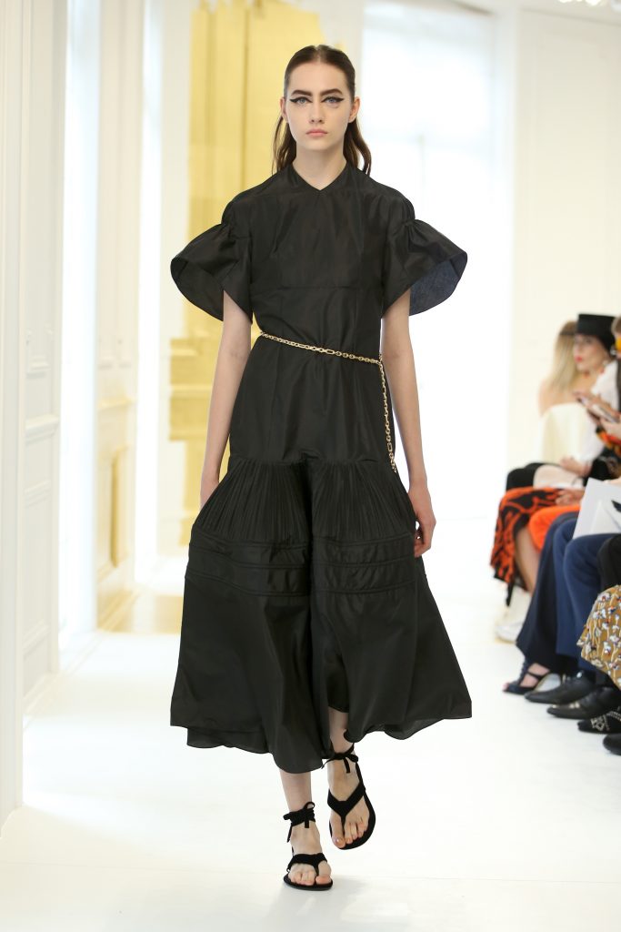 En effet, la structure du Bar est réinterprétée. Lucie Meier et Serge Ruffieux commencent par sa jupe qui donne ici naissance à des expérimentations sur les plissés, drapés dans des robes du soir ou sur des jupes longues. Sa doublure – ses épaisseurs d’organza qui lui donnent corps – devient un vêtement à part entière comme si le modèle originel était vu aux rayons X. Les volumes couture du New Look deviennent plus légers, plus contemporains : c’est tout l’esprit de l’atelier ou exprimé par l’atelier tailleur. La veste elle-même est déconstruite, allongée aux basques ou basculée à la verticale, et apporte ainsi de l’animation et du mouvement, un nouveau look et un esprit Dior.