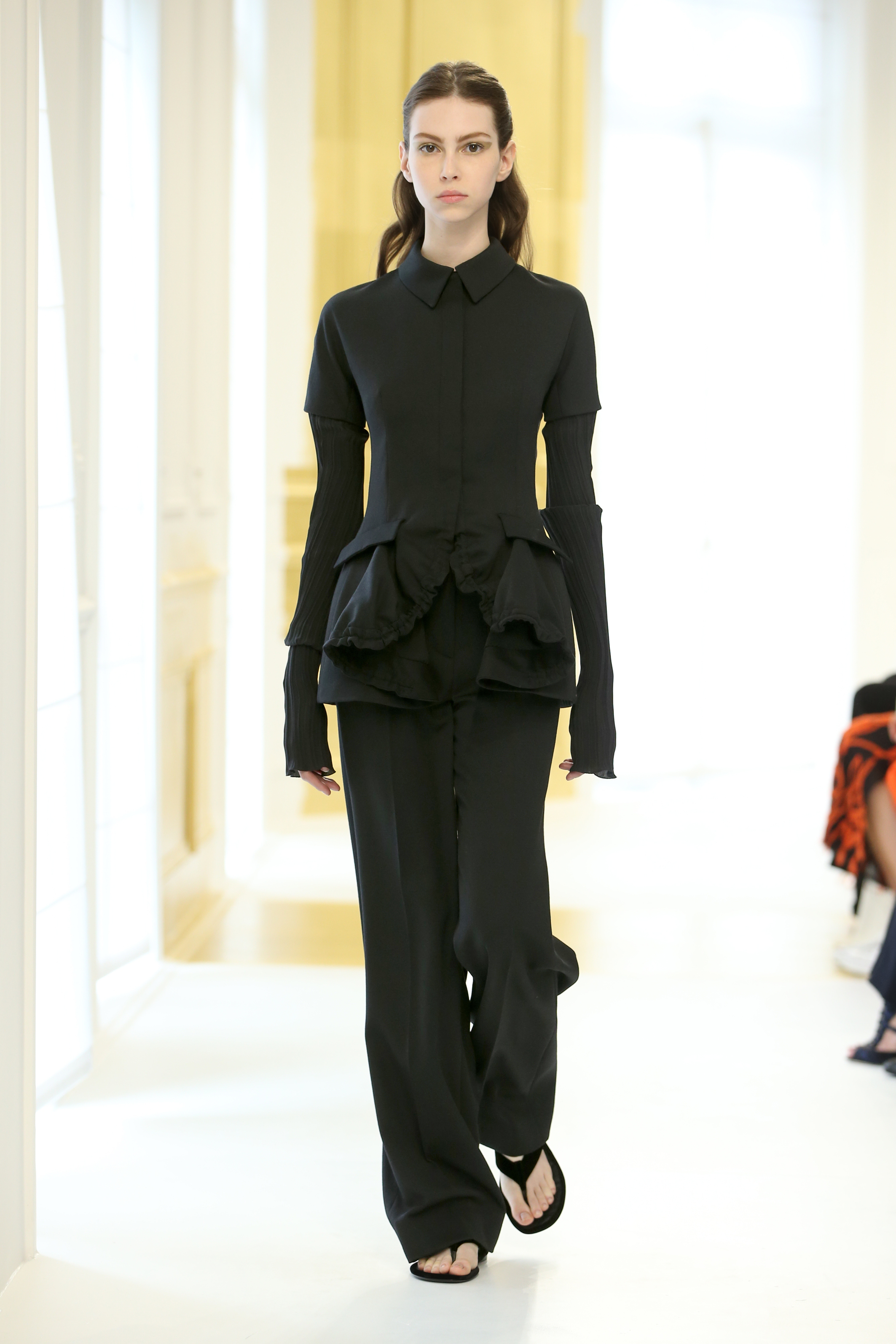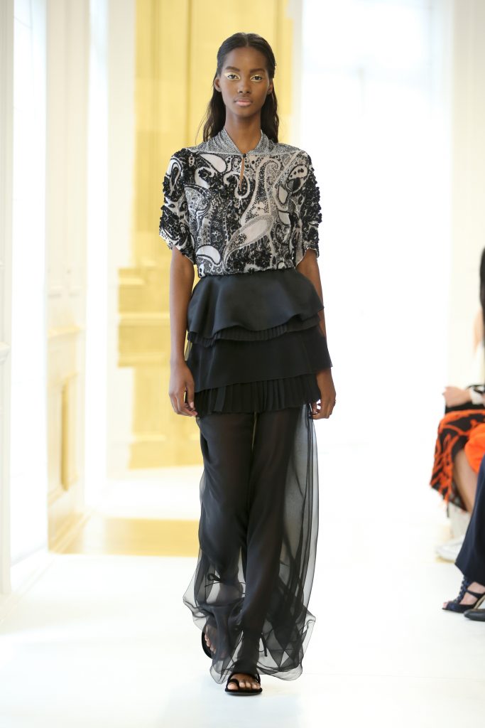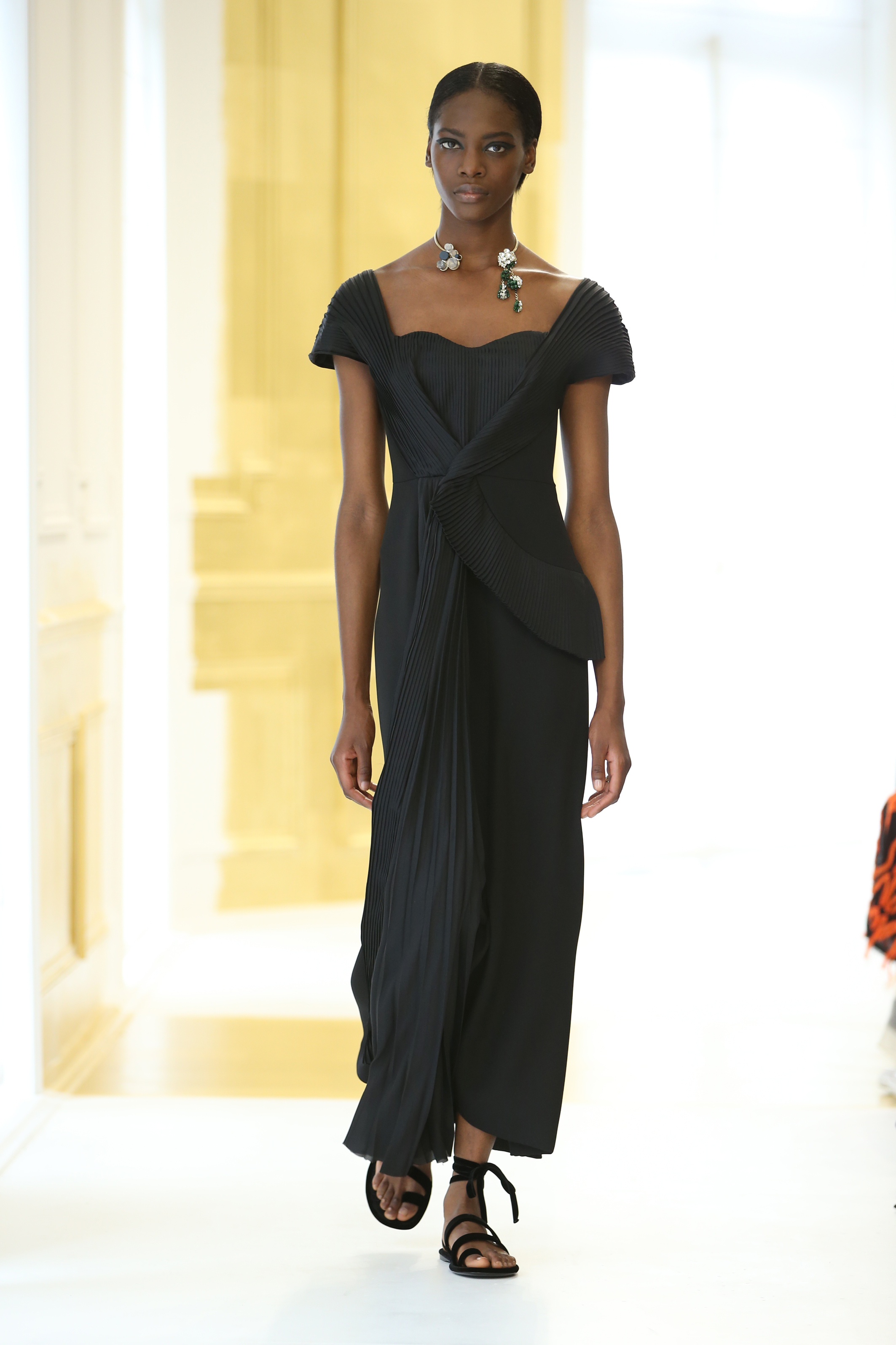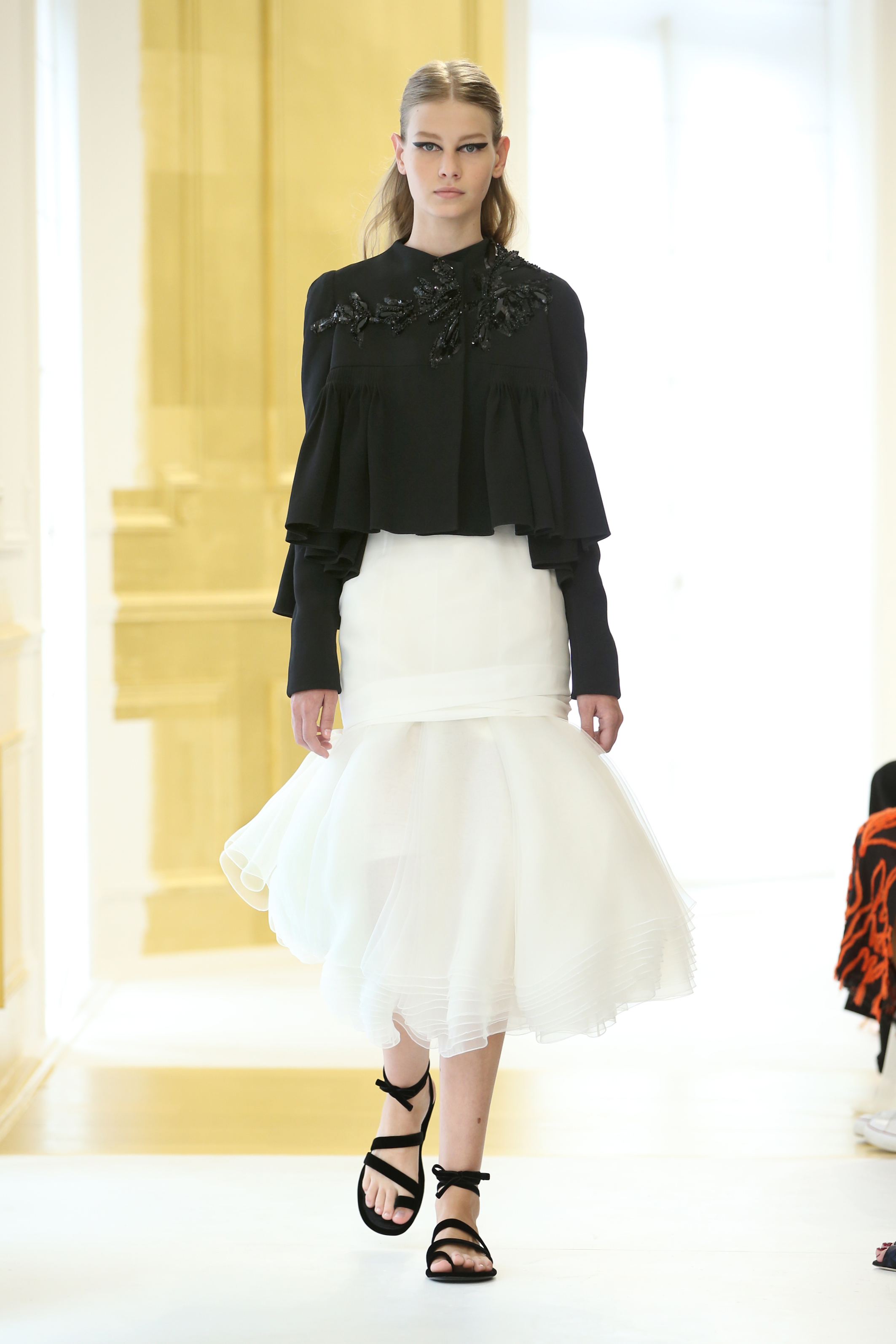 En effet, la structure du Bar est réinterprétée. Lucie Meier et Serge Ruffieux commencent par sa jupe qui donne ici naissance à des expérimentations sur les plissés, drapés dans des robes du soir ou sur des jupes longues. Sa doublure – ses épaisseurs d’organza qui lui donnent corps – devient un vêtement à part entière comme si le modèle originel était vu aux rayons X. Les volumes couture du New Look deviennent plus légers, plus contemporains : c’est tout l’esprit de l’atelier ou exprimé par l’atelier tailleur. La veste elle-même est déconstruite, allongée aux basques ou basculée à la verticale, et apporte ainsi de l’animation et du mouvement, un nouveau look et un esprit Dior.