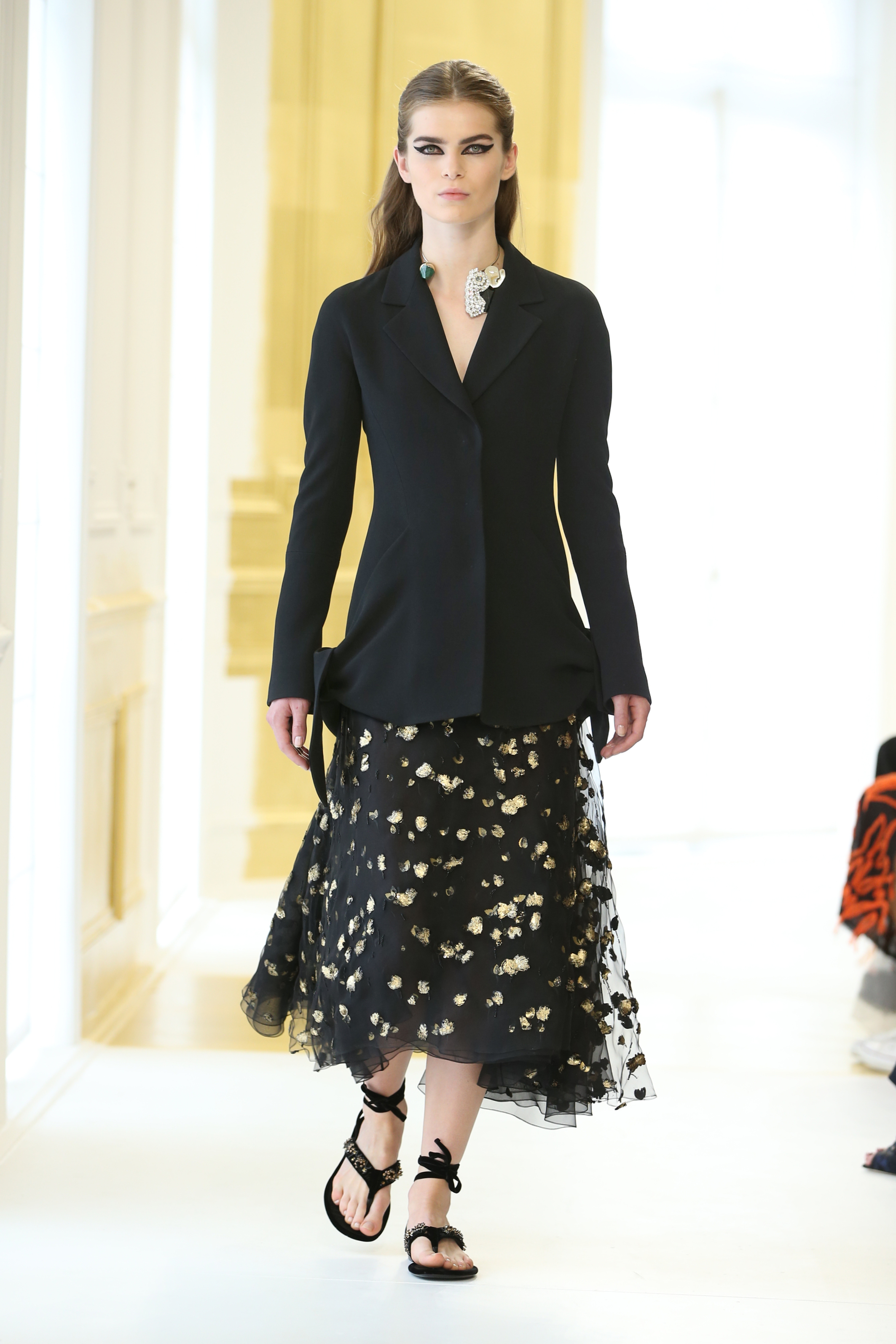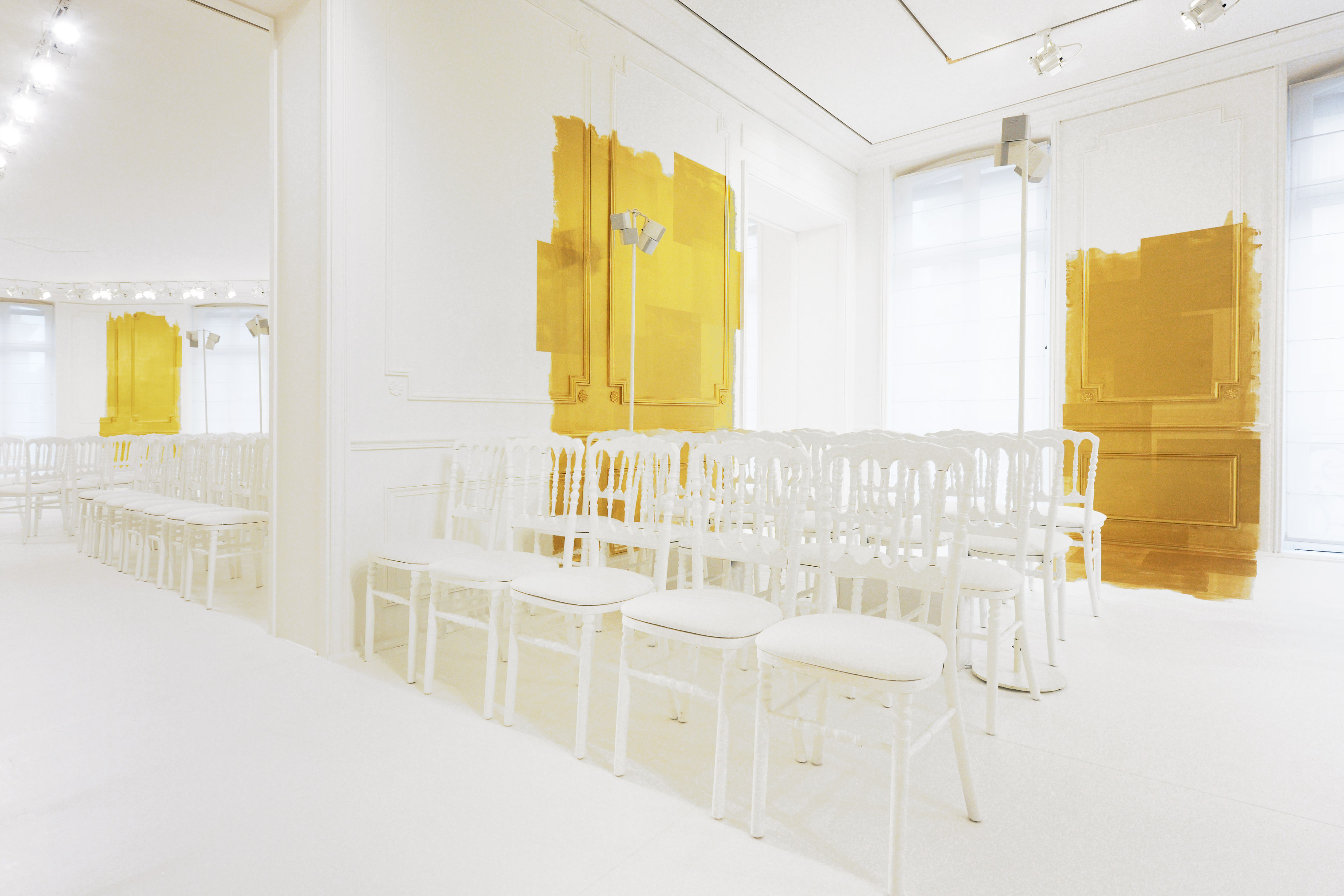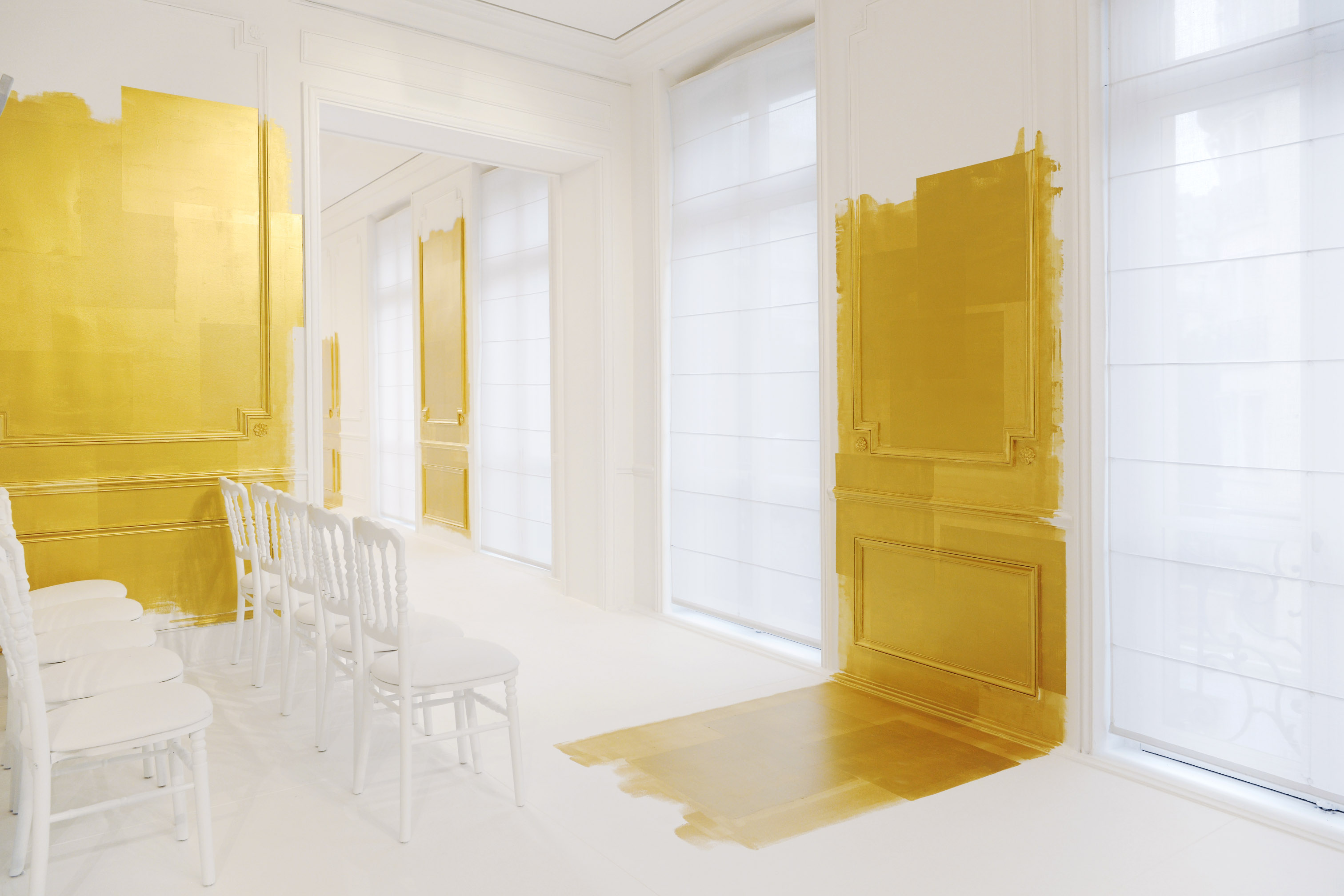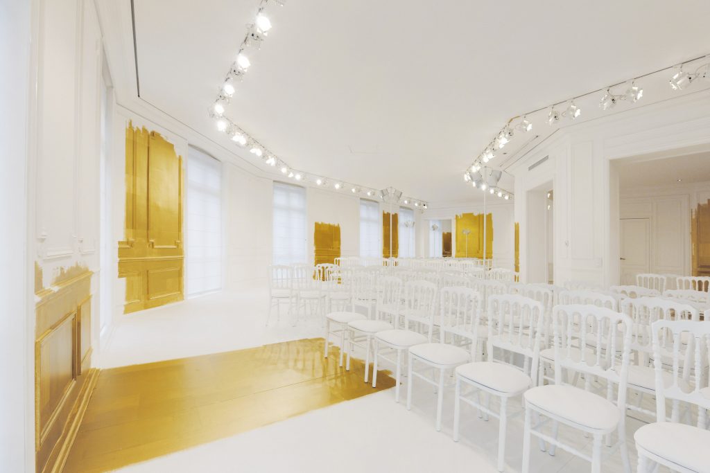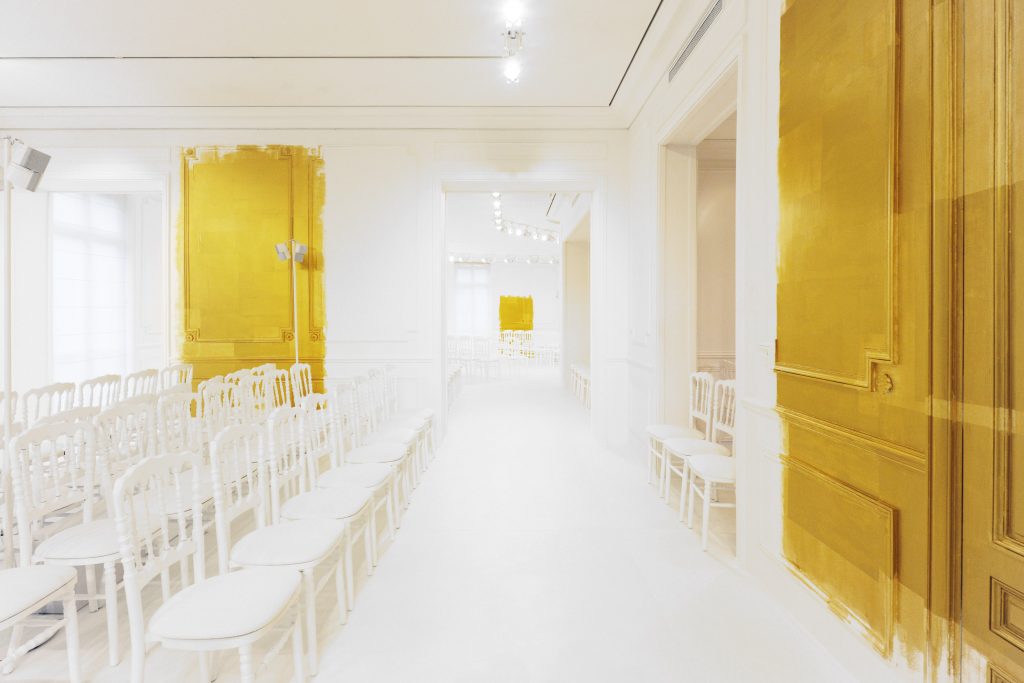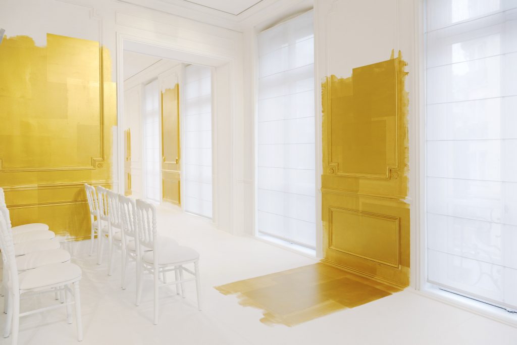 La seule couleur, l’unique ornement, est un or sculpturalement brodé, inspiré du travail de César ou de Claude Lalanne, référence également à l’art brut. Jean Cocteau disait de Dior : « Ce génie léger, propre à notre temps, dont le nom magique comporte Dieu et or. » Cet or accentue la collection, lui apporte de l’emphase, les broderies se portent comme de la joaillerie. Pour l’occasion, les salons Dior eux-mêmes se font précieux, partiellement recouverts de panneaux dorés, tandis que les bijoux de la collection font écho aux formes sculpturales et aux placements asymétriques des broderies.