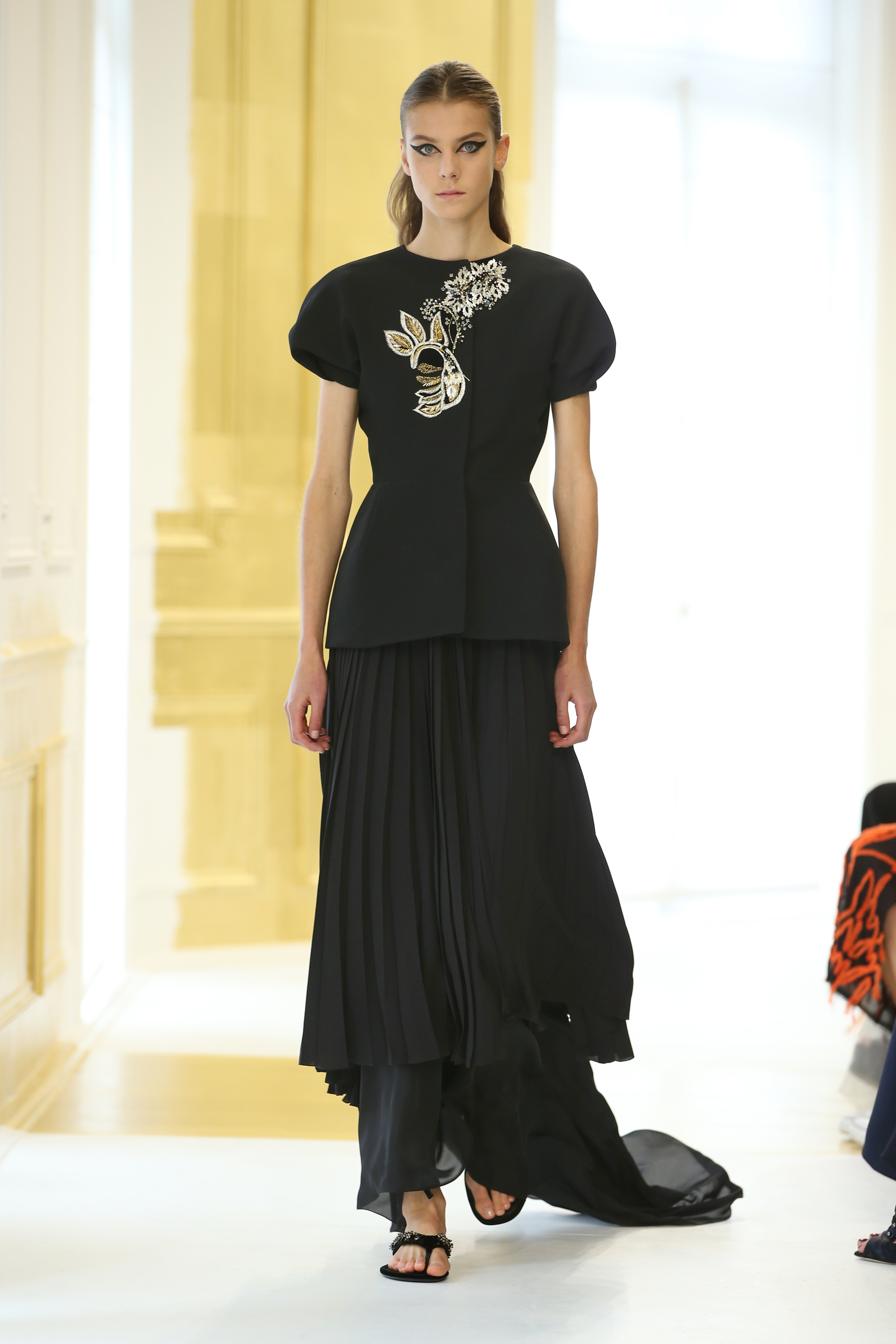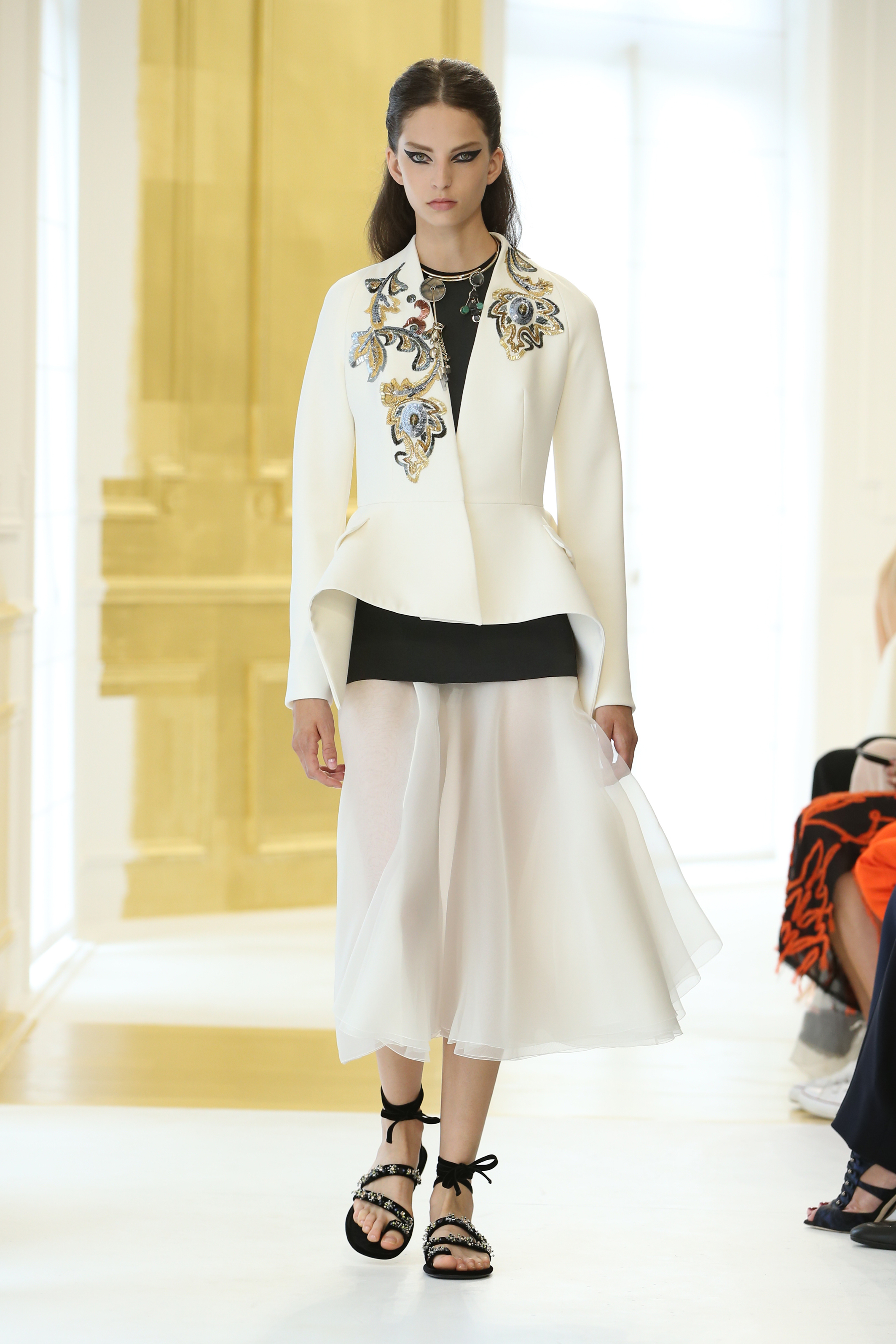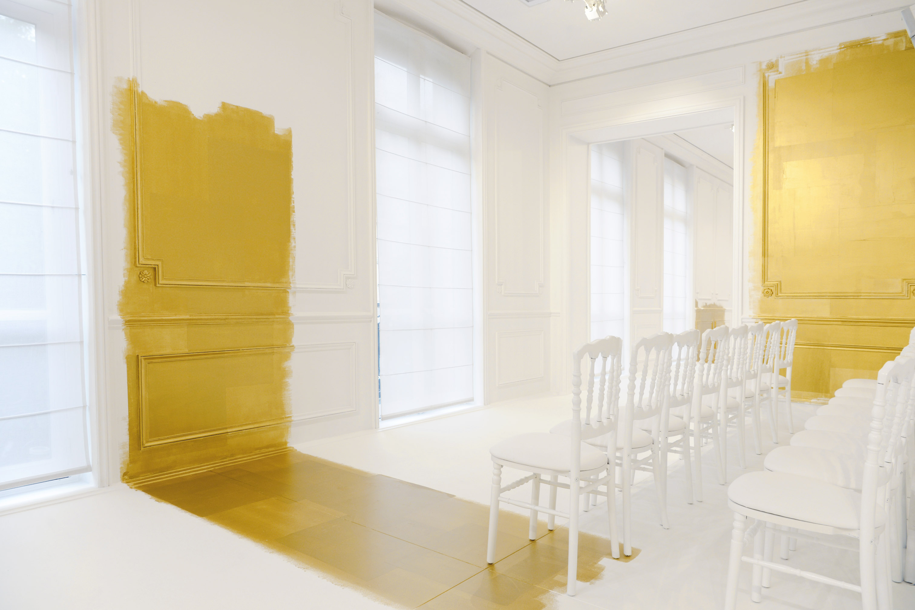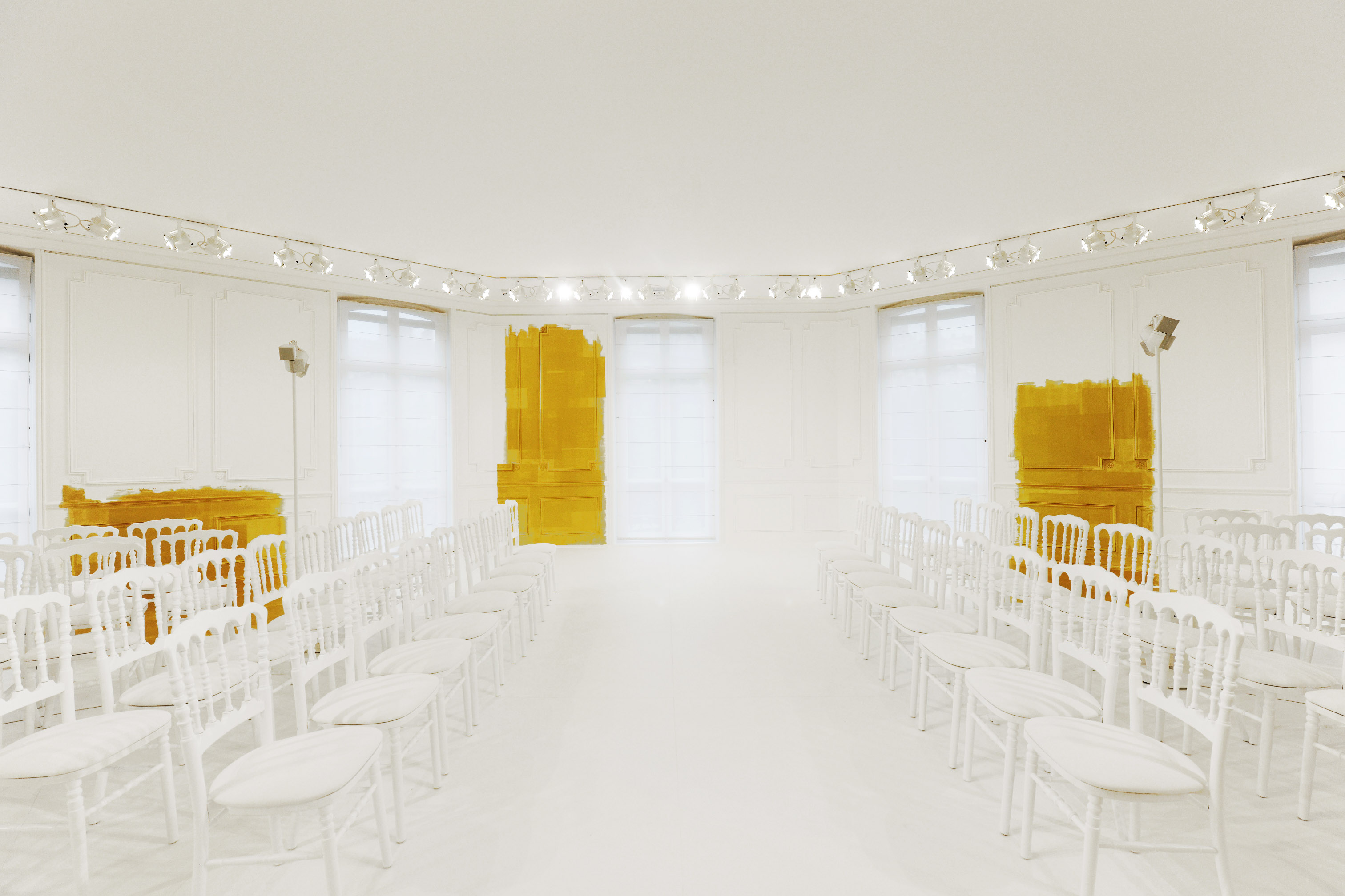 La seule couleur, l’unique ornement, est un or sculpturalement brodé, inspiré du travail de César ou de Claude Lalanne, référence également à l’art brut. Jean Cocteau disait de Dior : « Ce génie léger, propre à notre temps, dont le nom magique comporte Dieu et or. » Cet or accentue la collection, lui apporte de l’emphase, les broderies se portent comme de la joaillerie. Pour l’occasion, les salons Dior eux-mêmes se font précieux, partiellement recouverts de panneaux dorés, tandis que les bijoux de la collection font écho aux formes sculpturales et aux placements asymétriques des broderies.