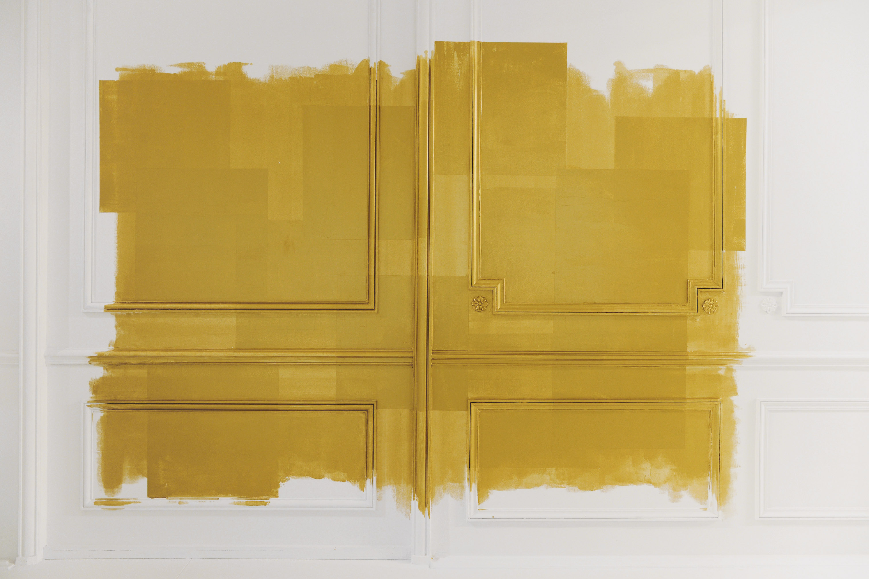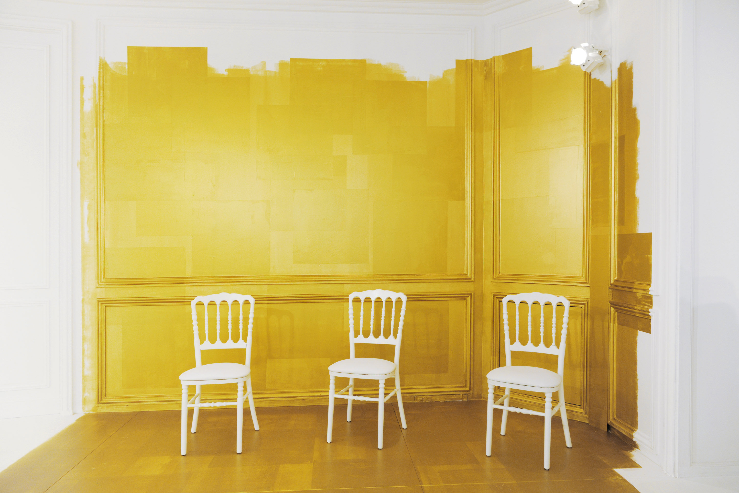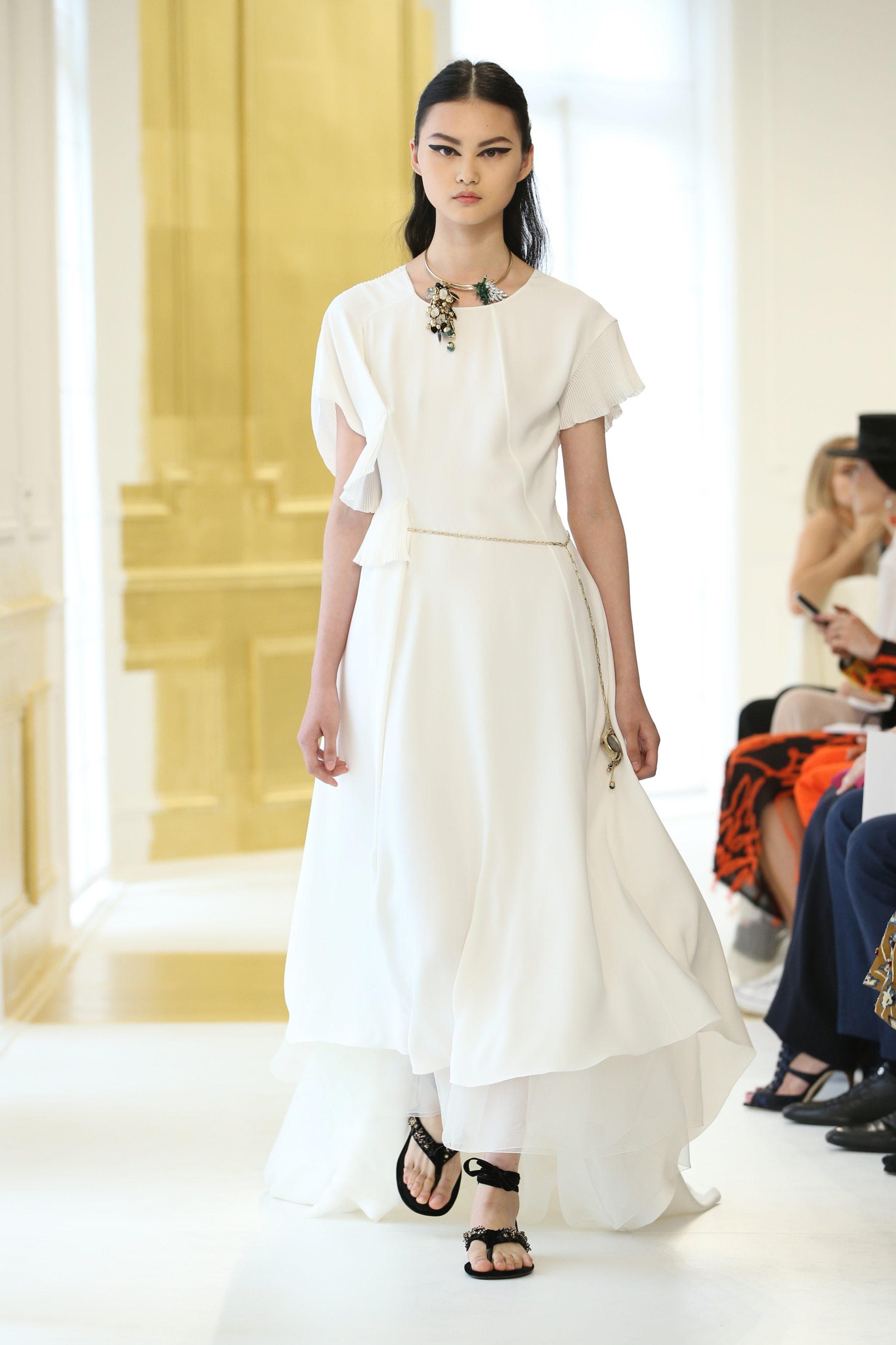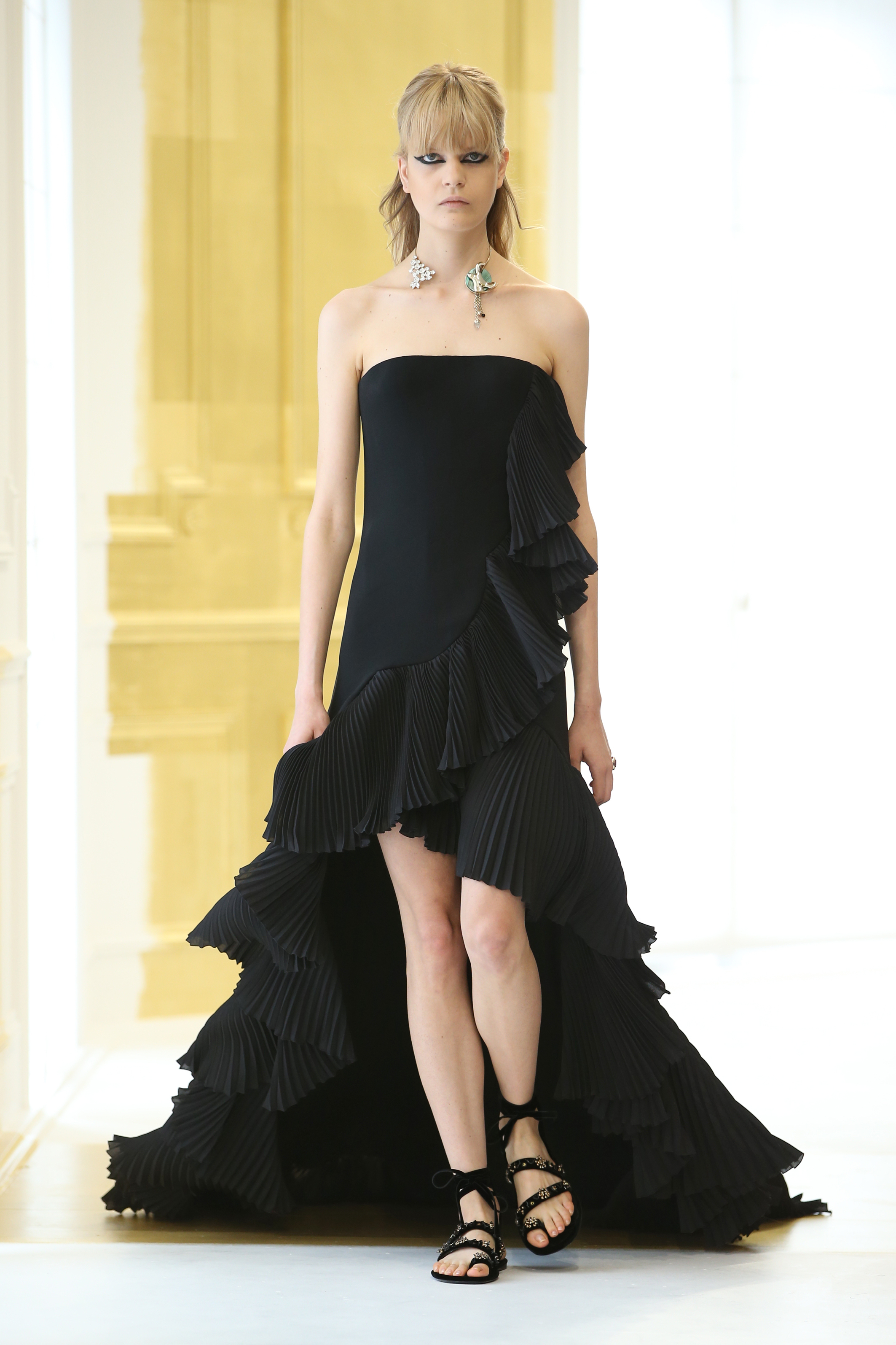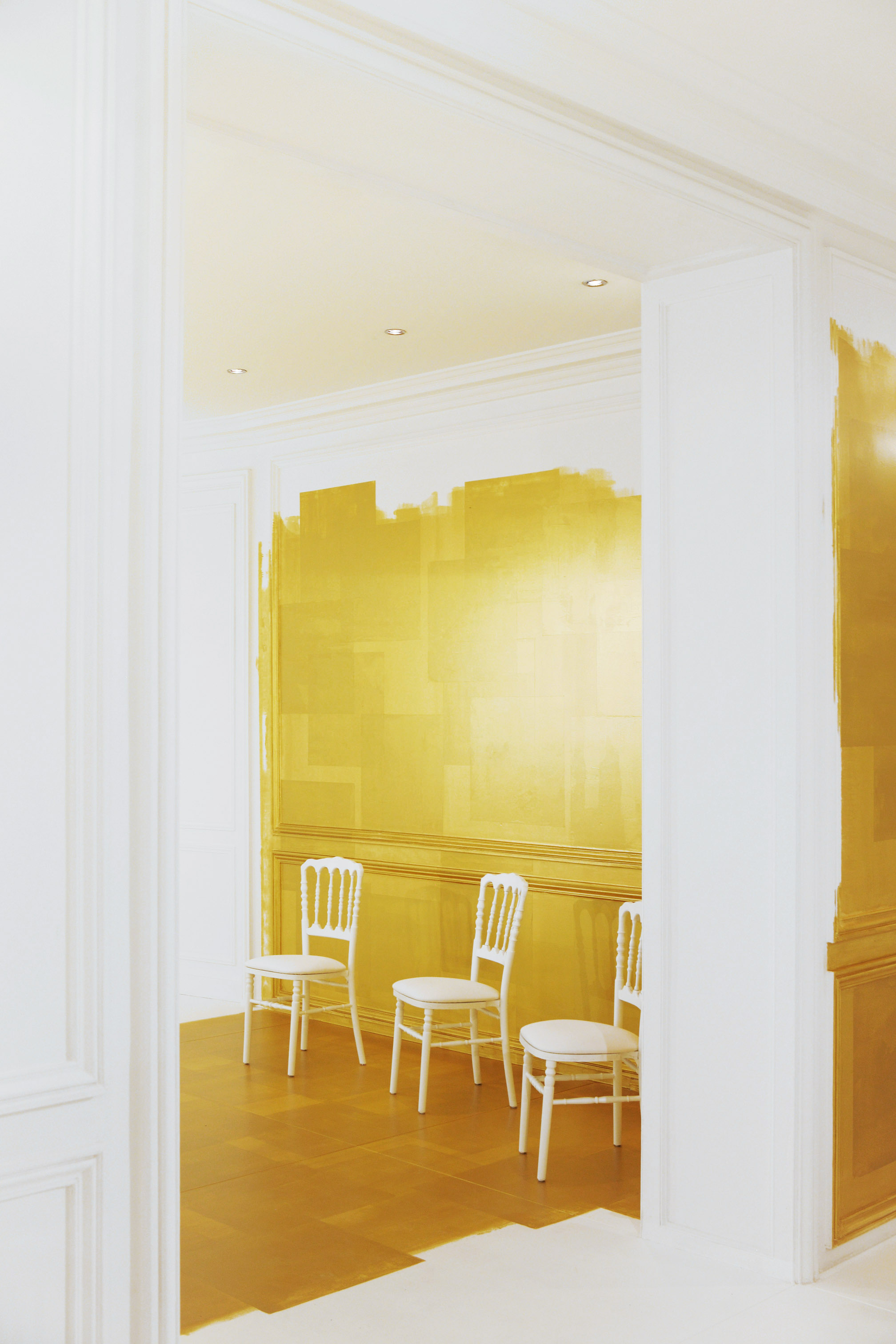 La seule couleur, l’unique ornement, est un or sculpturalement brodé, inspiré du travail de César ou de Claude Lalanne, référence également à l’art brut. Jean Cocteau disait de Dior : « Ce génie léger, propre à notre temps, dont le nom magique comporte Dieu et or. » Cet or accentue la collection, lui apporte de l’emphase, les broderies se portent comme de la joaillerie. Pour l’occasion, les salons Dior eux-mêmes se font précieux, partiellement recouverts de panneaux dorés, tandis que les bijoux de la collection font écho aux formes sculpturales et aux placements asymétriques des broderies.