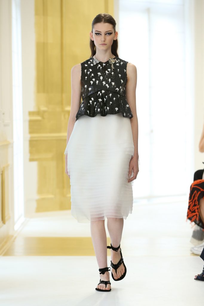 Monsieur Dior lui-même adorait la juxtaposition des deux. « Le blanc, disait-il, est simple, pur et il va avec tout. » Et de déclarer ailleurs : « Je pourrais écrire un livre entier à propos du noir. » De ces citations couture naît une palette noir et blanc qui court des matières aux imprimés, comme si une photographie de Horst ou Penn prenait vie. Tel un tableau de Picasso, lorsqu’il refusait la couleur pour se concentrer sur la structure, la collection devient une étude de formes et de silhouettes.
