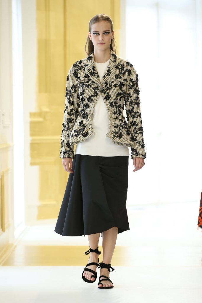 Le tailleur Bar, l’essence de la maison Dior, est la principale inspiration de Lucie Meier et Serge Ruffieux. Comme un cœur qui bat, il ponctue toute la collection. Mais la référence ne se limite pas seulement à sa forme – cette silhouette signature faite d’une veste cintrée comme un sablier et d’une jupe longue – mais plus généralement, elle joue de tous les aspects du Bar. Et c’est ainsi sa palette originelle, un noir et blanc brillamment contrastant, qui colore l’ensemble de cette collection.