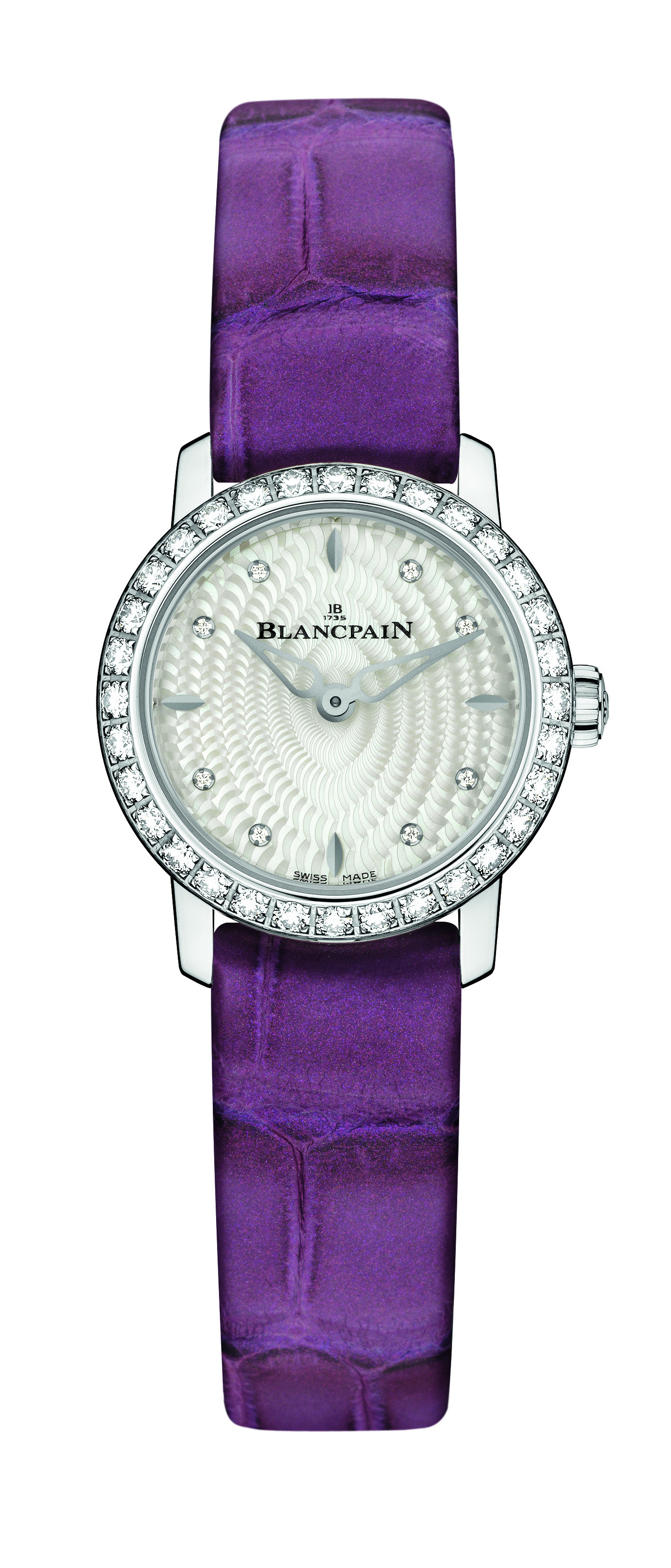 Son bracelet est réalisé uniquement à partir des petites écailles contenues sur l’alligator de Louisiane a n d’obtenir un aspect esthétique tout en nesse. Sa lunette est sertie de 32 diamants tandis que son cadran en contient 8. Les aiguilles arborent des formes de gouttes et la boîte est réalisée en or blanc. Le fond saphir de la montre laisse apparaître sa masse, délicatement décorée d’un diamant.