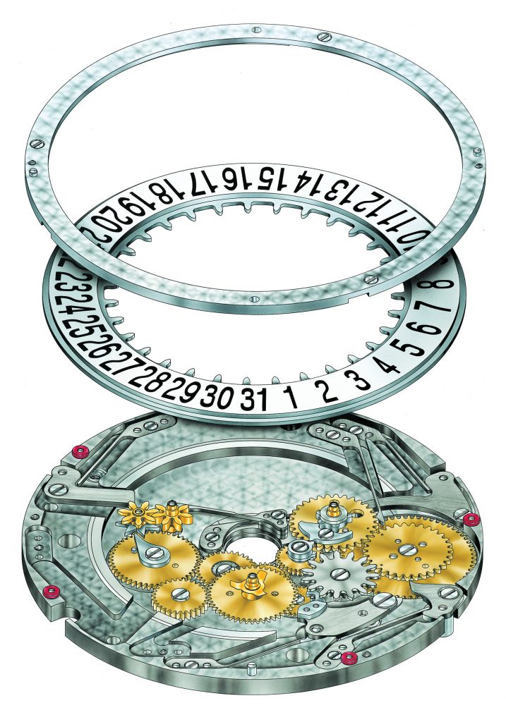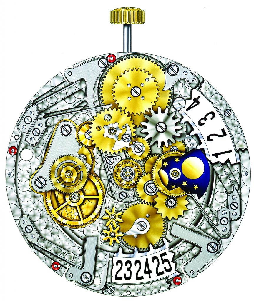 Le cadran présente également des éléments connus, mais subtilement retravaillés et combinés de manière novatrice. Le jour et le mois apparaissent dans un double guichet en ligne sous les 12h, la date dans un grand guichet à 6h. L’équilibre visuel est assuré par le cadran auxiliaire des 24 heures, avec indication des phases de lune, occupant la moitié inférieure.