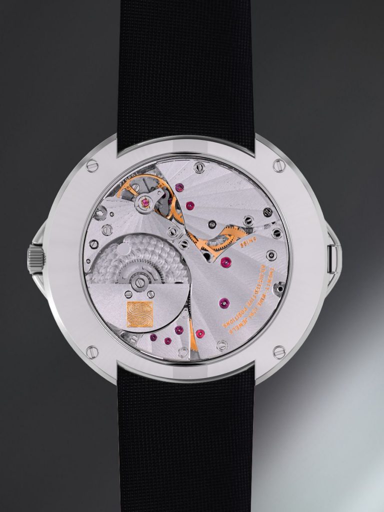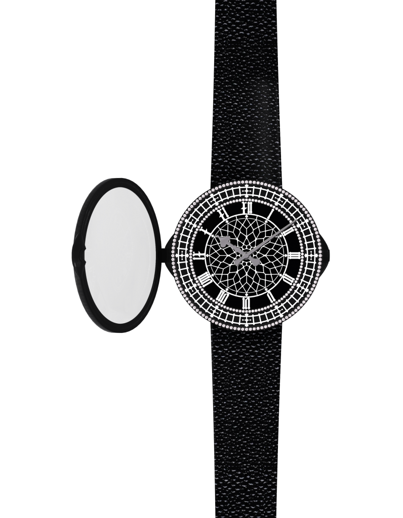 Cette montre Swiss Made, disponible en Titanium Noir, Or rose, et or blanc. Montre avec couvercle en or blanc, or 5N ou titane traité PVD selon les modèles, mouvement mécanique à remontage automatique micro rotor. Cadran onyx et boucle déployante.