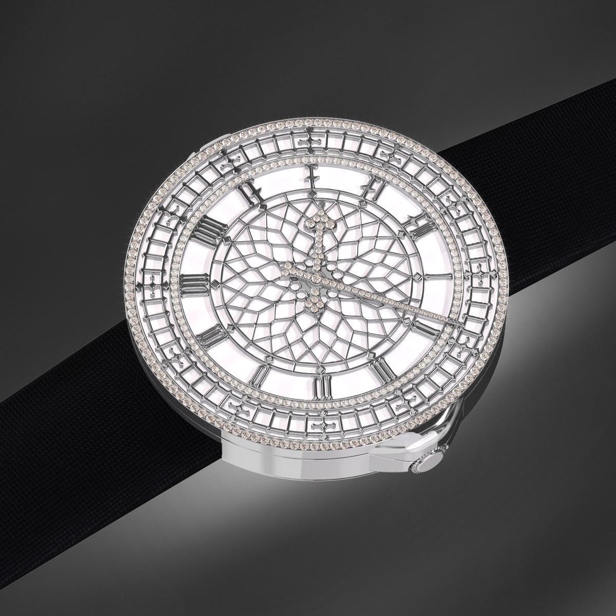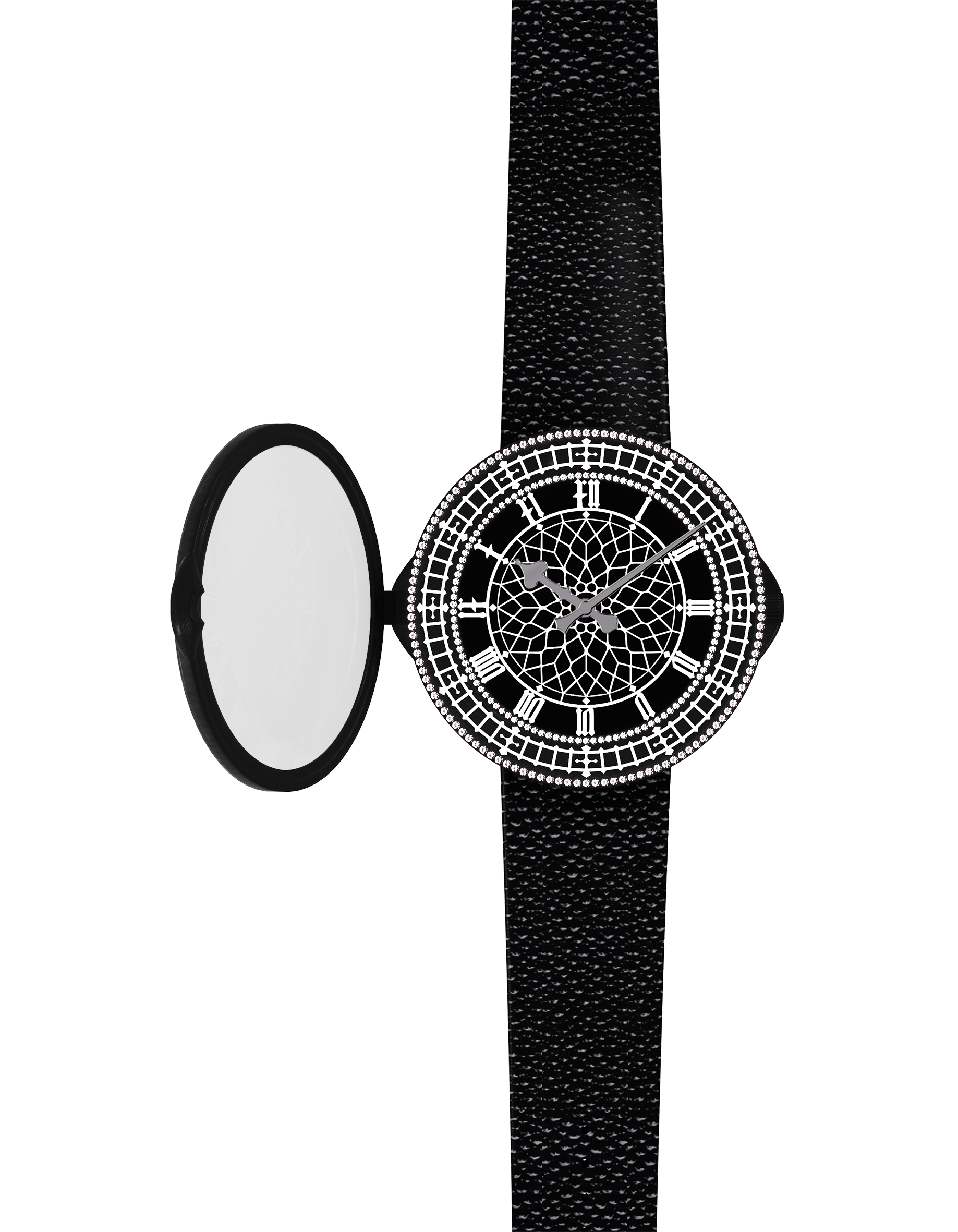 Cette montre Swiss Made, disponible en Titanium Noir, Or rose, et or blanc. Montre avec couvercle en or blanc, or 5N ou titane traité PVD selon les modèles, mouvement mécanique à remontage automatique micro rotor. Cadran onyx et boucle déployante.