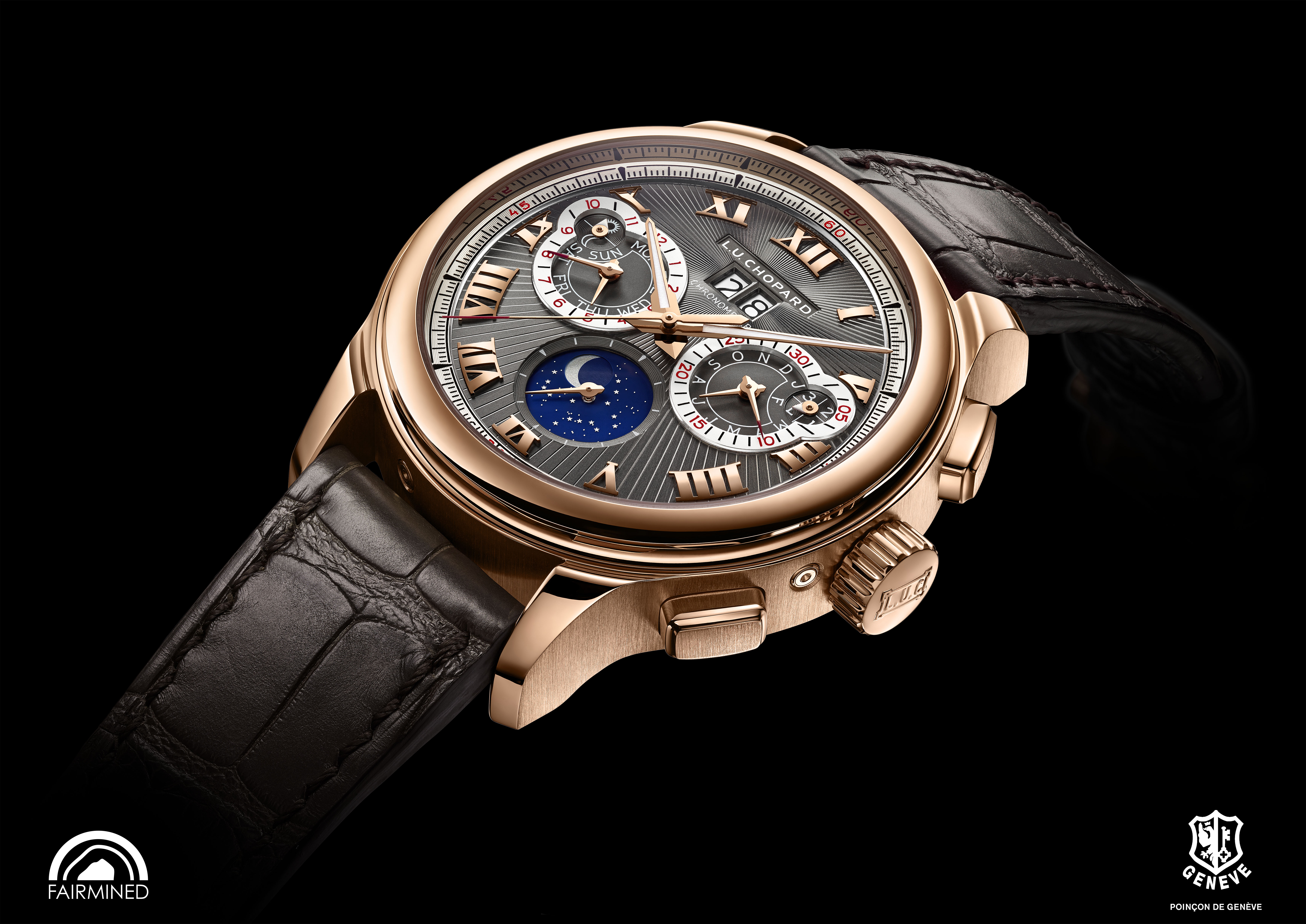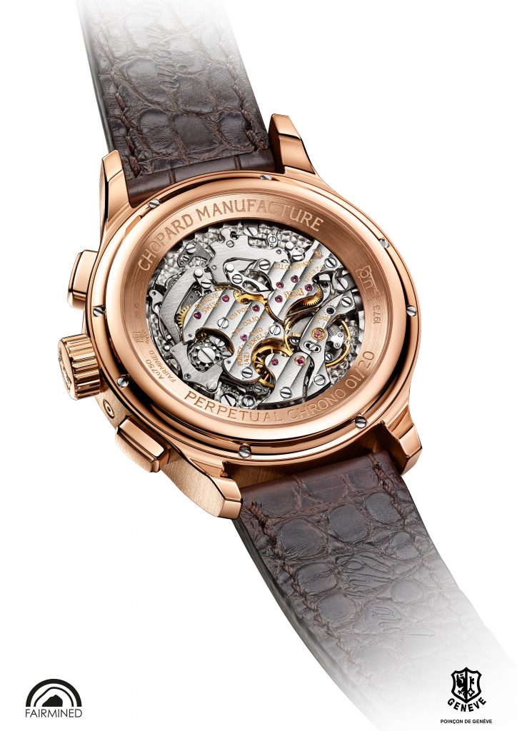 Le boîtier de 45 mm de la L.U.C Perpetual Chrono est entièrement façonné dans un or « Fairmined » 18 carats. Il provient de coopératives minières certifiées « Fairmined » de Colombie, du Pérou et de Bolivie.