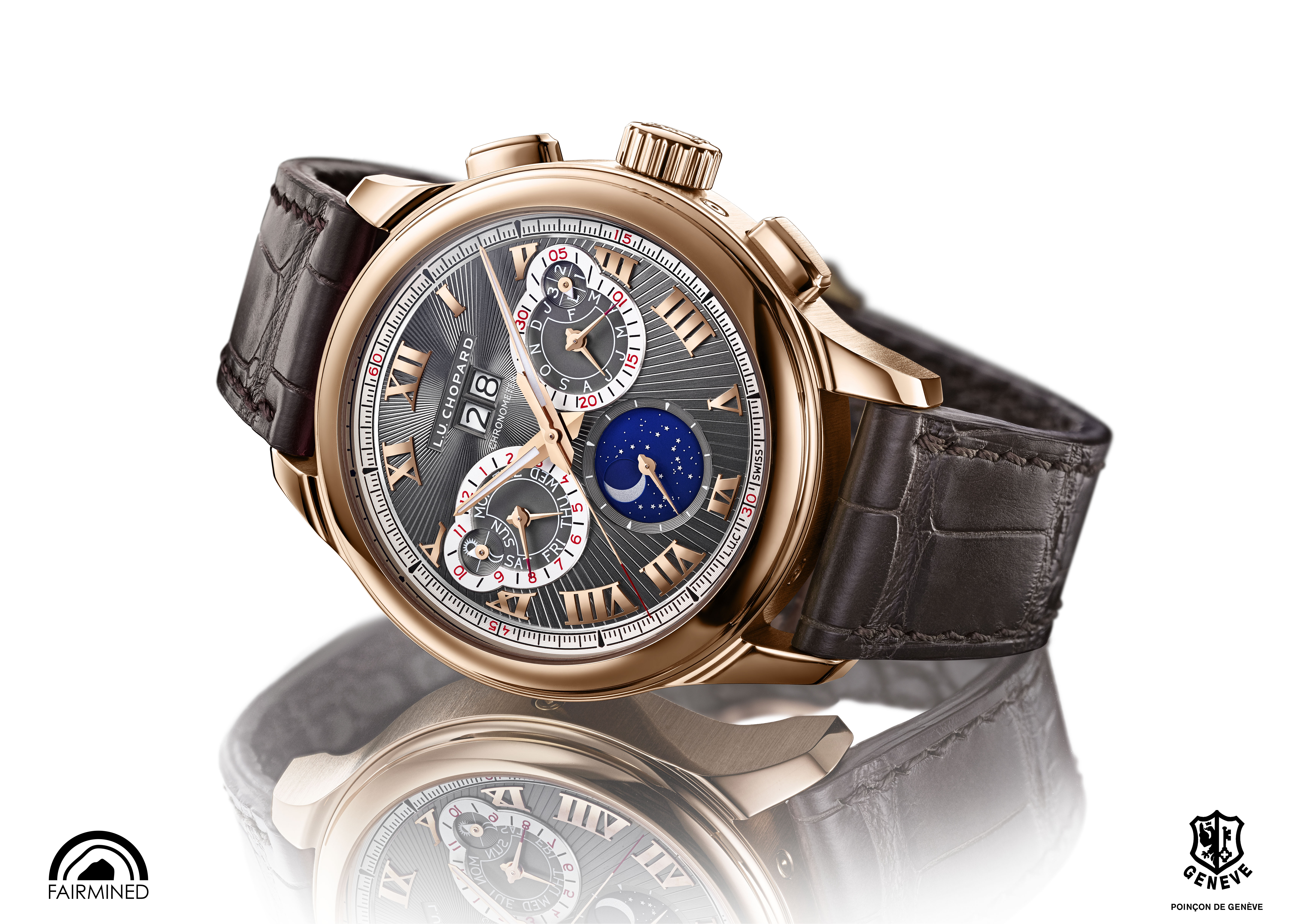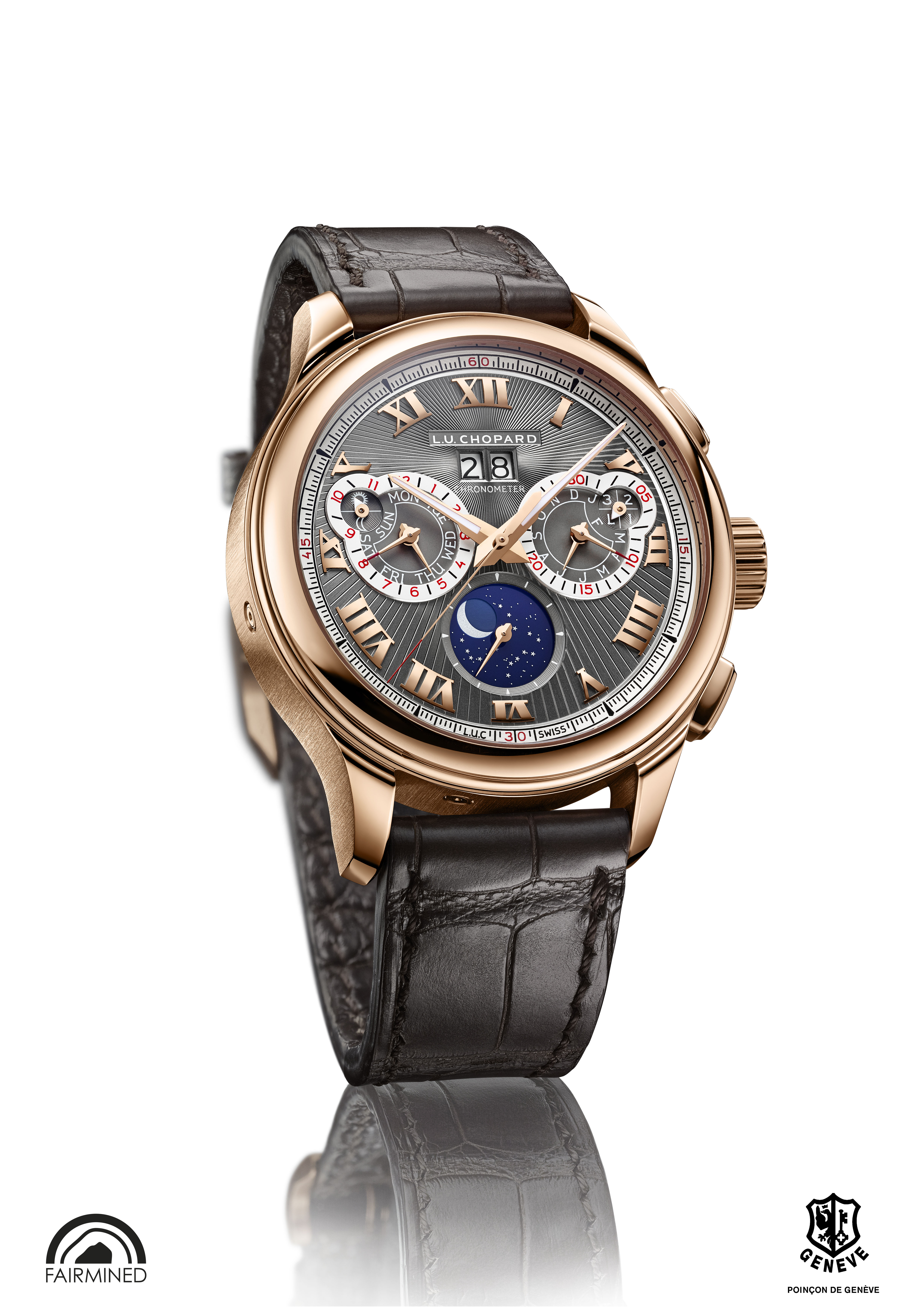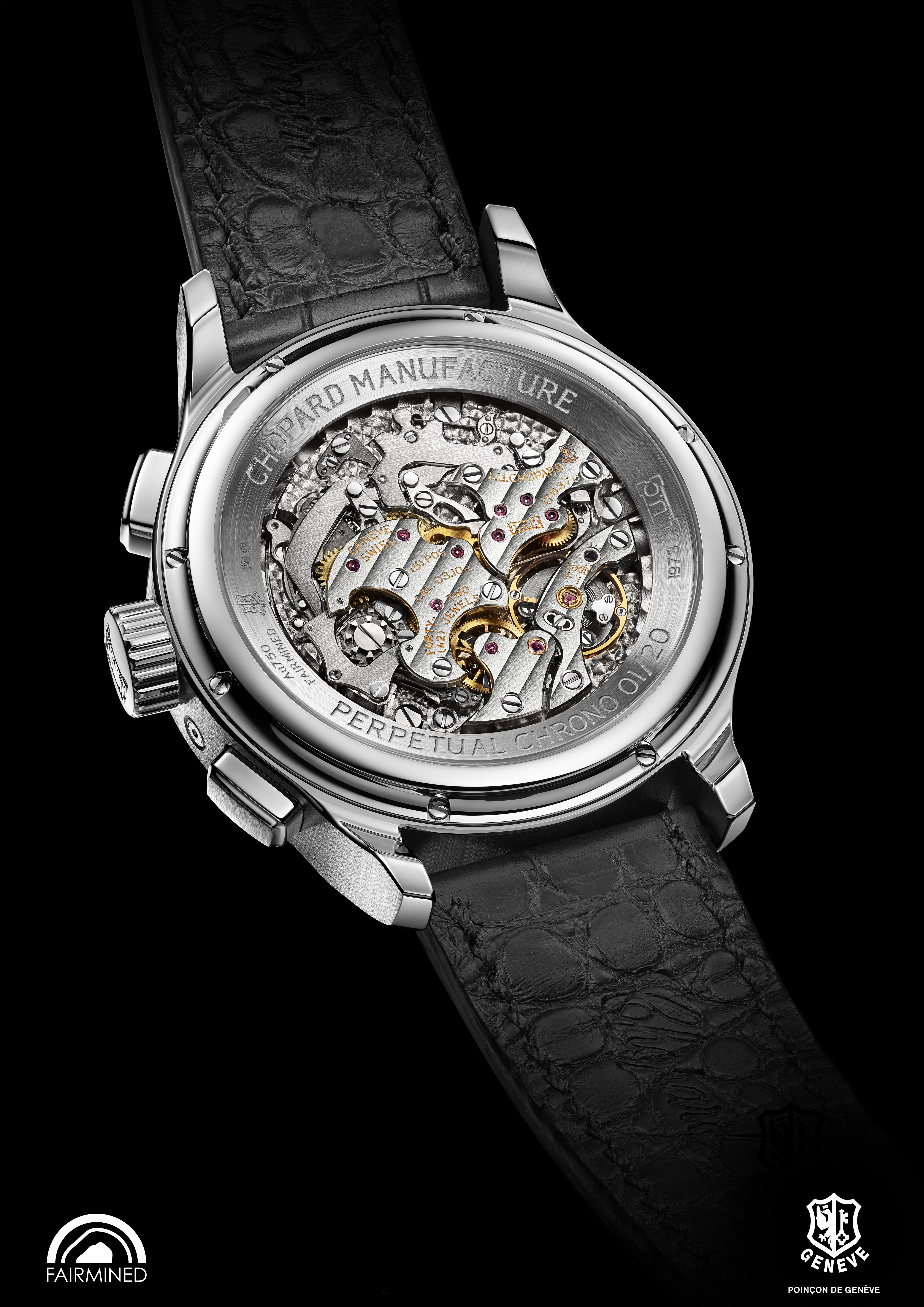 La L.U.C Perpetual Chrono bénéficie d’une double certification. La précision de la marche de son calibre L.U.C 03.10-L a été certifiée par le Contrôle Officiel Suisse des Chronomètres, le COSC. En parallèle, chacune de ces montres en or « Fairmined », leurs mouvements, leurs boîtes, ont été soumis avec succès aux critères d’évaluation du Poinçon de Genève. Distinction d’excellence, il perpétue la tradition des maîtres horlogers genevois. Il est une garantie émérite de bienfacture du plus haut niveau et de savoir-faire. Précédemment attribué au mouvement, le Poinçon de Genève met aujourd’hui la montre à l’épreuve dans son intégralité. Aux critères de qualité du mouvement s’ajoutent des exigences que Chopard satisfait sans réserve. L’étanchéité, la précision, les fonctions chronographe, et de quantième perpétuel ainsi que la réserve de marche sont évalués avec soin afin d’arborer le fameux poinçon. Chopard appartient avec fierté au cercle restreint des maisons de Haute Horlogerie qui justifient d’un savoir-faire artisanal d’exception.