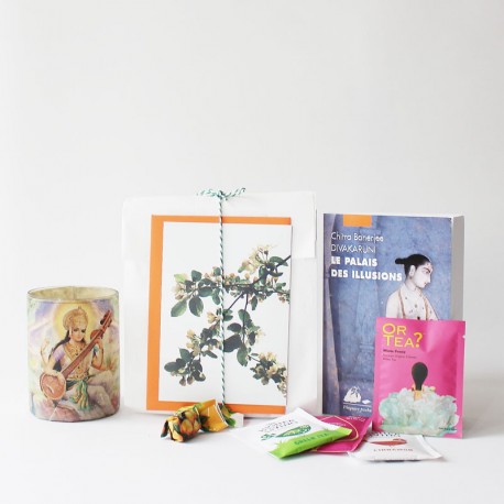 Une thématique précise est proposée chaque mois. Chaque élément du coffret s’en réfère. La Princesse, ses 5 maris, la guerre et les Dieux, met en exergue le Palais des Illusions écrit par Chitra Banerjee DivaKaruni.
