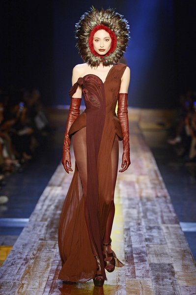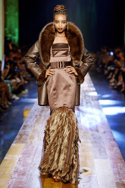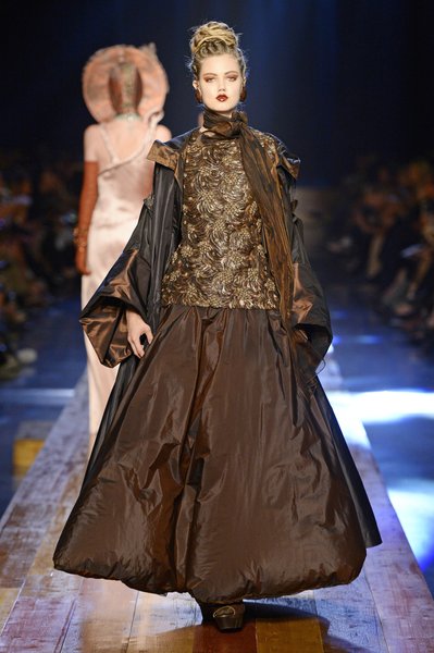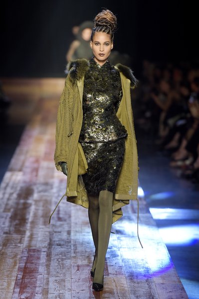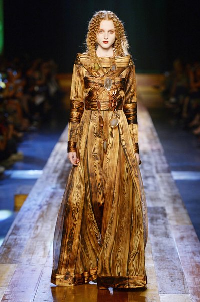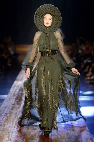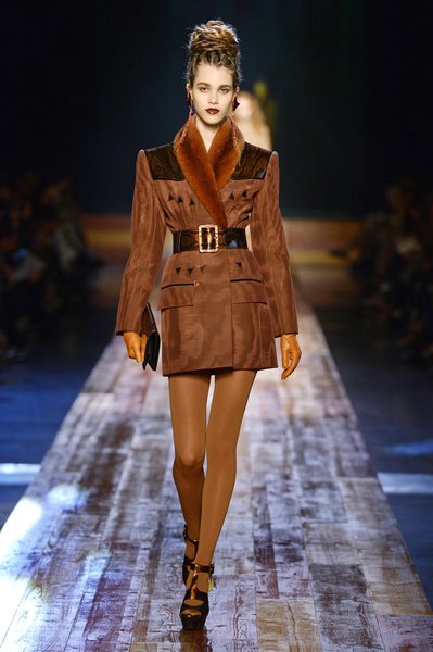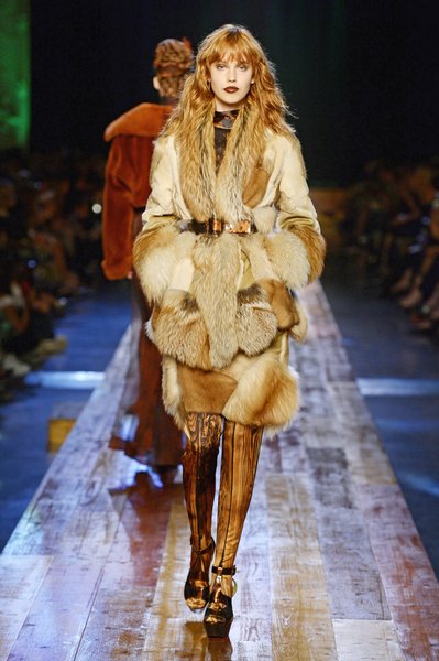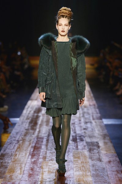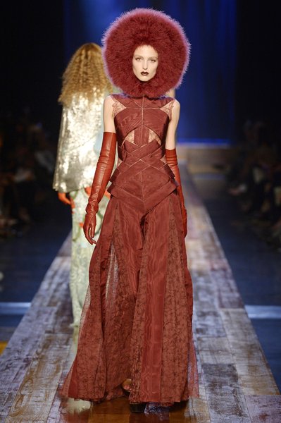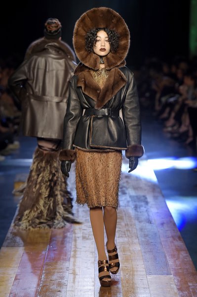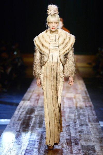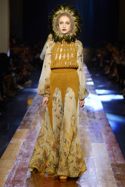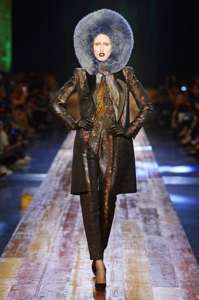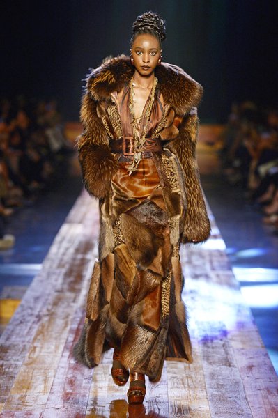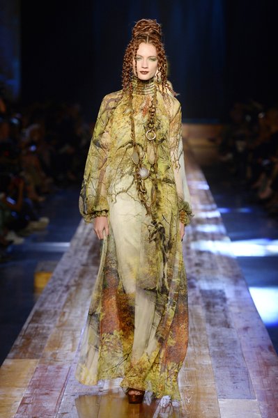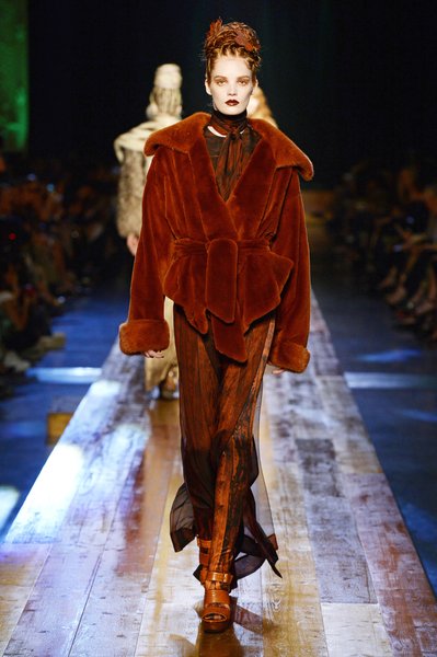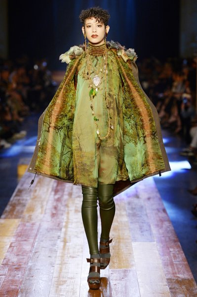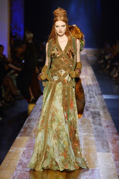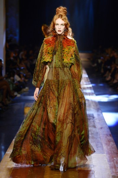 Jean Paul Gaultier a trouvé son inspiration dans la grandeur de la nature et nous invite dans une exploration forestière. Fourrure sauvage, trench ceinturé, combinaison pantalon, robe longue asymétrique, des pièces résolument sauvages, le tout dans des teintes terriennes. L’accessoire à retenir de la collection est le sac à dos géant emmailloté de dentelle et de fourrure de renard.