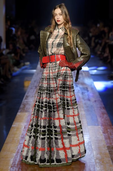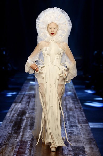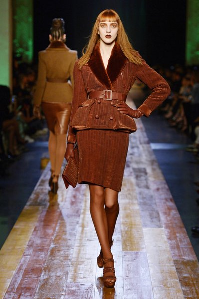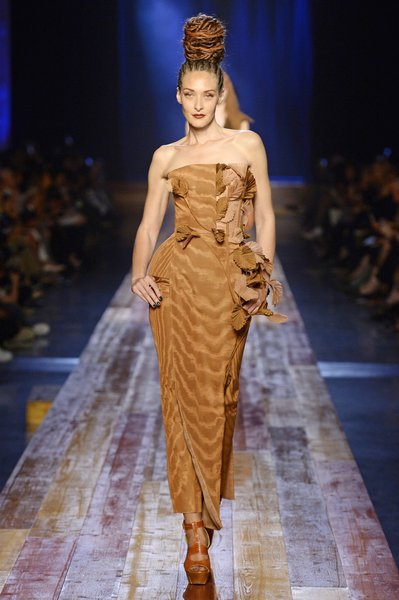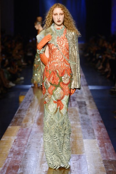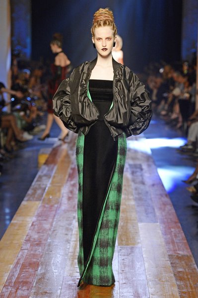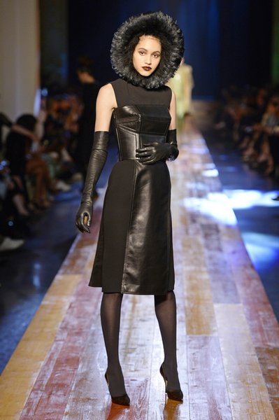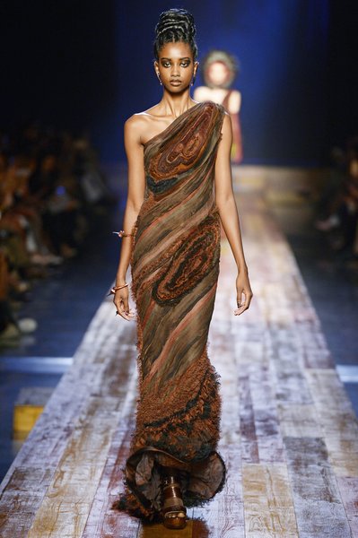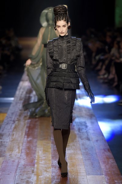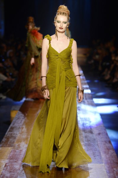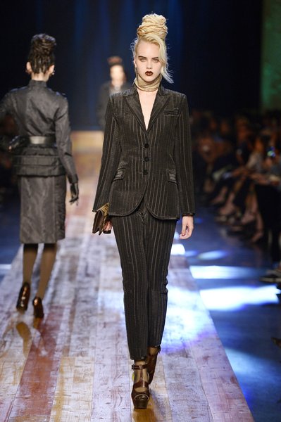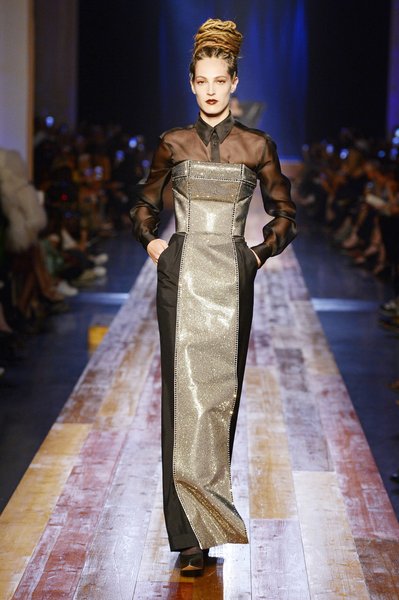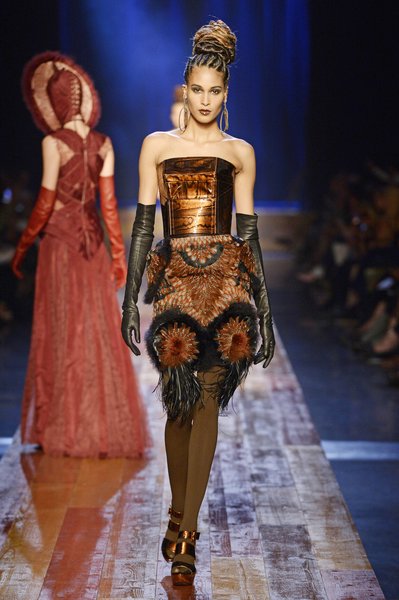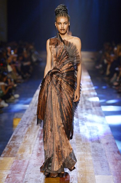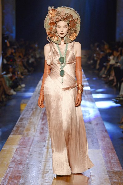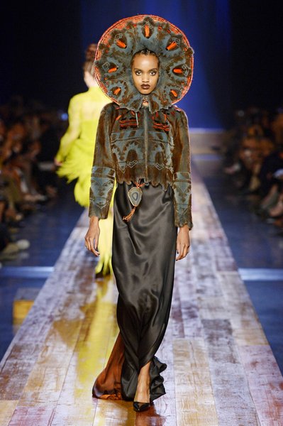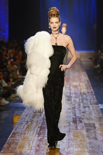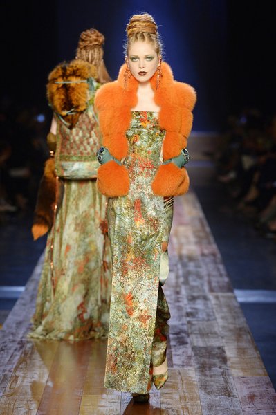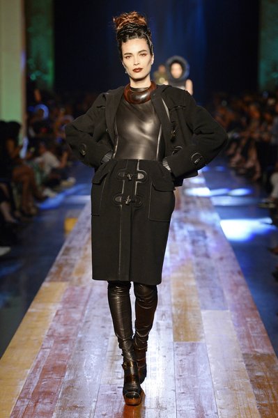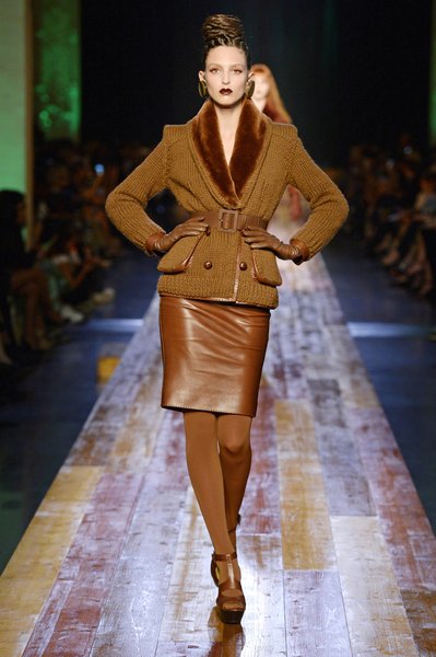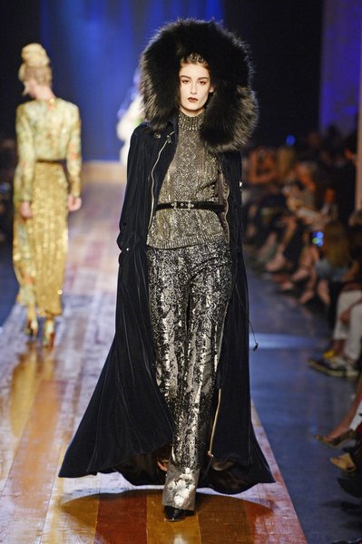 Jean Paul Gaultier a trouvé son inspiration dans la grandeur de la nature et nous invite dans une exploration forestière. Fourrure sauvage, trench ceinturé, combinaison pantalon, robe longue asymétrique, des pièces résolument sauvages, le tout dans des teintes terriennes. L’accessoire à retenir de la collection est le sac à dos géant emmailloté de dentelle et de fourrure de renard.