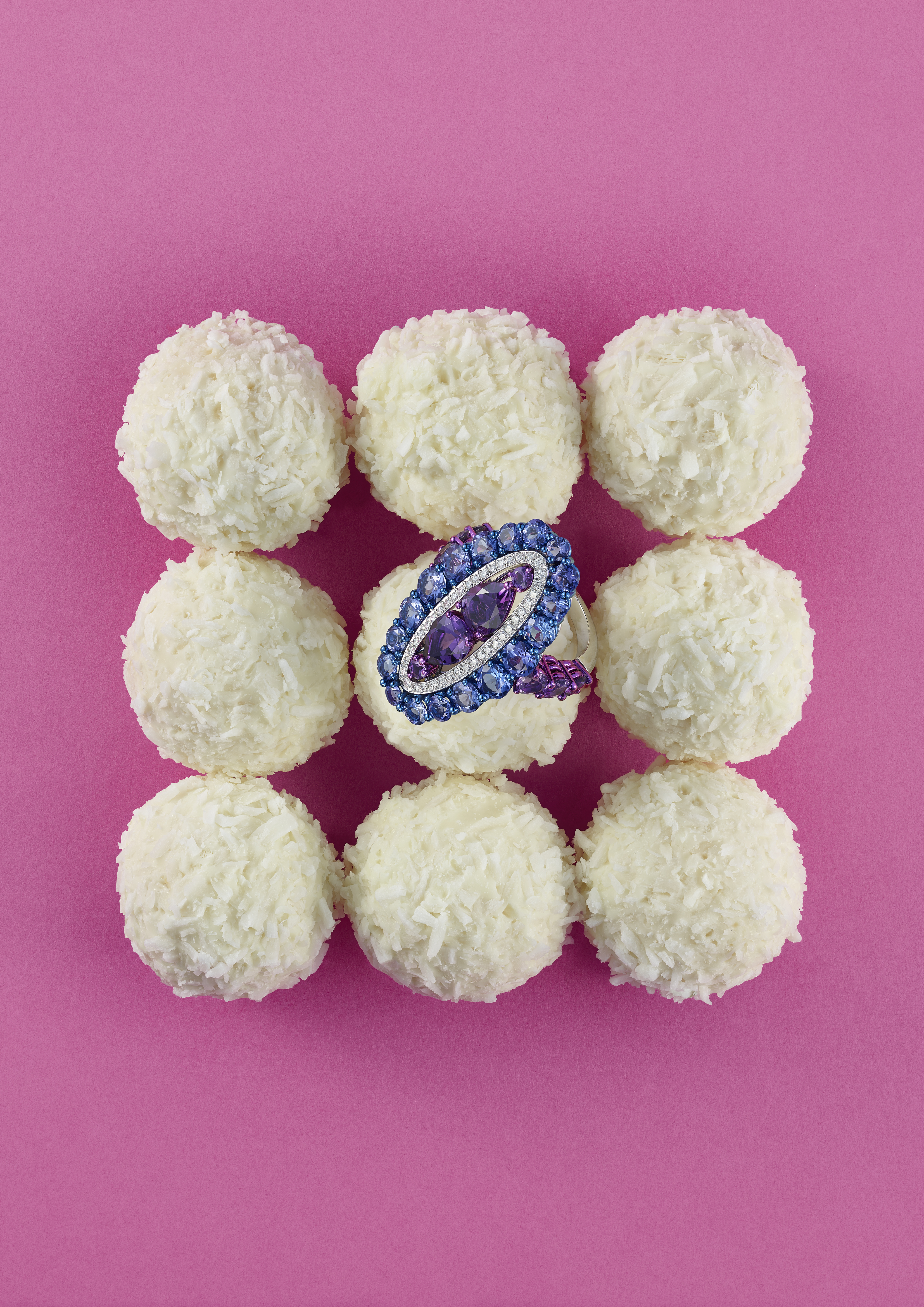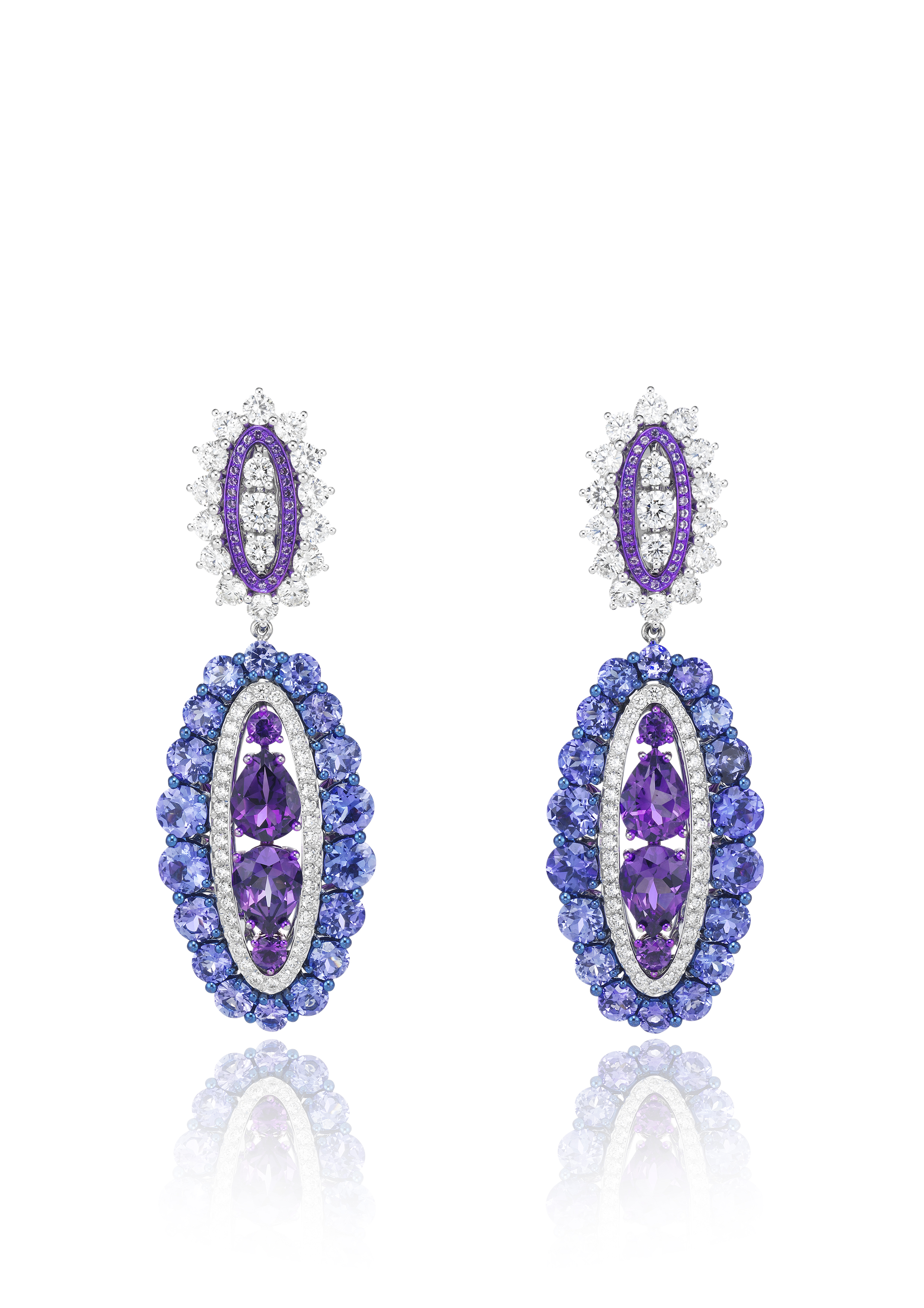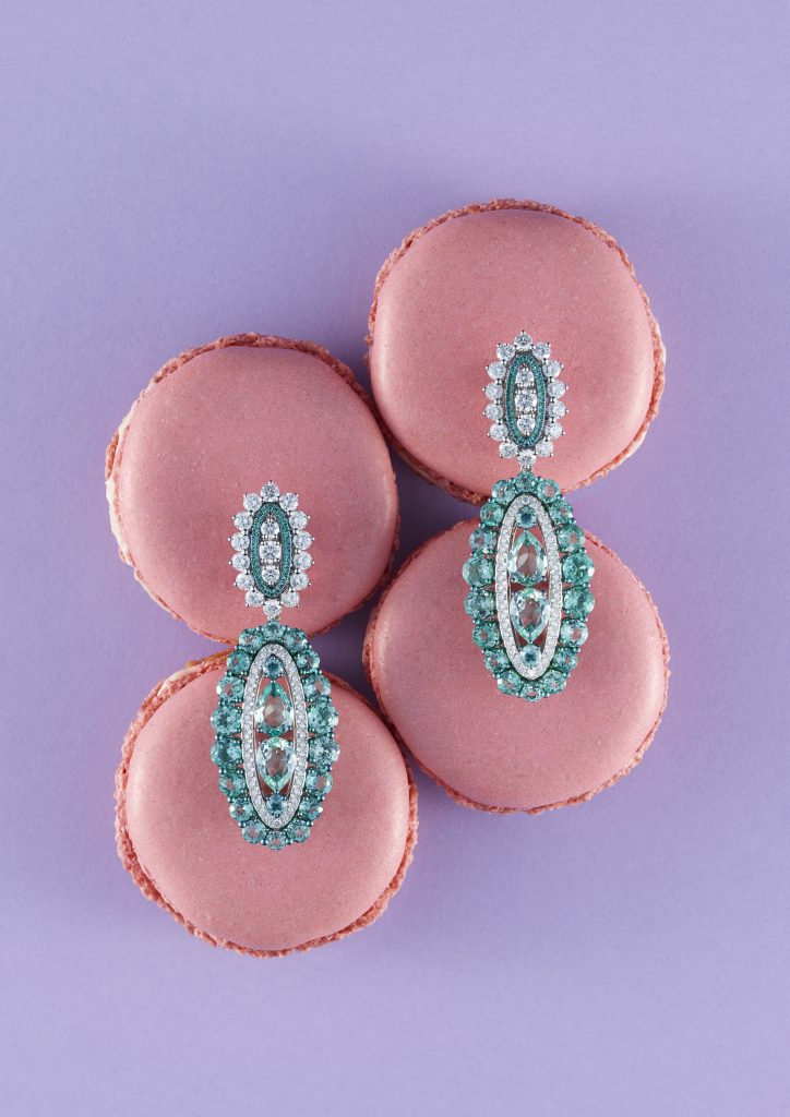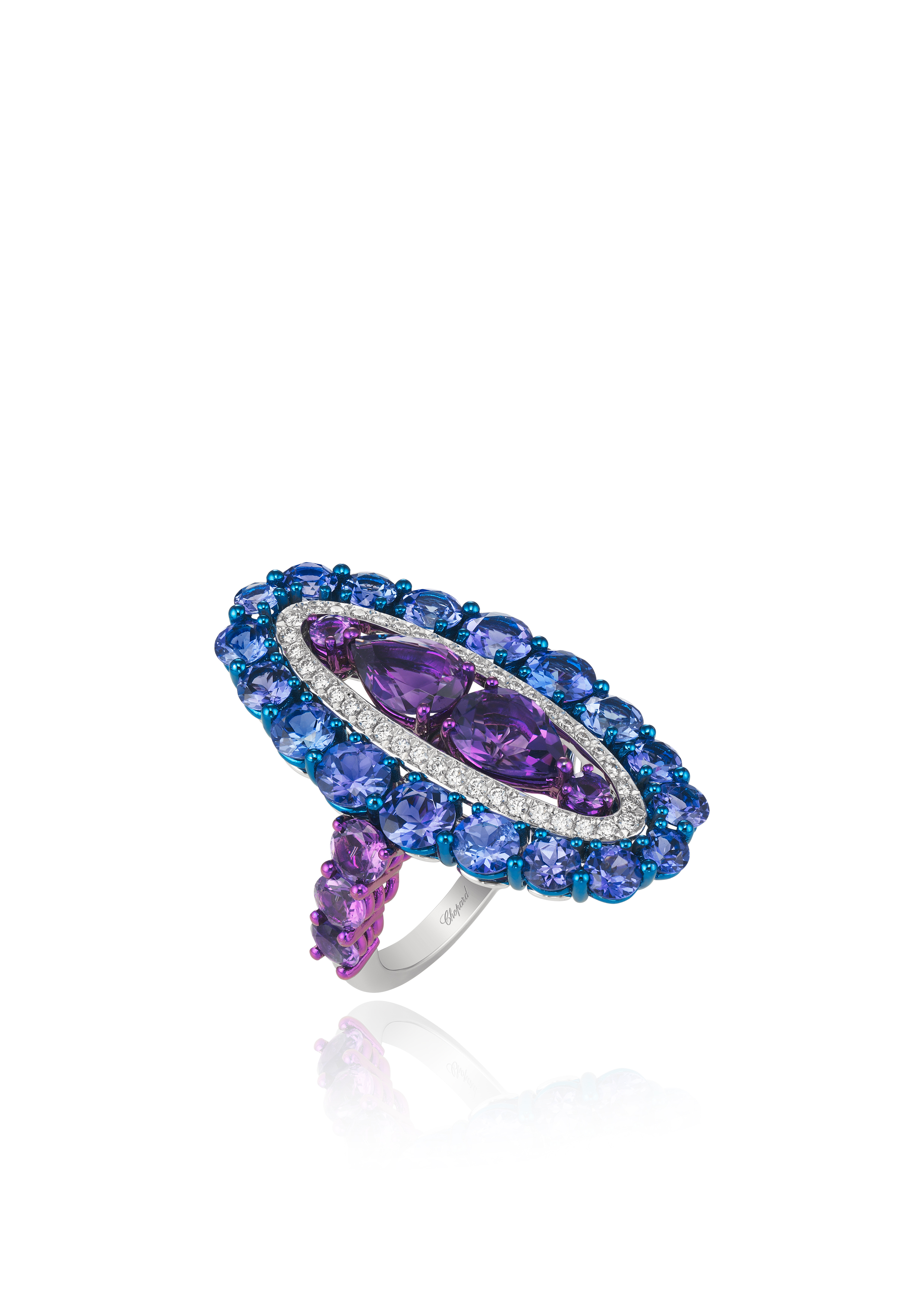 Si la couleur prédomine toujours, un nouveau design vient enrichir la collection : des bagues, boucles d’oreilles et sautoirs composés de formes ovales multicolores. Béryls verts, tanzanites, améthystes, mais aussi rubellites ou saphirs jaunes sont associés à des diamants, de l’or et du titane. Ce dernier permet toutes les audaces : très léger, il peut être teinté dans une large palette de couleurs et se rendre invisible sous le plus fin des sertissages. Plus présent, il densifie la couleur et apporte une luminosité aux pierres qui, ainsi mises en valeur, semblent comme éclairées de l’intérieur…
