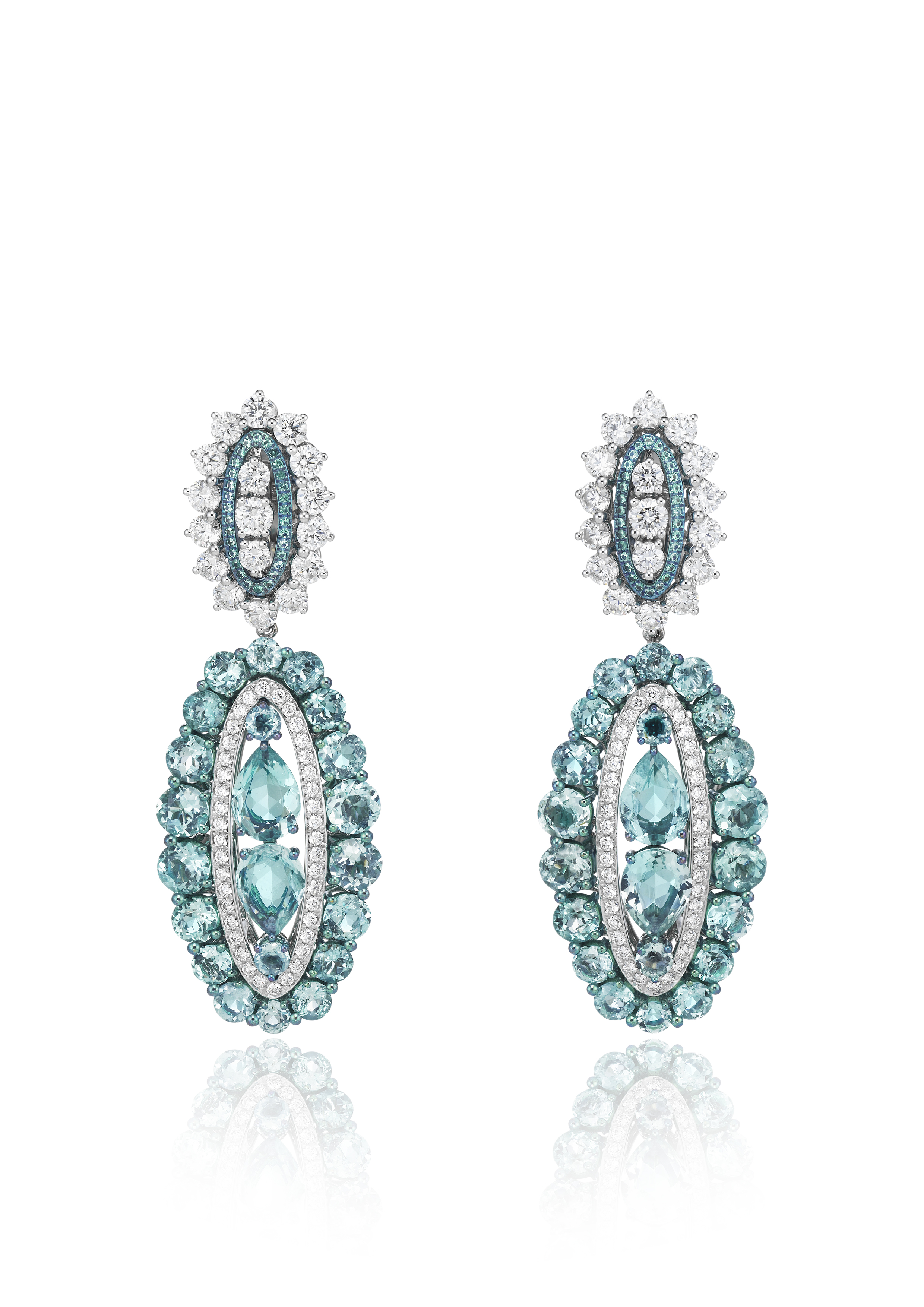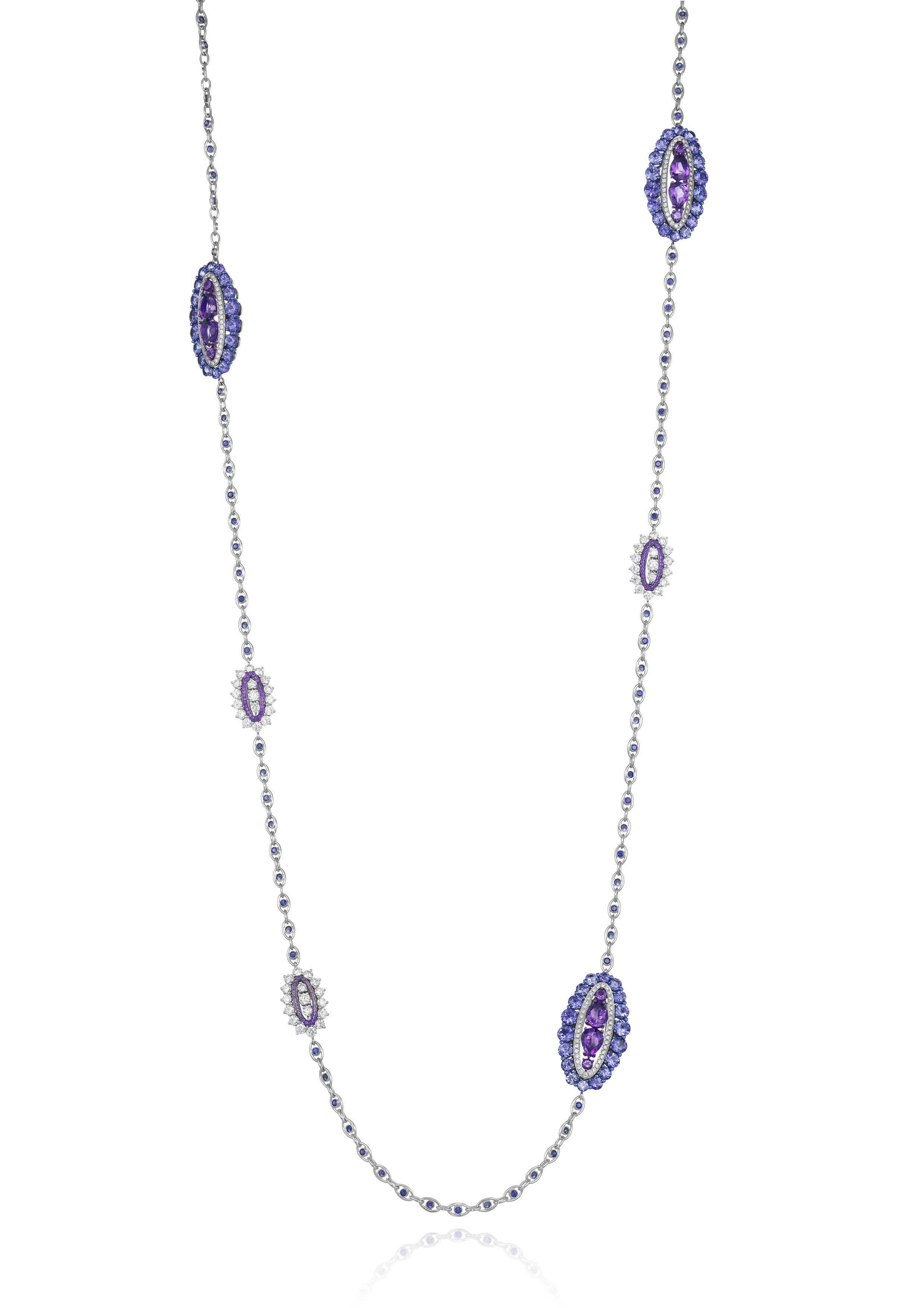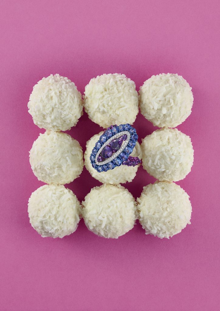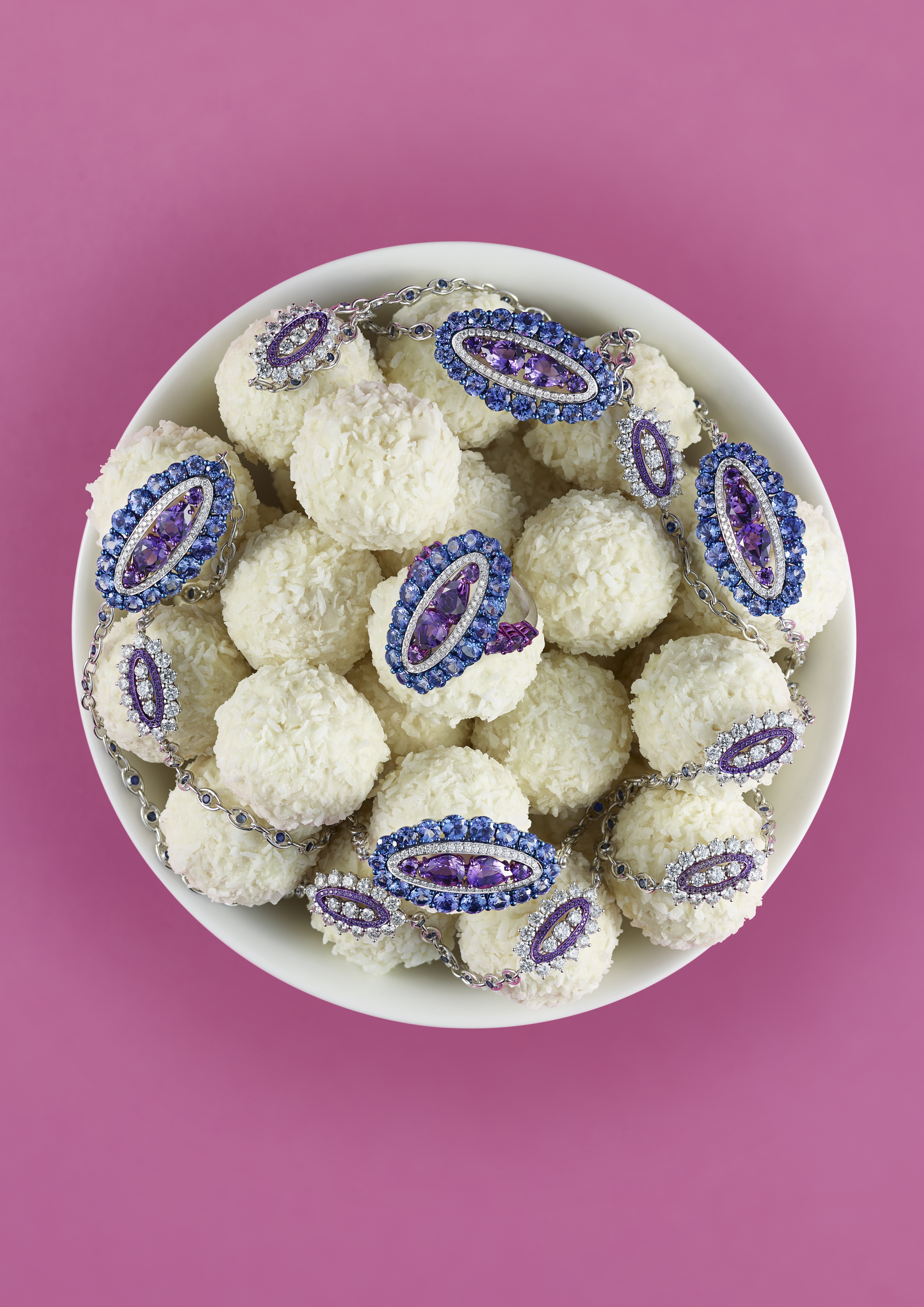 Si la couleur prédomine toujours, un nouveau design vient enrichir la collection : des bagues, boucles d’oreilles et sautoirs composés de formes ovales multicolores. Béryls verts, tanzanites, améthystes, mais aussi rubellites ou saphirs jaunes sont associés à des diamants, de l’or et du titane. Ce dernier permet toutes les audaces : très léger, il peut être teinté dans une large palette de couleurs et se rendre invisible sous le plus fin des sertissages. Plus présent, il densifie la couleur et apporte une luminosité aux pierres qui, ainsi mises en valeur, semblent comme éclairées de l’intérieur…