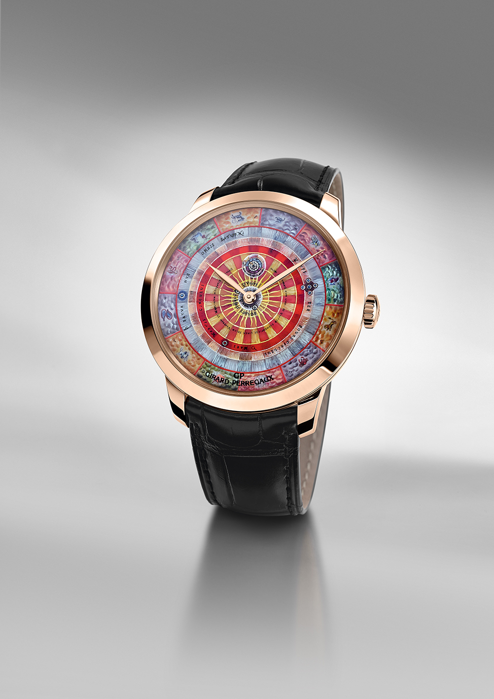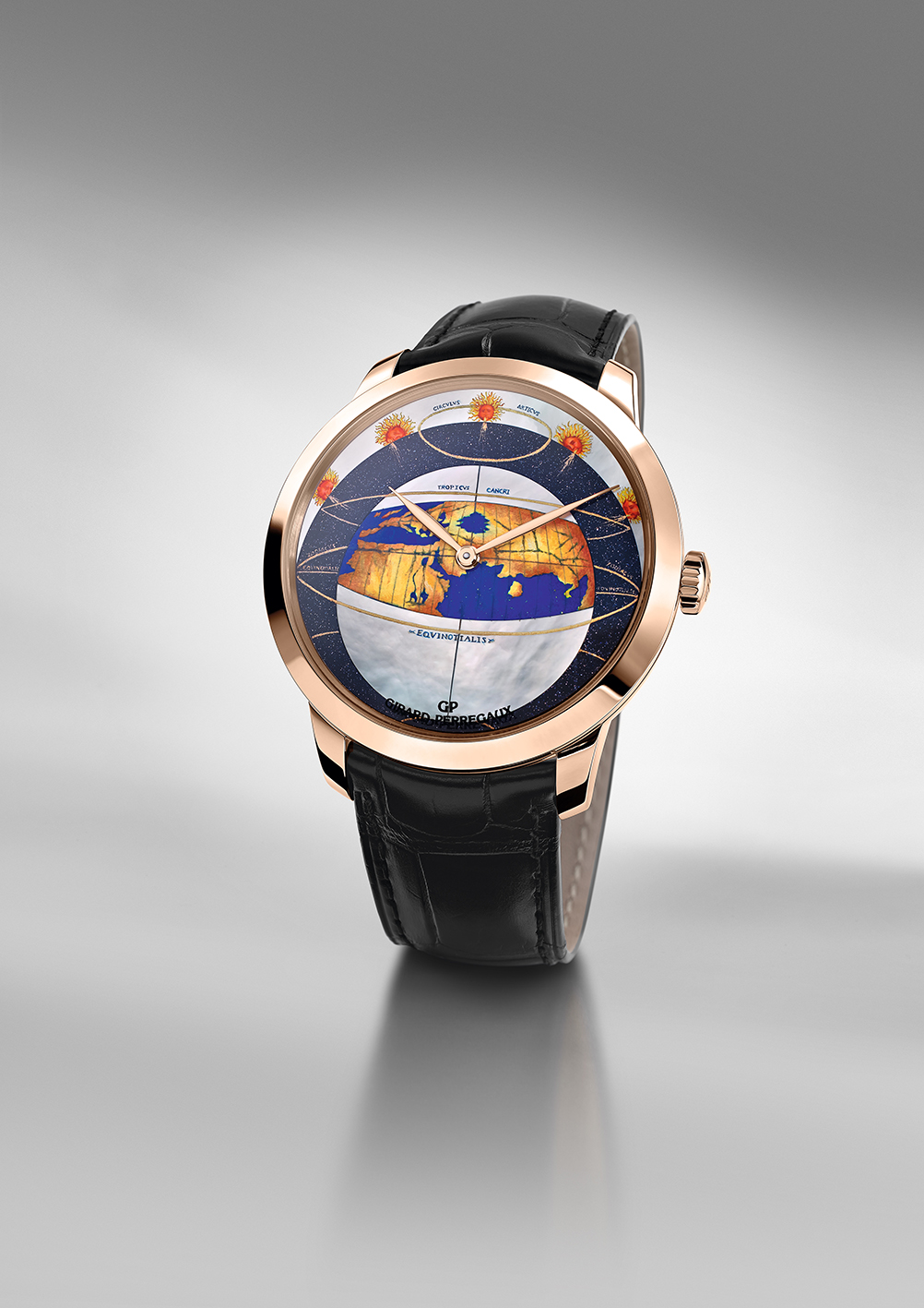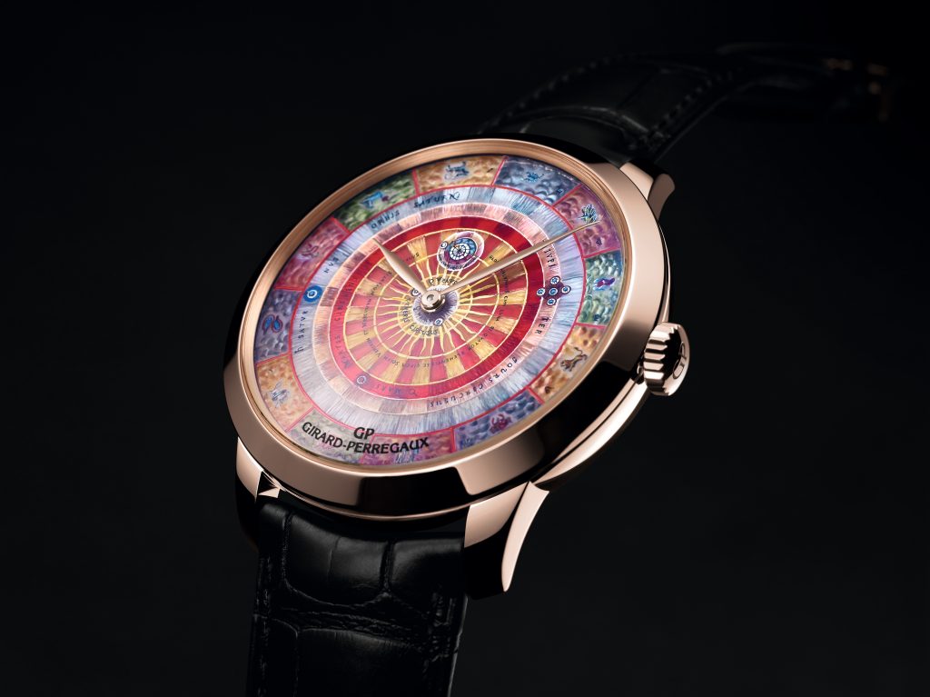 En 2016, la marque offre à sa collection Girard Perregaux 1966 or rose une trilogie de pièces numérotées habitées par un calibre manufacture automatique dont les cadrans célèbrent la vision de la terre depuis l’univers ou celle de l’univers depuis le sol terrien. Ces véritables voyages interplanétaires, ouvrent la « Chambre des Merveilles » à de nouvelles lectures colorées du passé, à des compréhensions neuves d’objets référents surgis de l’Histoire universelle. Ils sont la rencontre originale entre les arts manufacturiers d’une région de montagne dédiée à l’horlogerie d’excellence et les connaissances pluridisciplinaires de l’ouverture au monde.
