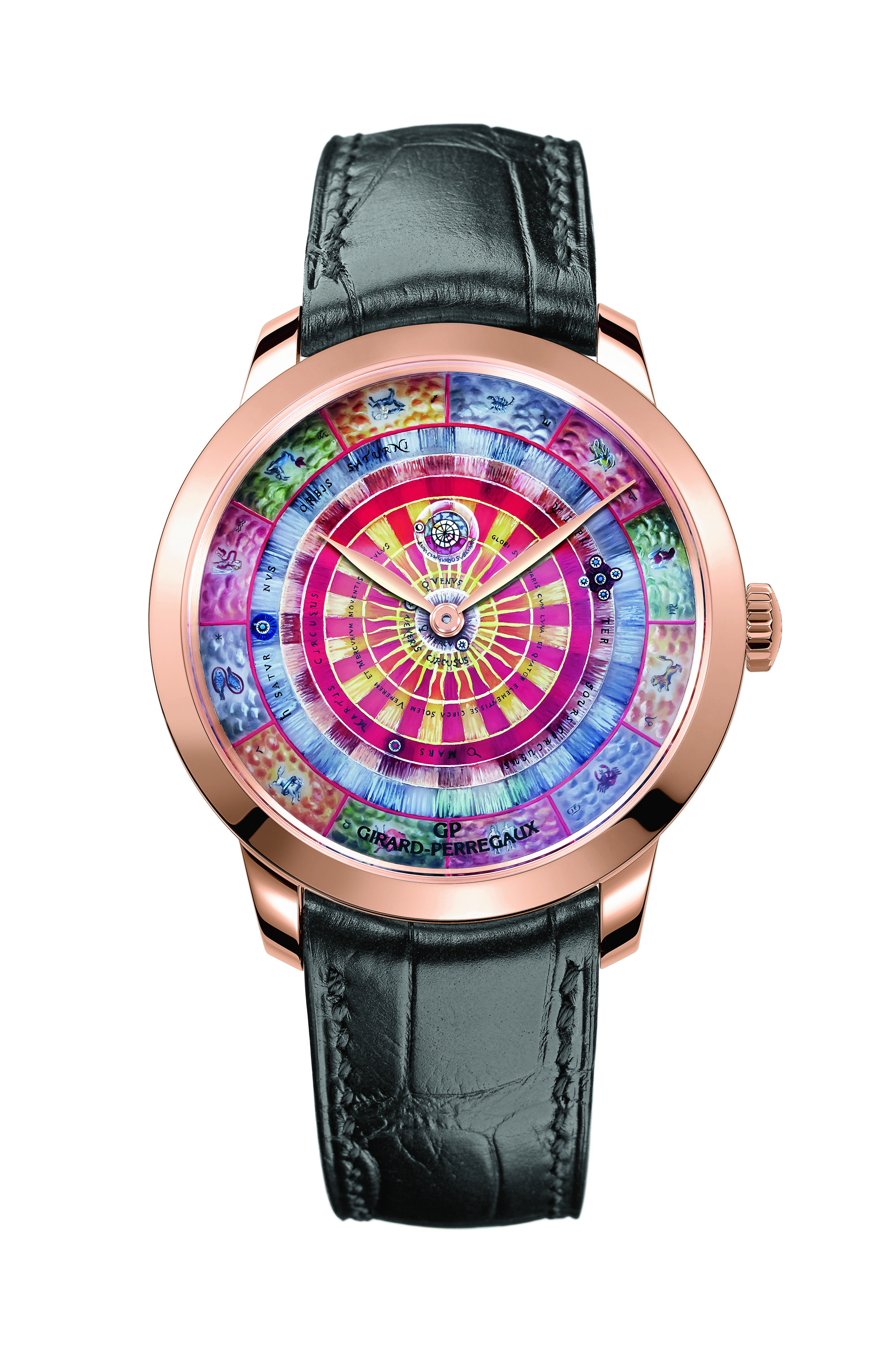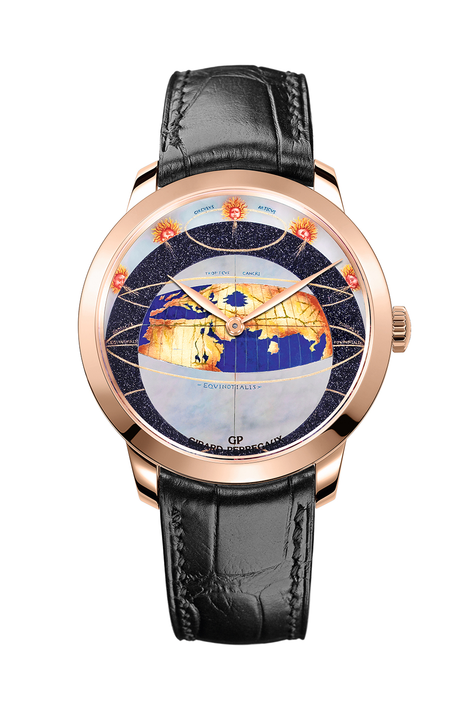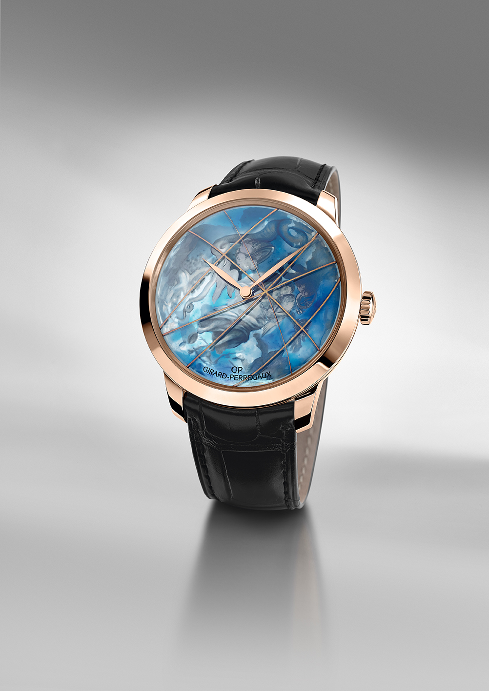 En 2016, la marque offre à sa collection Girard Perregaux 1966 or rose une trilogie de pièces numérotées habitées par un calibre manufacture automatique dont les cadrans célèbrent la vision de la terre depuis l’univers ou celle de l’univers depuis le sol terrien. Ces véritables voyages interplanétaires, ouvrent la « Chambre des Merveilles » à de nouvelles lectures colorées du passé, à des compréhensions neuves d’objets référents surgis de l’Histoire universelle. Ils sont la rencontre originale entre les arts manufacturiers d’une région de montagne dédiée à l’horlogerie d’excellence et les connaissances pluridisciplinaires de l’ouverture au monde.