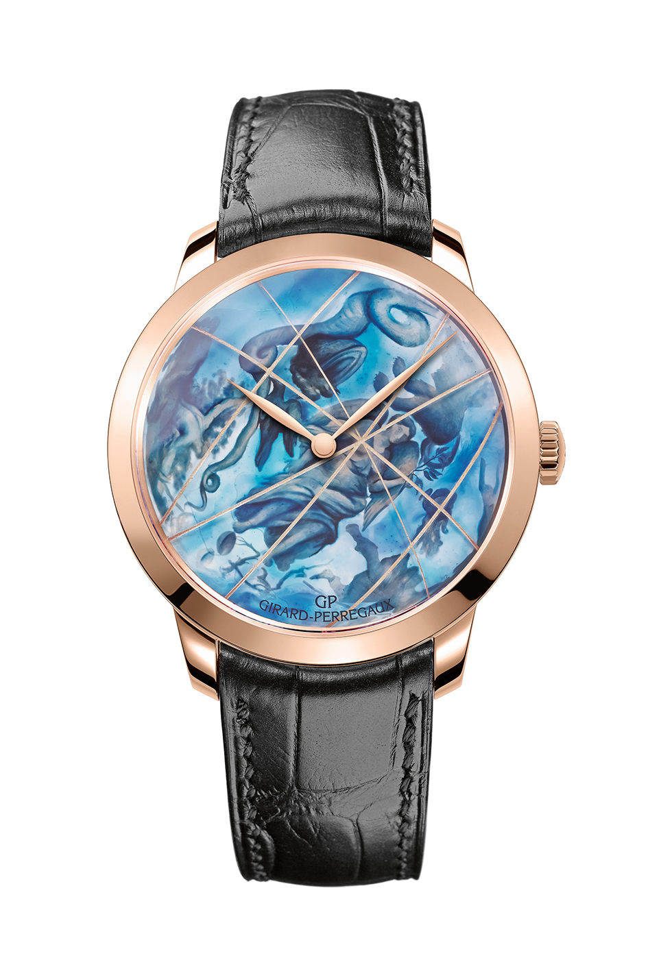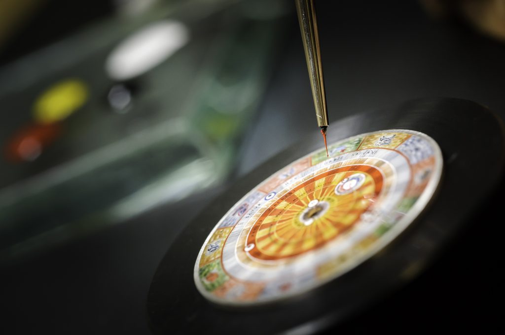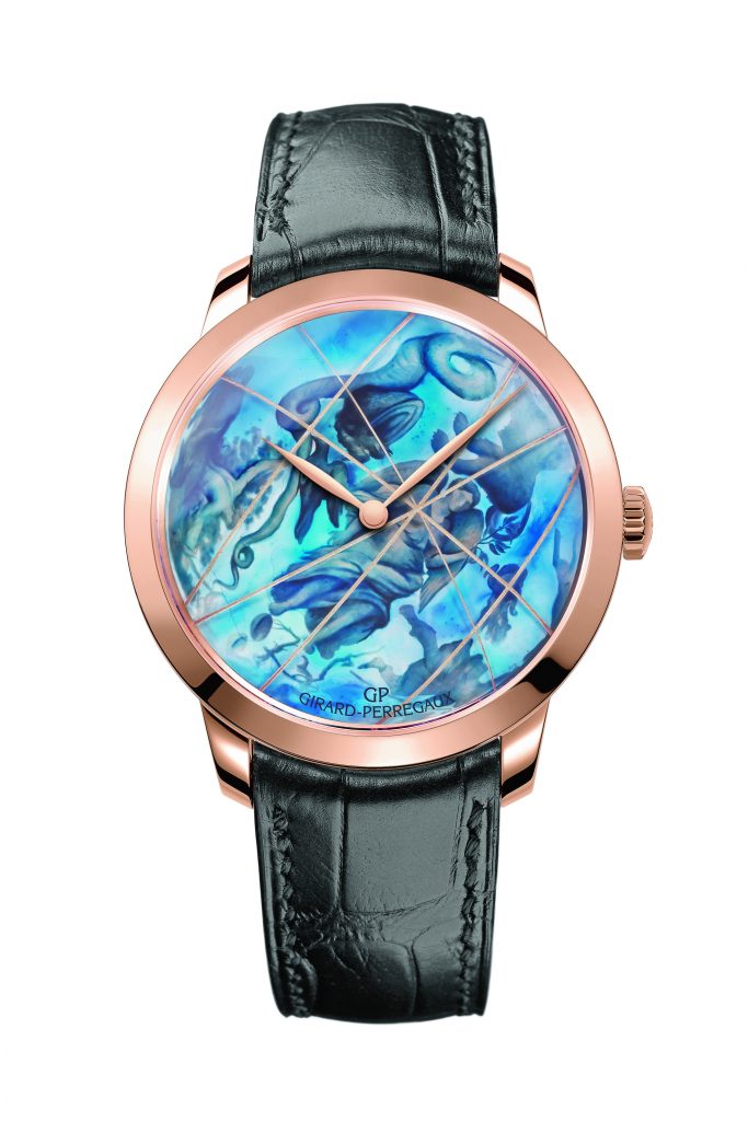 A l’honneur, à même la petitesse d’un cadran de garde-temps, une ode magistrale à la couleur bleue et à l’infinité de ses intensités selon les personnages reproduits minutieusement à la peinture miniature. Le cadran en saphir bombé est peint à la main et comblé de poudre d’or liquide dans des sillons obtenus par gravure. Le cadran sous forme de dôme accueille les courbes du soleil et illustre à la peinture miniature les formes symboliques d’animaux ou de figures mythologiques pour le plus grand plaisir des curieux. Un savoir-faire qui nécessite environ 14 heures de travail afin de reproduire les moindres détails. Girard-Perregaux met en lumière des techniques de nature à se mesurer aux expressions les plus abouties des arts dits majeurs. Tout en finesse, cette réalisation de « La Chambre des Merveilles » 2016 étale délicatement, par l’infinité des nuances de bleu obtenues, les savoirs perpétués où se cultive, sur fond d’Histoire réappropriée, la relève des défis les plus audacieux.