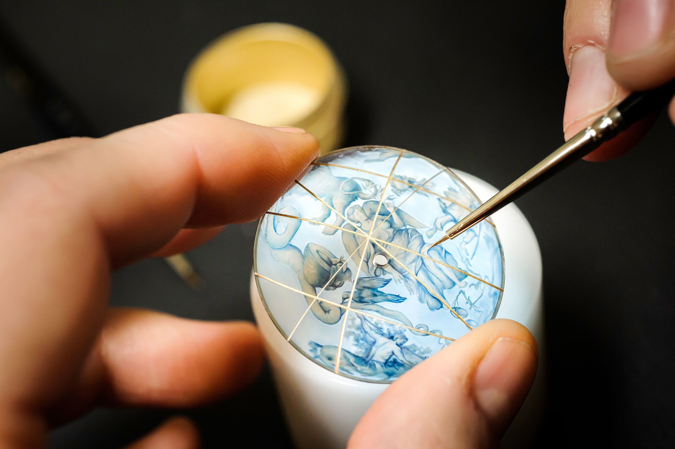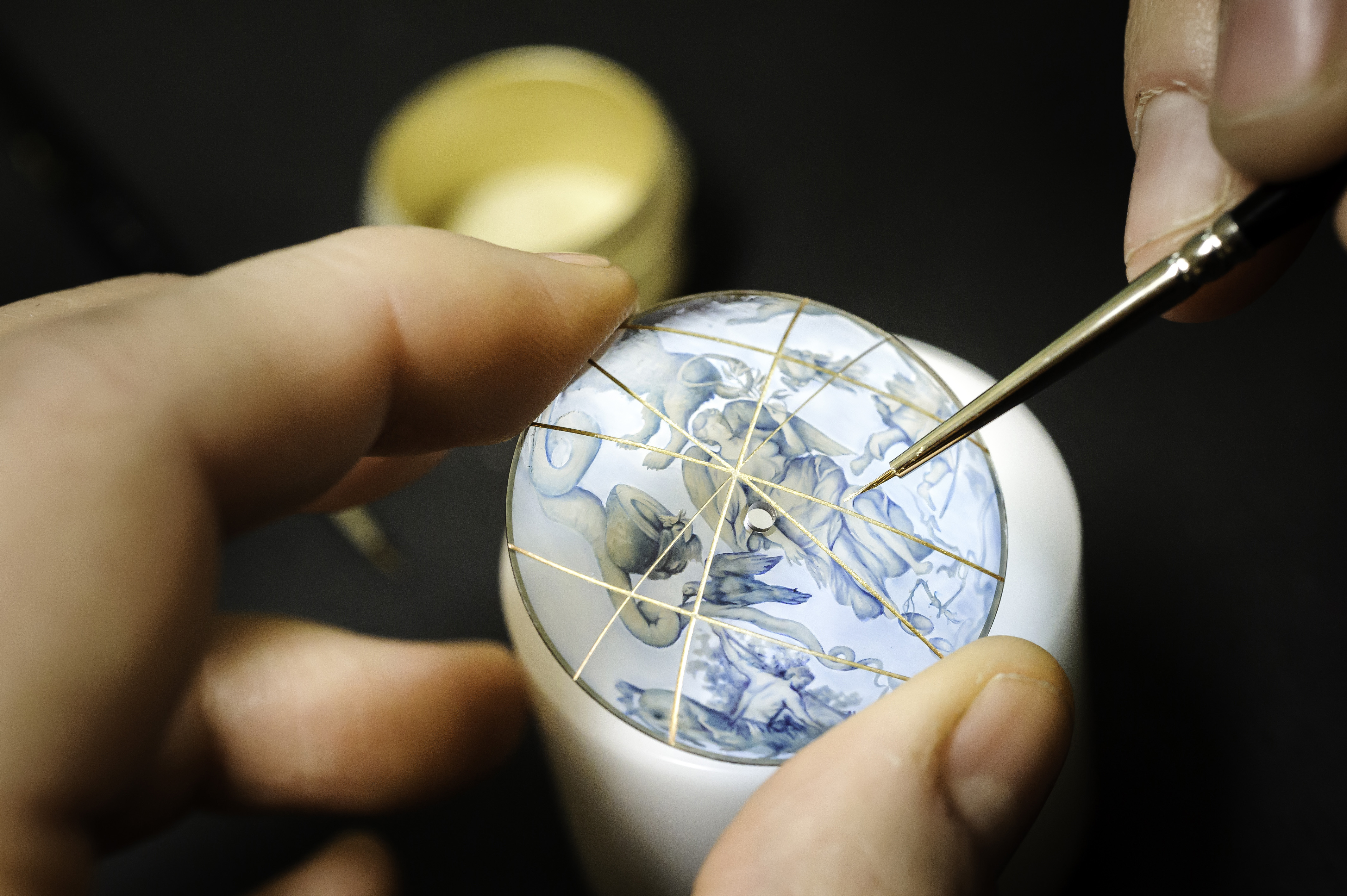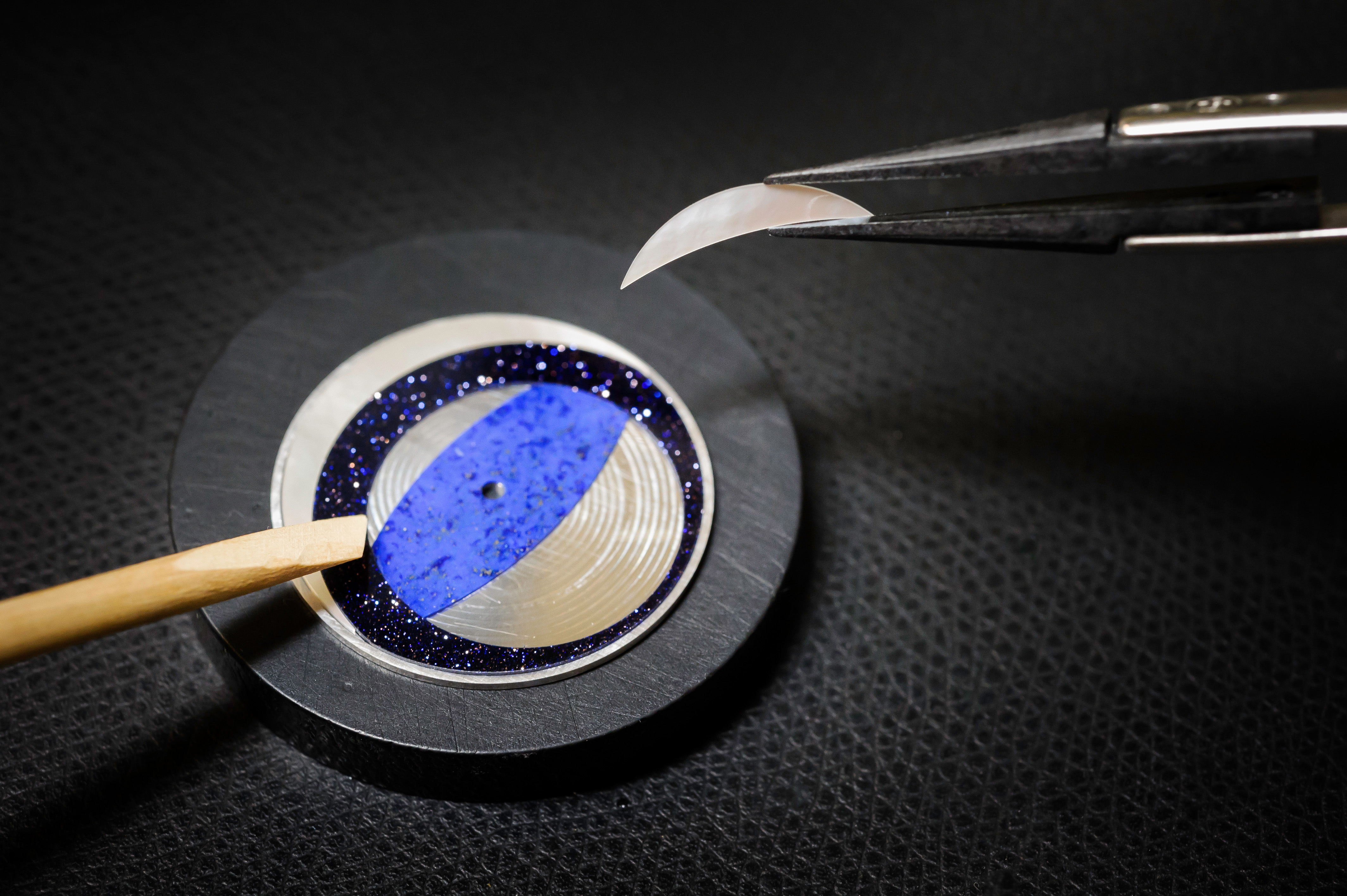 La réalisation de cette rare Girard Perregaux met en scène la technique d’une marqueterie de pierre enjolivée par le talent des peintres miniature. En résulte une profondeur que seule la pierre taillée en disques minces, puis polie et posée à la manière d’un joyau, est à même de restituer. Entrent en scène alors, des matériaux capables de parcourir différentes intensités de bleu, le lapis, l’aventurine, ou de refléter la douceur d’un blanc, nacre extra-blanche. Les étendues marines et les frontières de l’inconnu sont ainsi matérialisées. C’est alors que les pinceaux recouverts de poudre d’or, caressent délicatement les surfaces colorées. Les motifs ainsi mis à jour, au terme d’une infinie patience, symbolisent la terre ferme et ses contours.