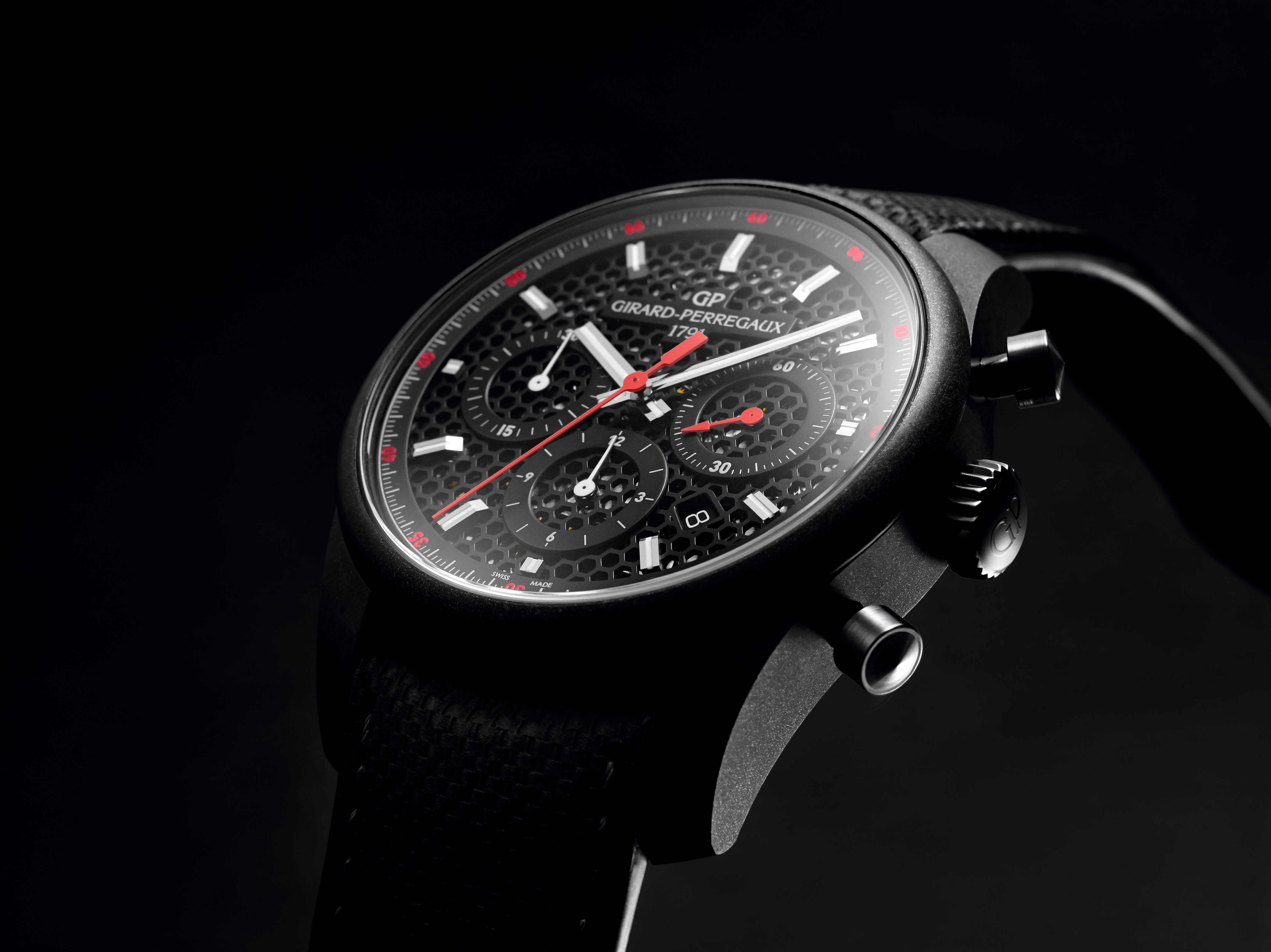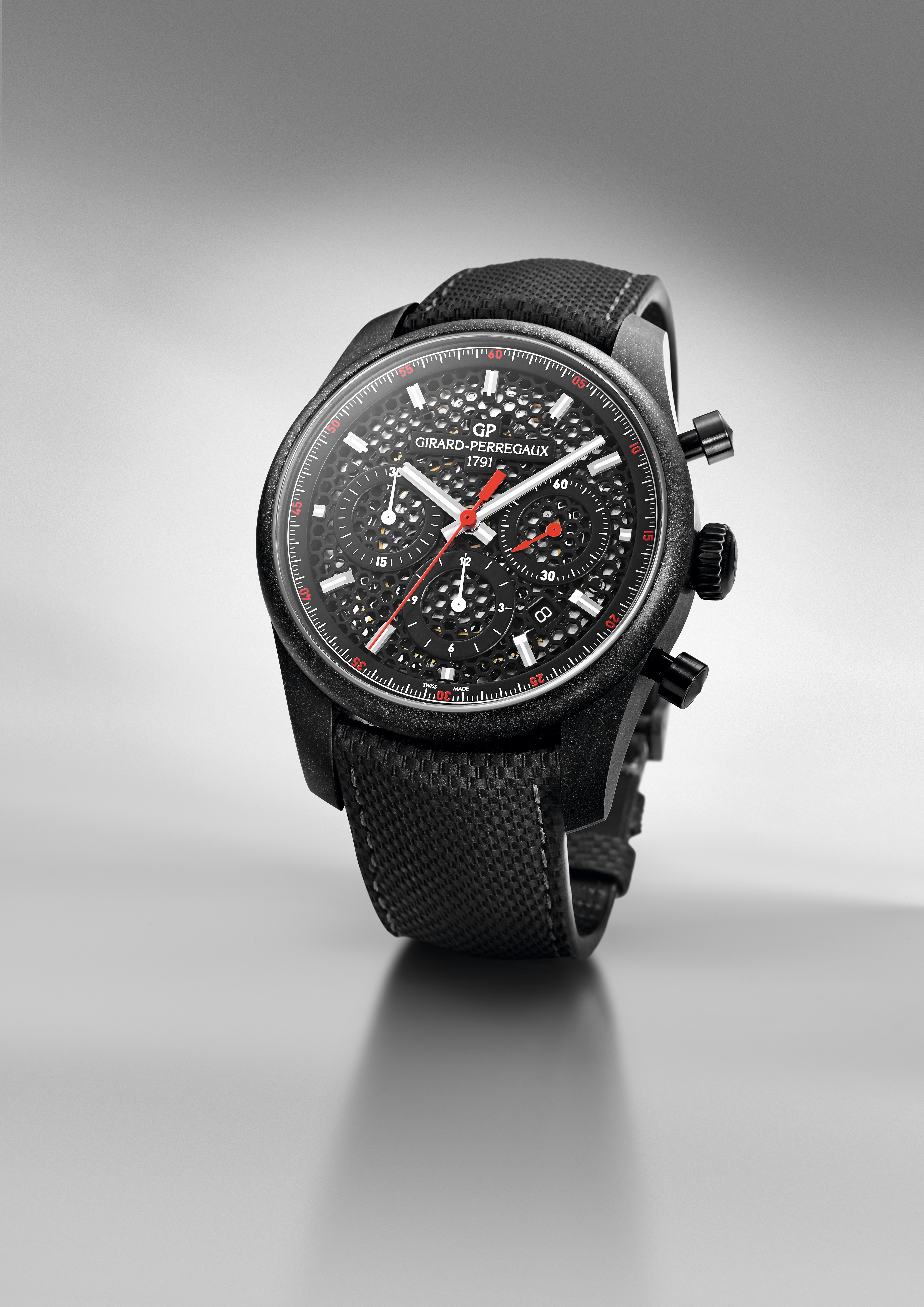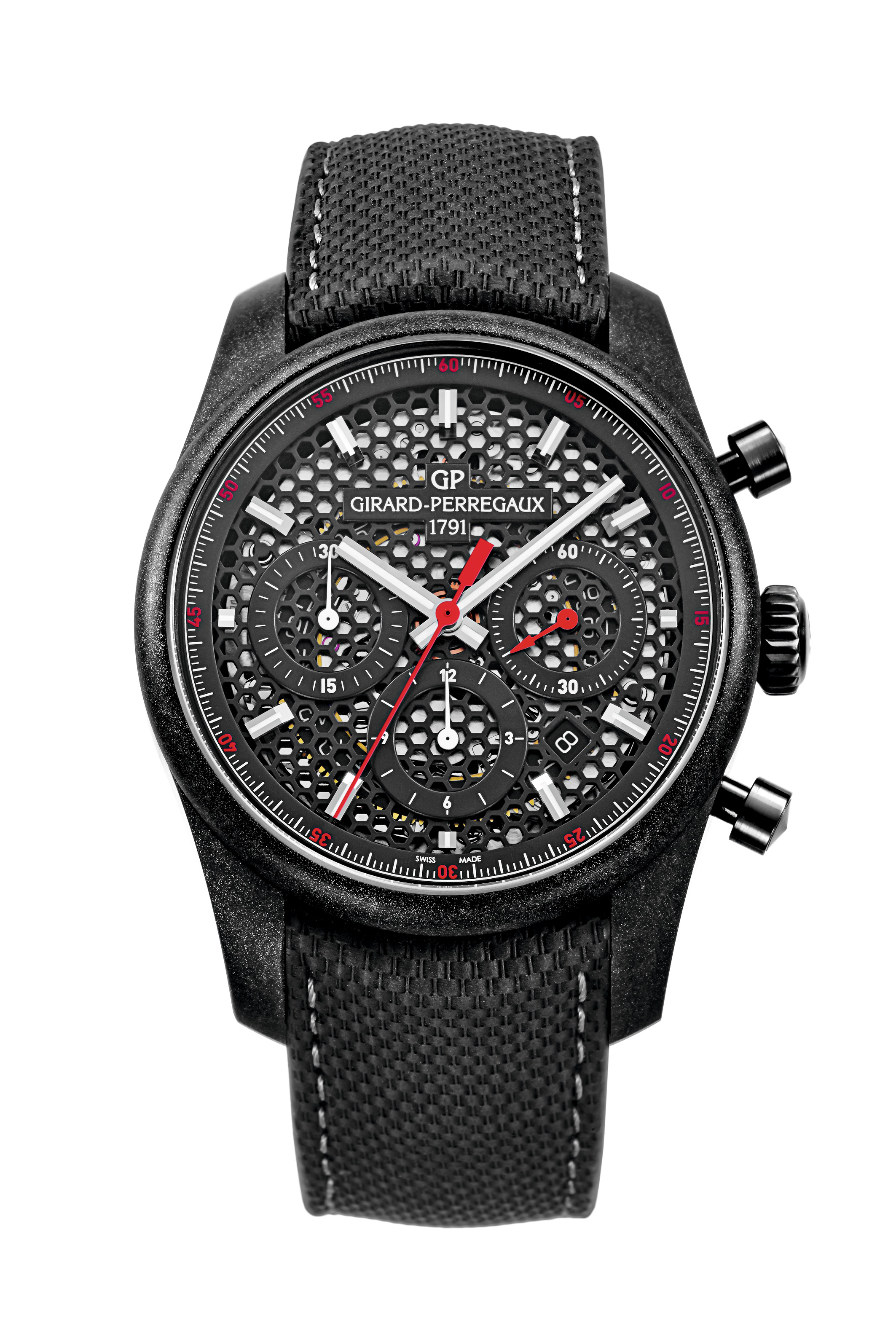 manufacture référencé GP03300-0122. Fini avec soin de façon artisanale au sein des ate- liers de la Manufacture, ce mécanisme de 25,60 mm (soit 11 lignes 1⁄2) aux vis bleuies, à la platine perlée , et aux ponts ornés de Côtes de Genève laisse voir, par le fond métallisé, quelques une de ses 435 composants dont une partie de ses 63 rubis, la roue à colonne, et la masse oscillante en acier. Se distingue également le groupe de régulation qui, vibrant à 28‘800 alternances par heure (soit 4hz) offre une précision optimale à ce garde-temps donné pour fonctionner durant 46 heures.. Proposé sur bracelet en veau effet carbone fermé au poignet grâce à une boucle déployante double en acier microbillé recouvert de dLC. Ce chronographe efficace et taillé pour l’aventure du quotidien arbore un cadran en composite ajouré « nid d’abeille» rappelant les calandres et prises d’air dans le domaine auto- mobile pour un effet sport-chic assuré.