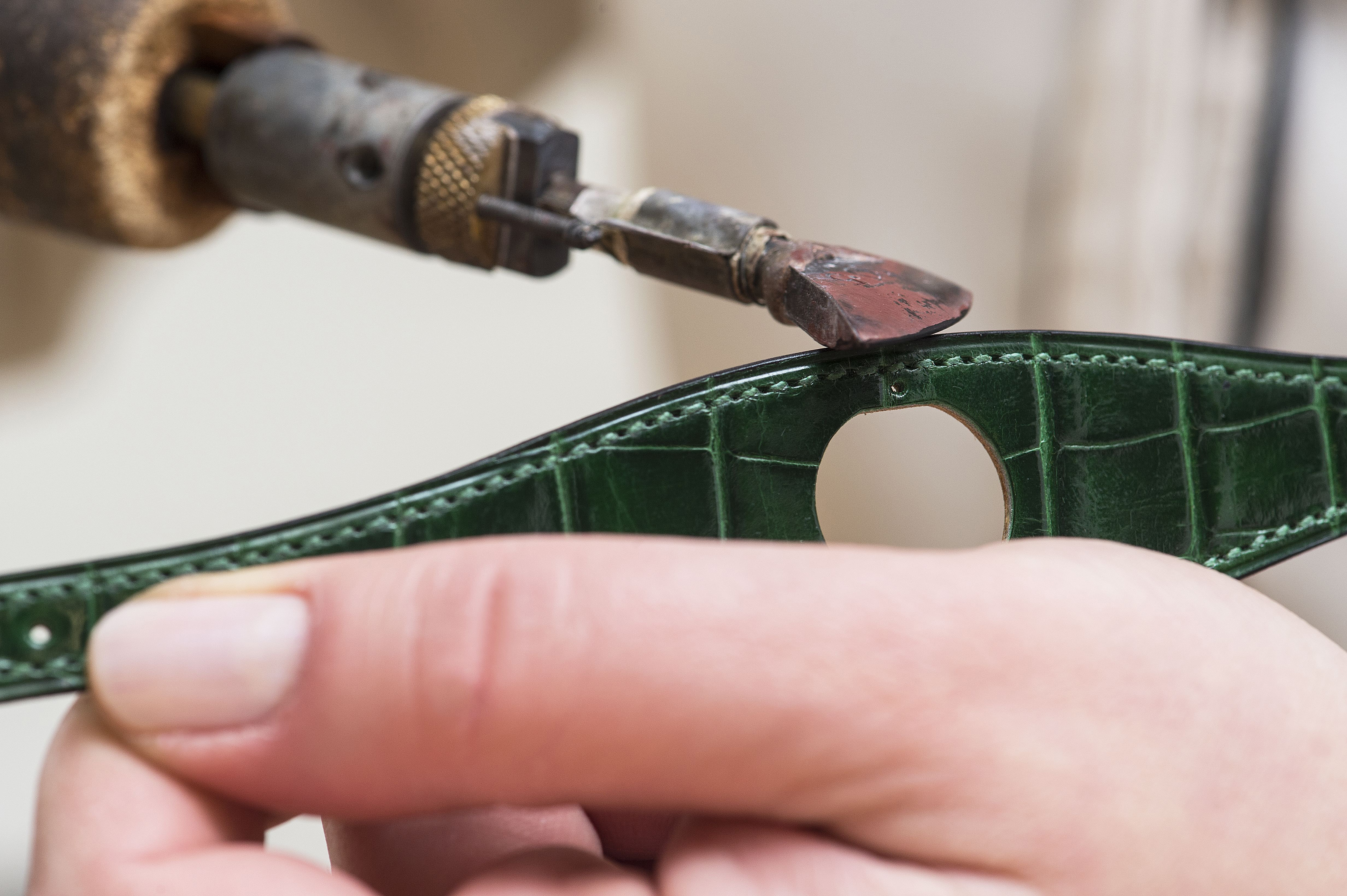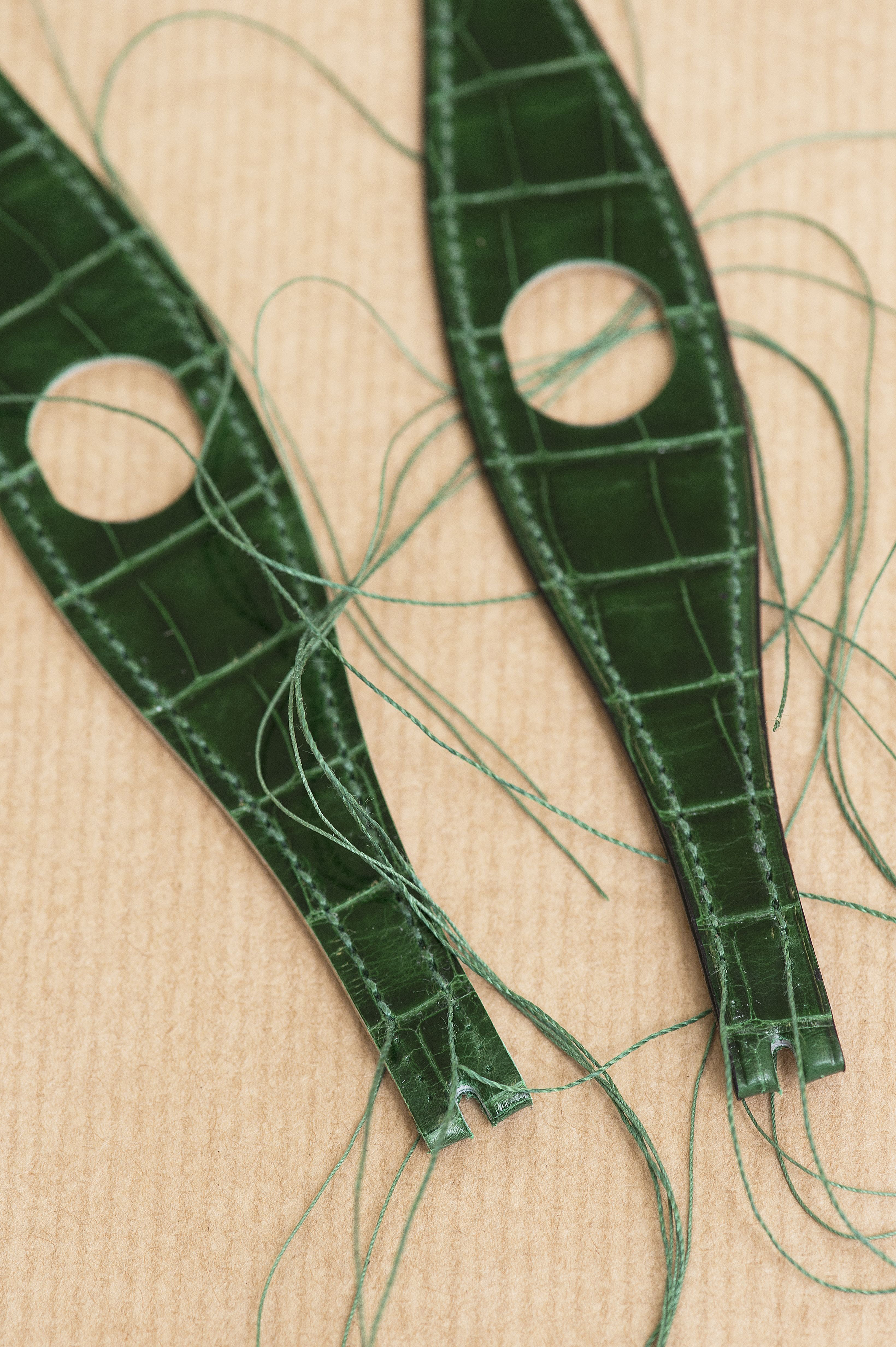 Dans la plus pure tradition Hermès, le maroquinier assemble ensuite le bracelet manchette grâce au fameux cousu-sellier en doublant trois points aux extrémités de la couture, gage de solidité. Puis, on dit qu’il abat-carre lorsqu’il ponce l’arête vive de la tranche avant de la leter, en la marquant d’un sillon entre la couture et le bord du cuir. La tranche est ensuite teintée, puis lissée à chaud avec la panne d’un fer lors d’une opération appelée astiquage. Pour finir, elle est imperméabilisée avec de la cire d’abeille.