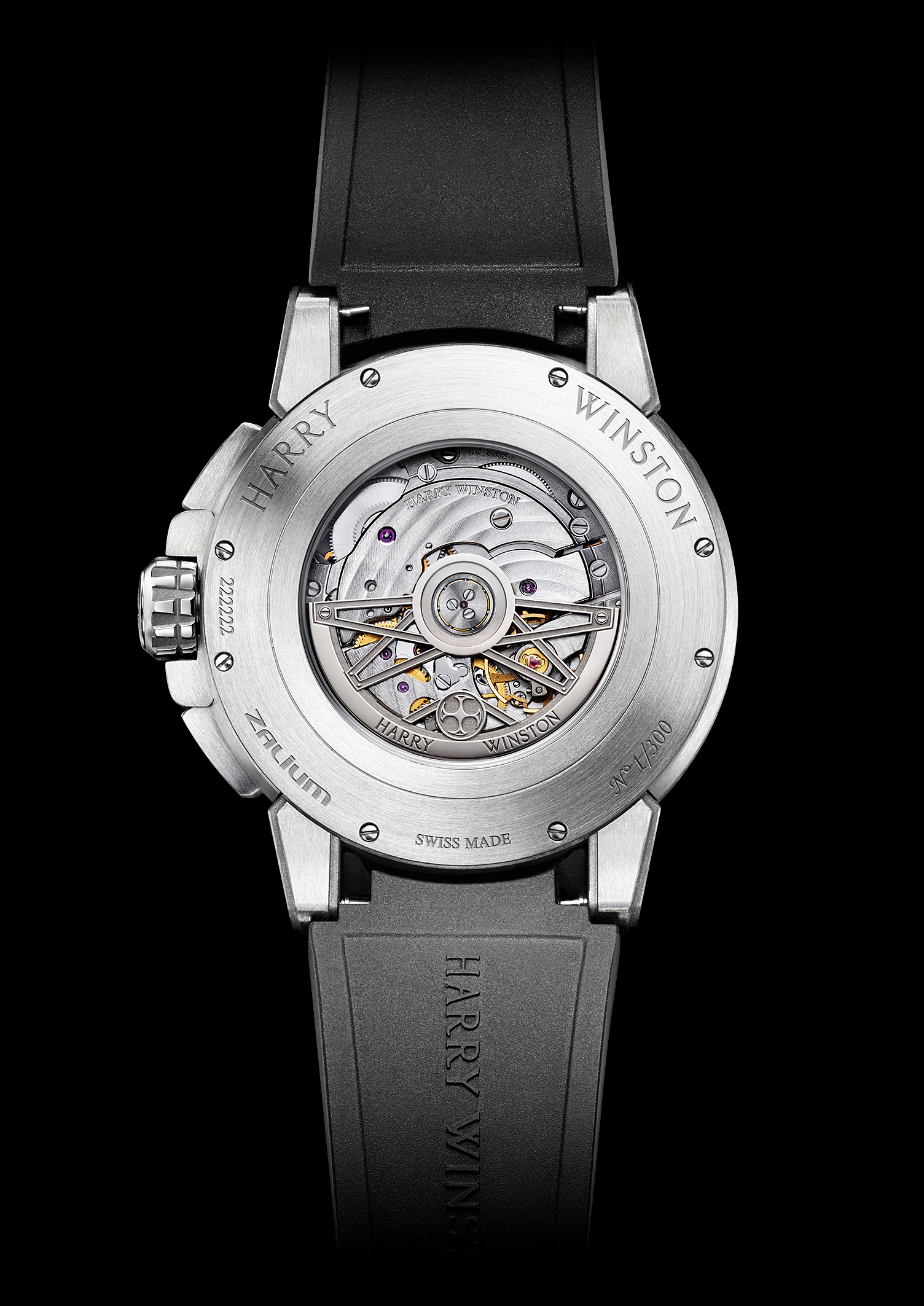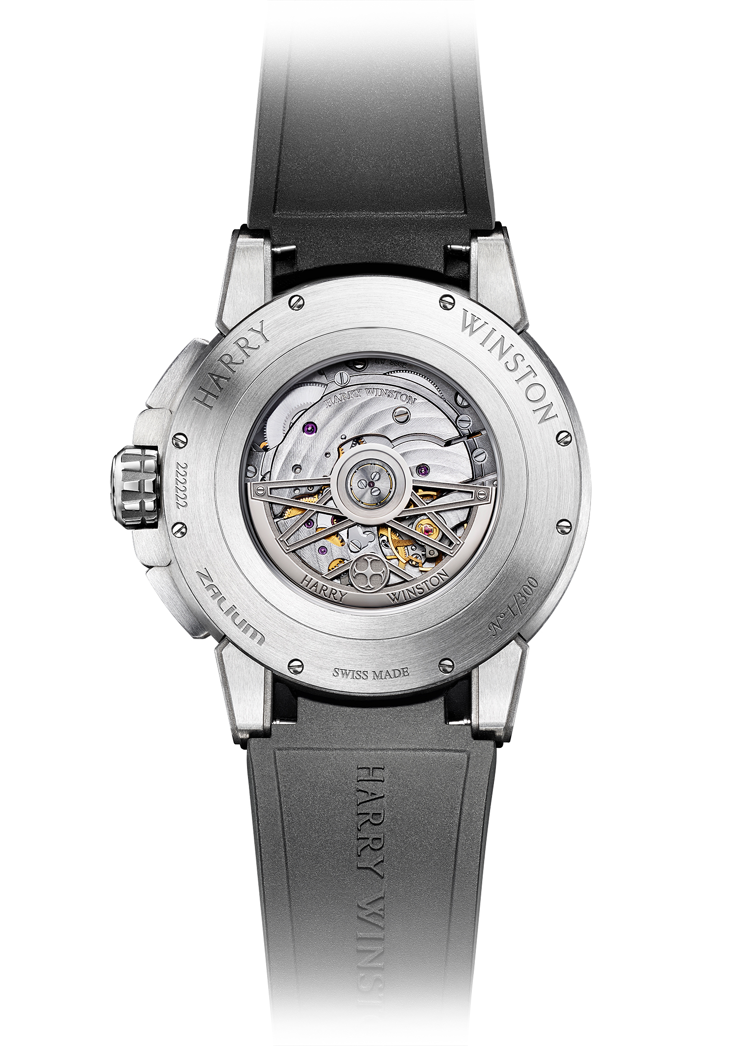 La boîte de Project Z10 est taillée dans un bloc de ZaliumTM, alliage unique, ultra léger et propriété exclusive de la Maison Harry Winston, et est montée sur un bracelet bi- matière marqué du Shuriken, dont la structure en caoutchouc noir est conjuguée avec une bande centrale en alligator bleu. Ce jeu de matière vient renforcer le caractère exclusif de cette nouvelle création de 42,2 mm de diamètre.