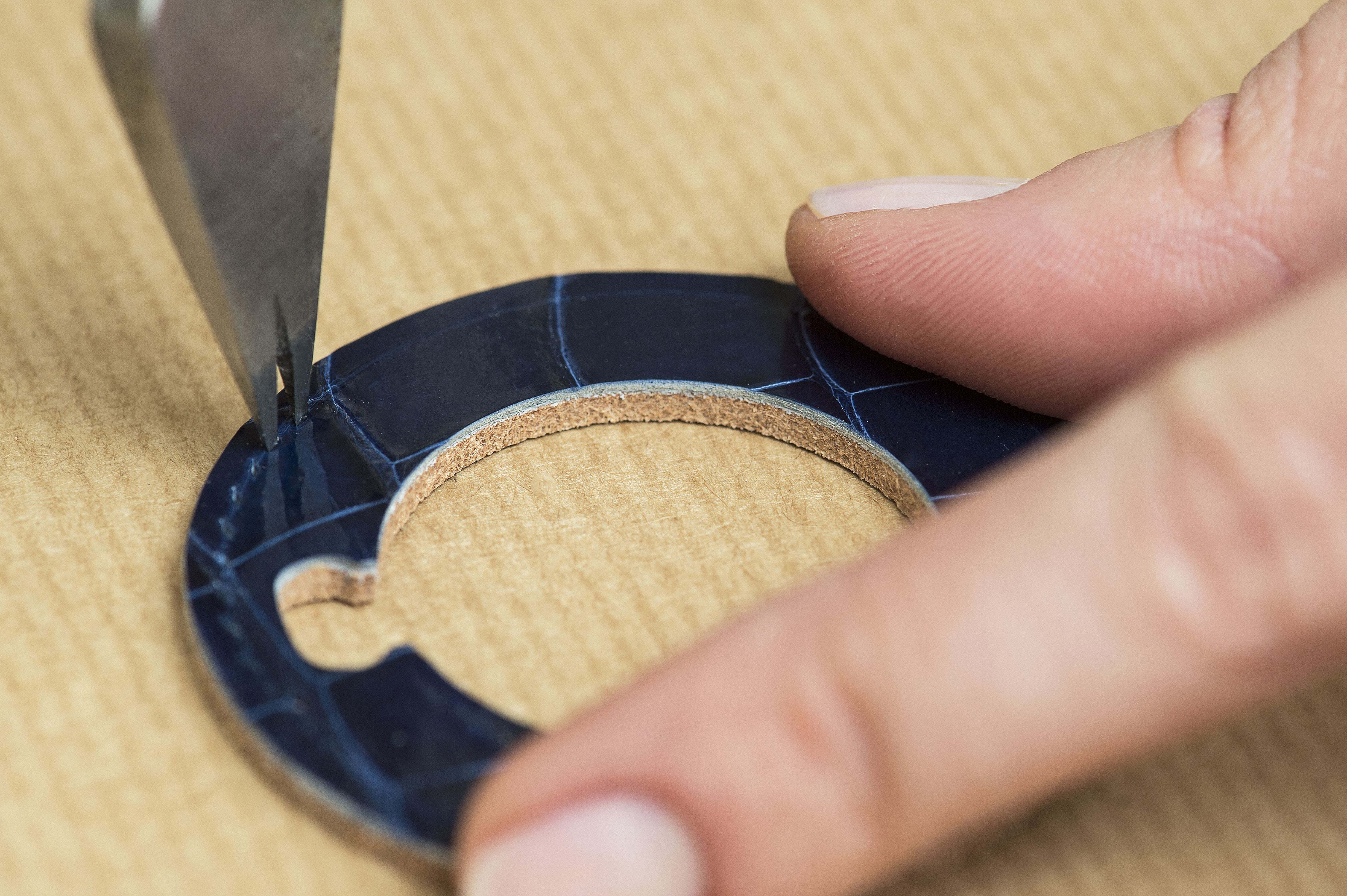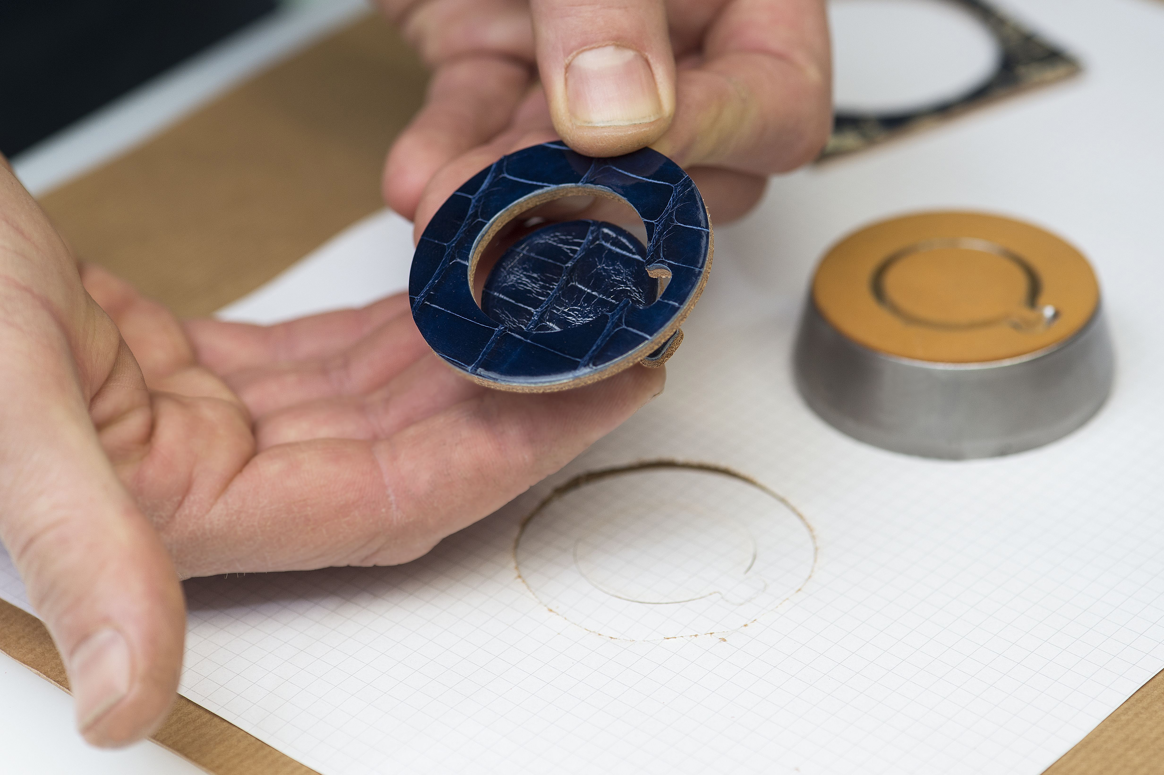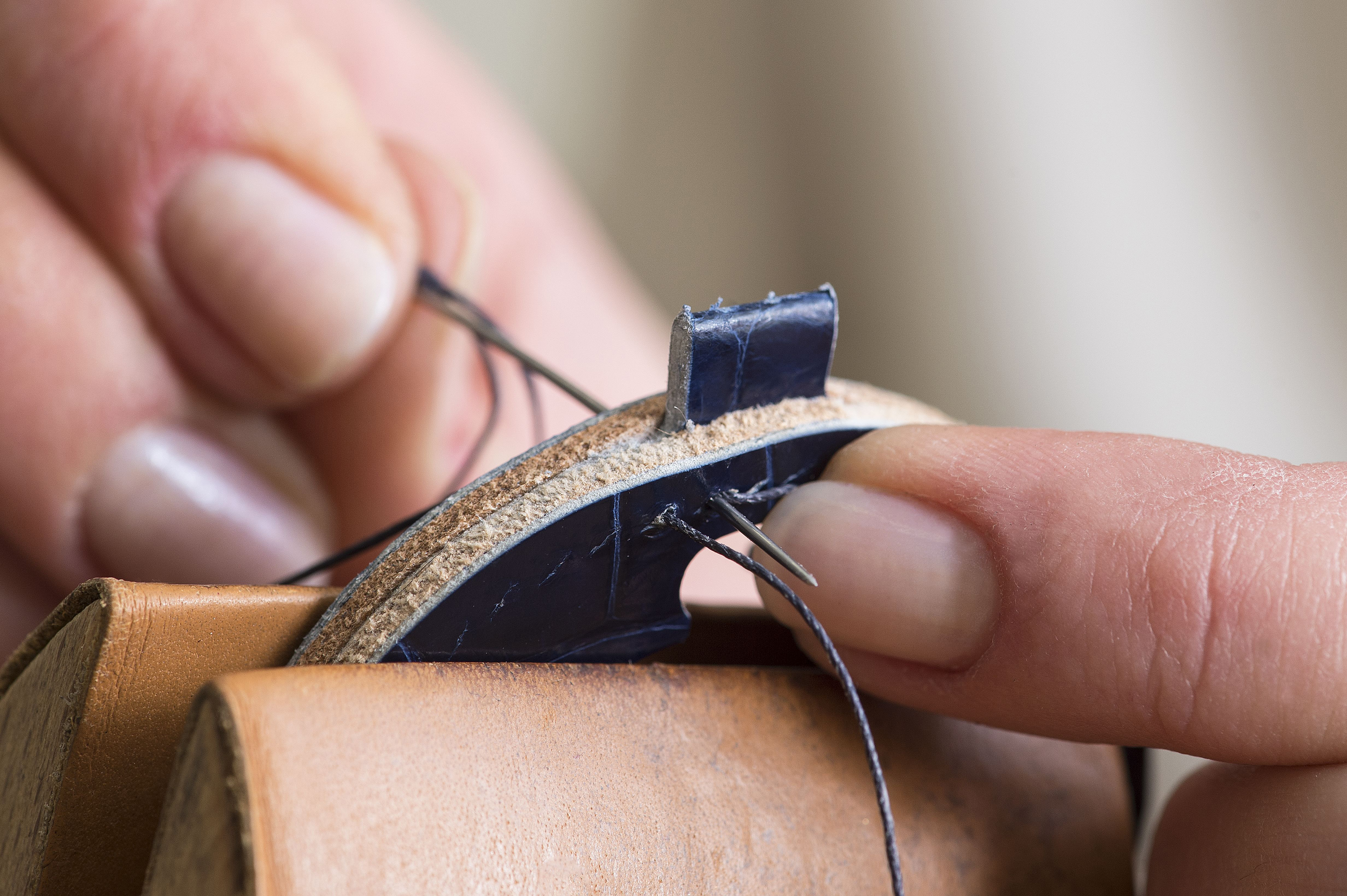 Deux techniques de sellerie sont associées dans ce garde-temps : la couture traversante et la technique dite « plein cuir ». Cette dernière consiste à superposer plusieurs couches de cuir pour créer une épaisseur de 6 millimètre au cœur duquel se loge la montre. L’artisan débute par l’attache qui sert à suspendre la montre de poche. Ce court ruban de cuir forme une boucle en se repliant sur lui-même. Puis, il ajoute de chaque côté du support une épaisseur de cuir de vache plus résistant. Chacune est ensuite recouverte d’une ne découpe en cuir d’alligator lissé et teinté donnant leur aspect nal à ses deux faces.