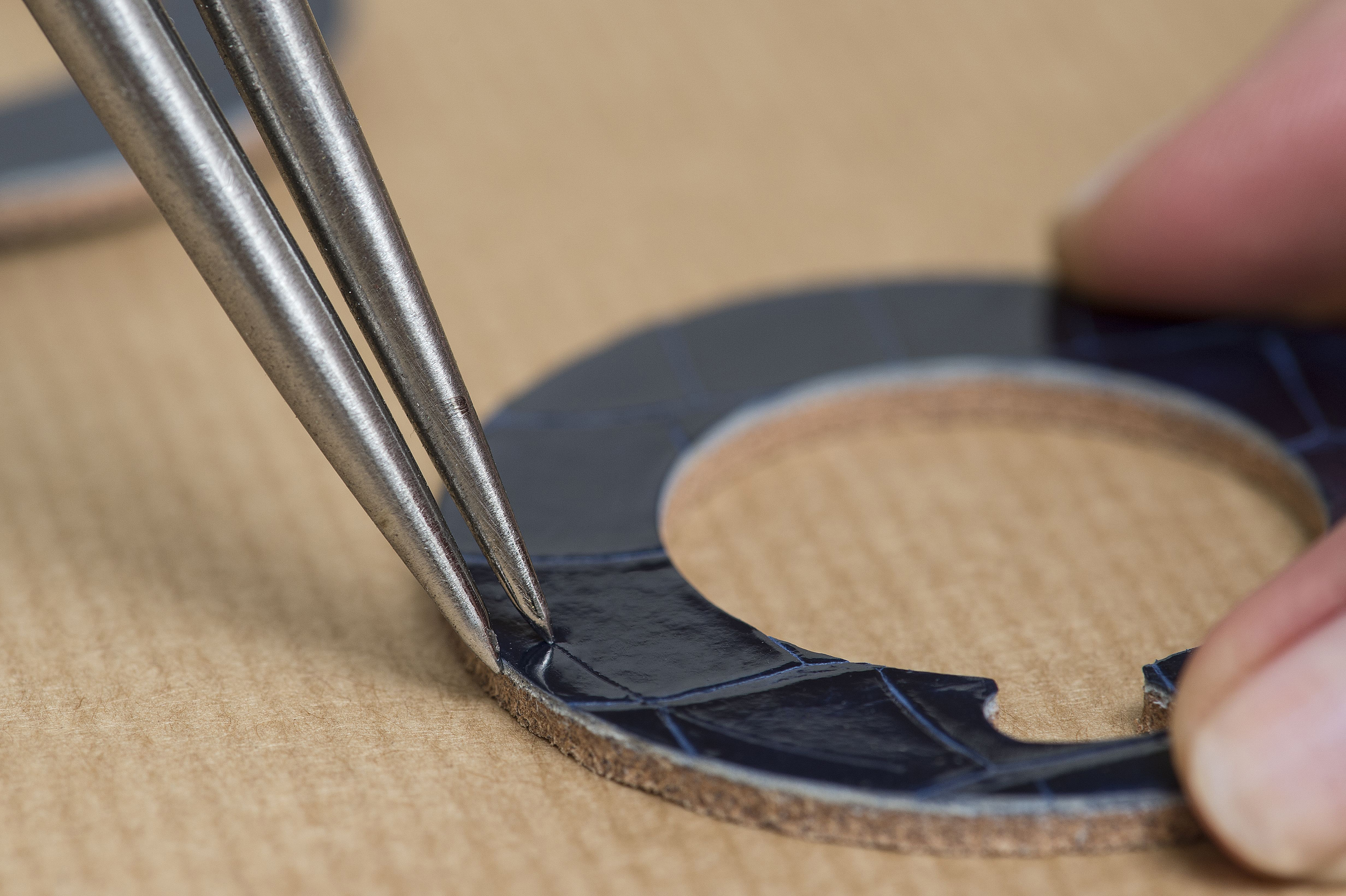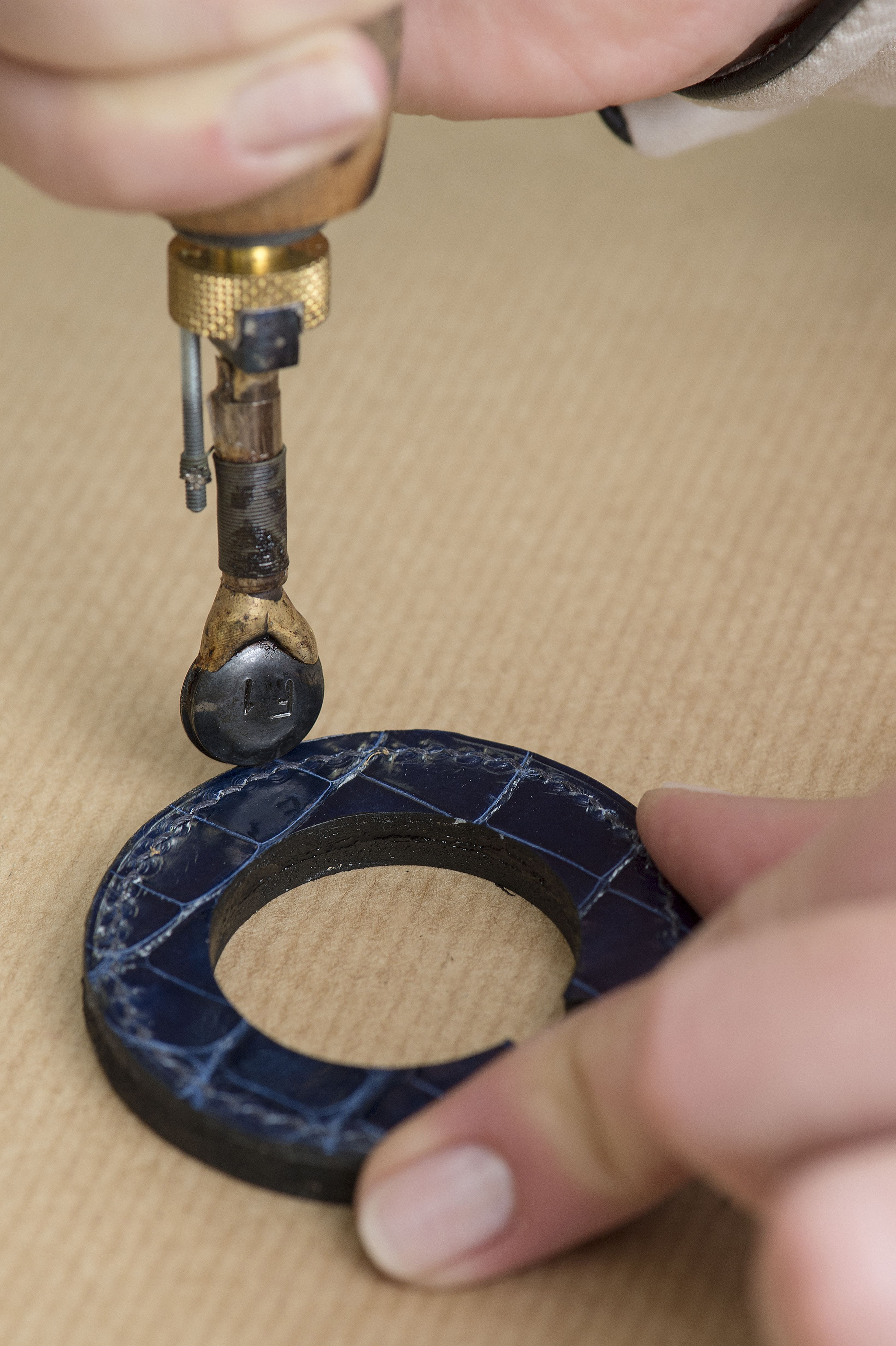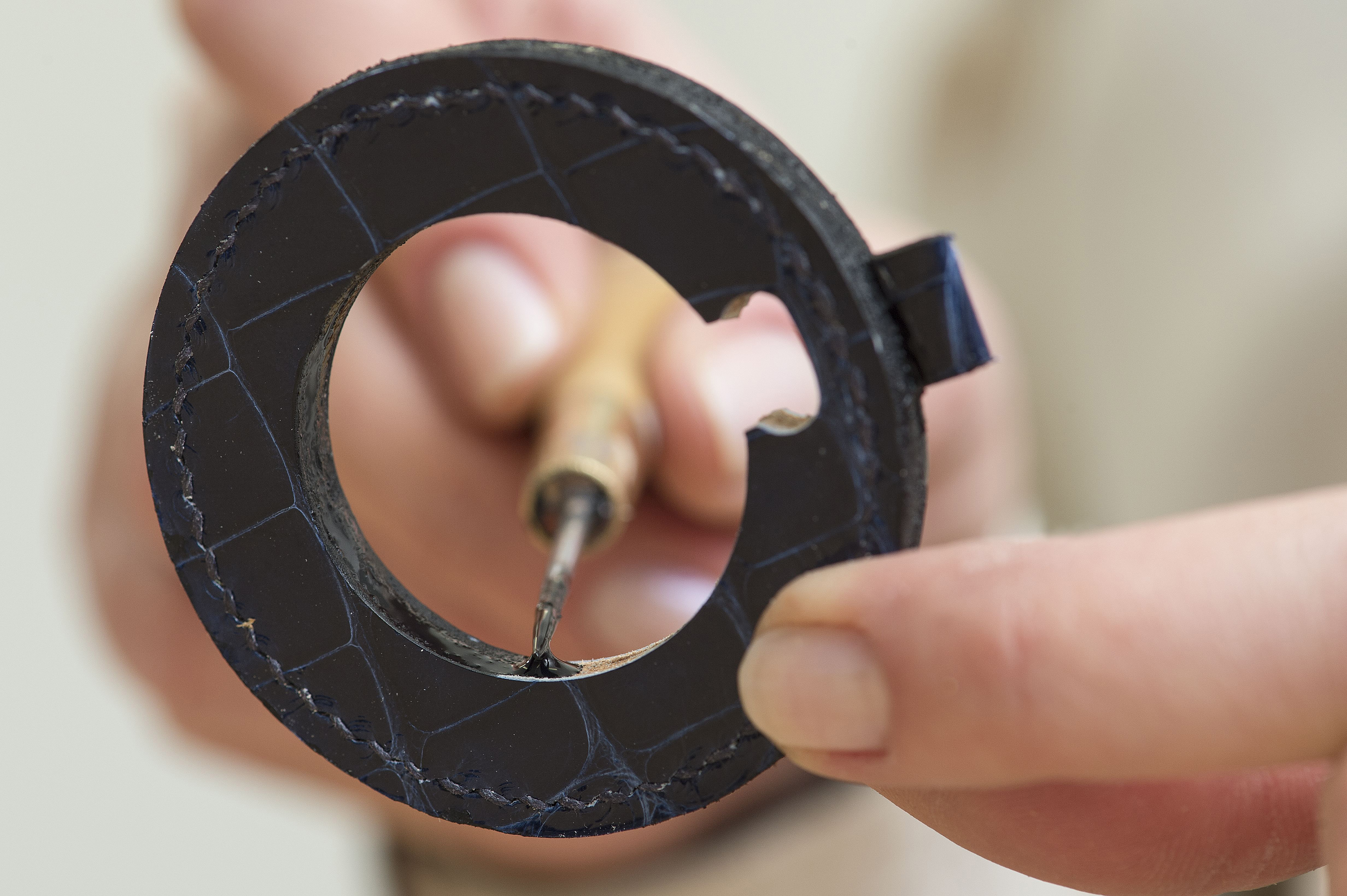 Cette opération exige un geste sûr et de l’expérience vu la matière à transpercer de façon parfaitement droite. La pièce est achevée par l’astiquage de la bordure extérieure et intérieure – même si cette dernière n’est pas visible une fois la montre de poche terminée. L’artisan donne la touche finale en y déposant une teinture sur ces deux parties, avant d’appliquer une protection à base de cire d’abeille.