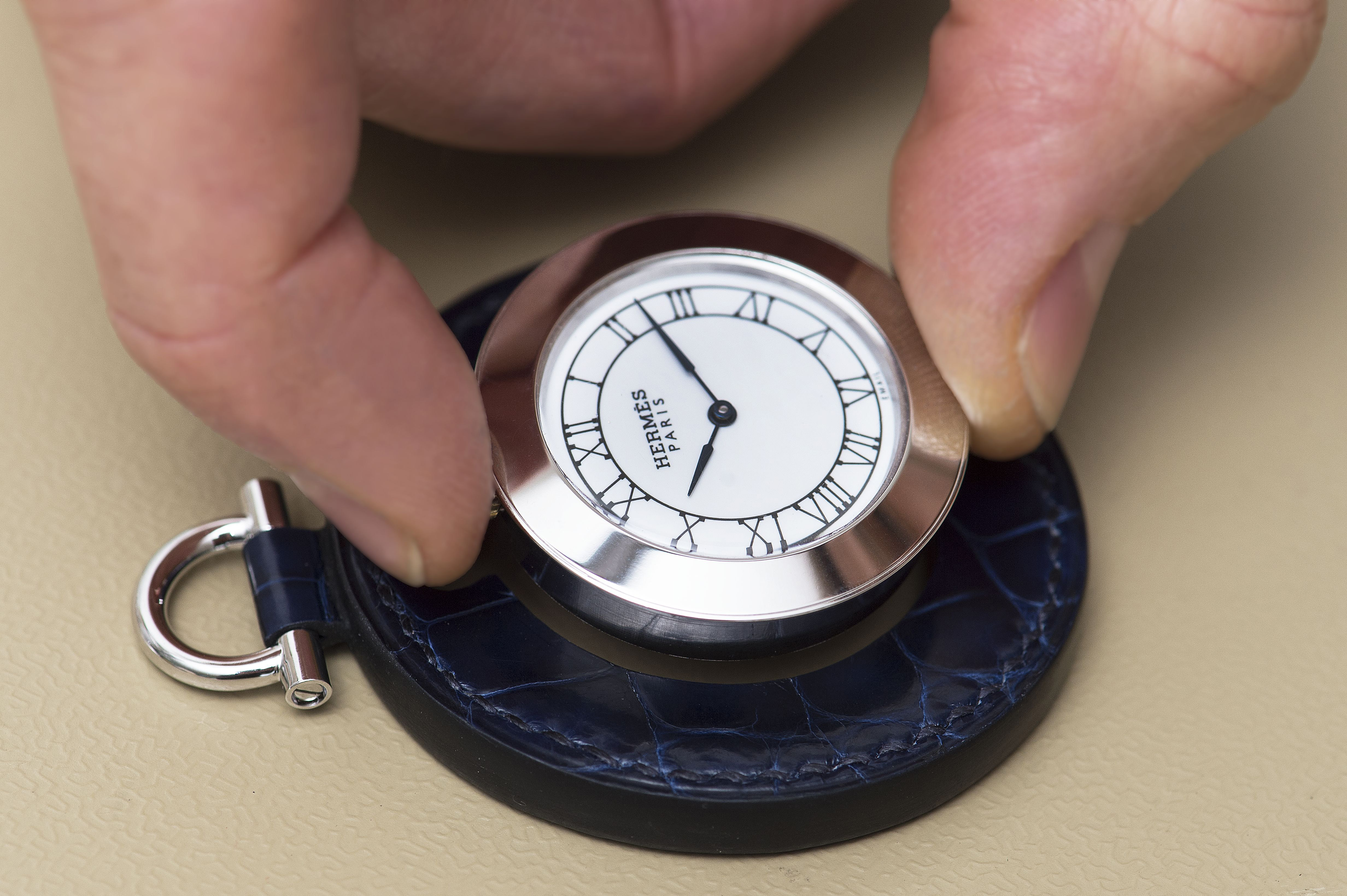 La Pocket plein cuir Hermès est le fruit de la maîtrise des métiers du cuir et de l’horlogerie. Classique et contemporaine à la fois, elle surprend avec son système d’attache et sa protection de cuir. Cette montre-objet marie harmonieusement la science de la mesure du temps, l’art du voyage et de la maroquinerie.
