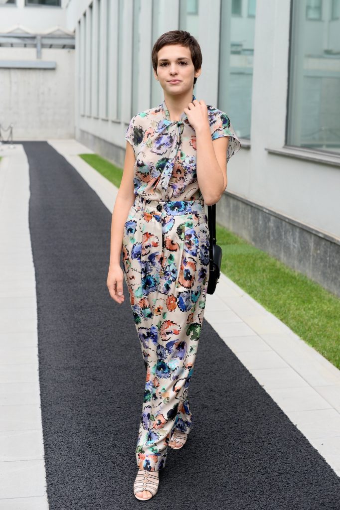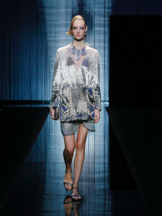 Les proportions sont retenues pour les vêtements du soir, et une profusion d’impalpables micro-sequins et cristaux brodés sont appliqués sur des robes aux coupes légères en georgette ou en organza.