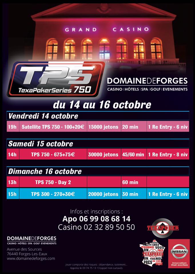 A deux heures de Paris, le Casino de Forges-les-Eaux est une destination idéale pour les Franciliens qui souhaitent disputer un bel événement. Du 15 au 16 octobre prochain, un tournoi à 750€ sera organisé. 30 000 jetons de départ et des niveaux de 45, puis 60 minutes. Une belle structure !
