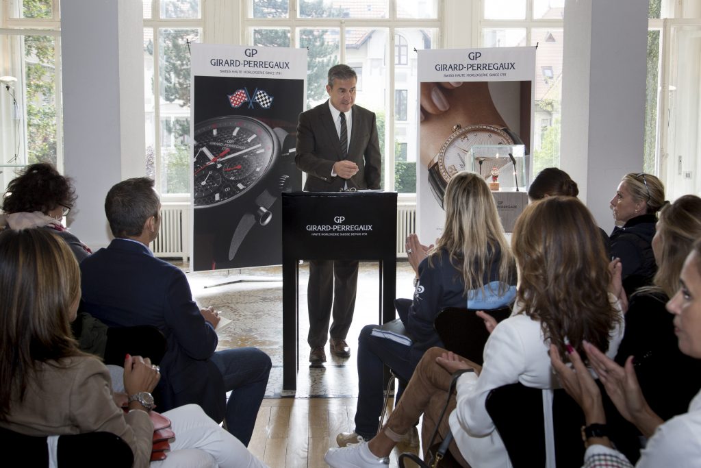 Antonio Calce, CEO de Girard-Perregaux s’est notamment exprimé sur la volonté de Girard-Perregaux de soutenir les évènements uniquement féminins et promouvoir ainsi durablement l’égalité femmes-hommes au travers de partenariats. La conférence de presse s’est tenue dans le « Château » Girard-Perregaux, avec la présence de Miss Suisse 2015 Laetitia Guarino ainsi que les équipages du Rallye des Caprices.