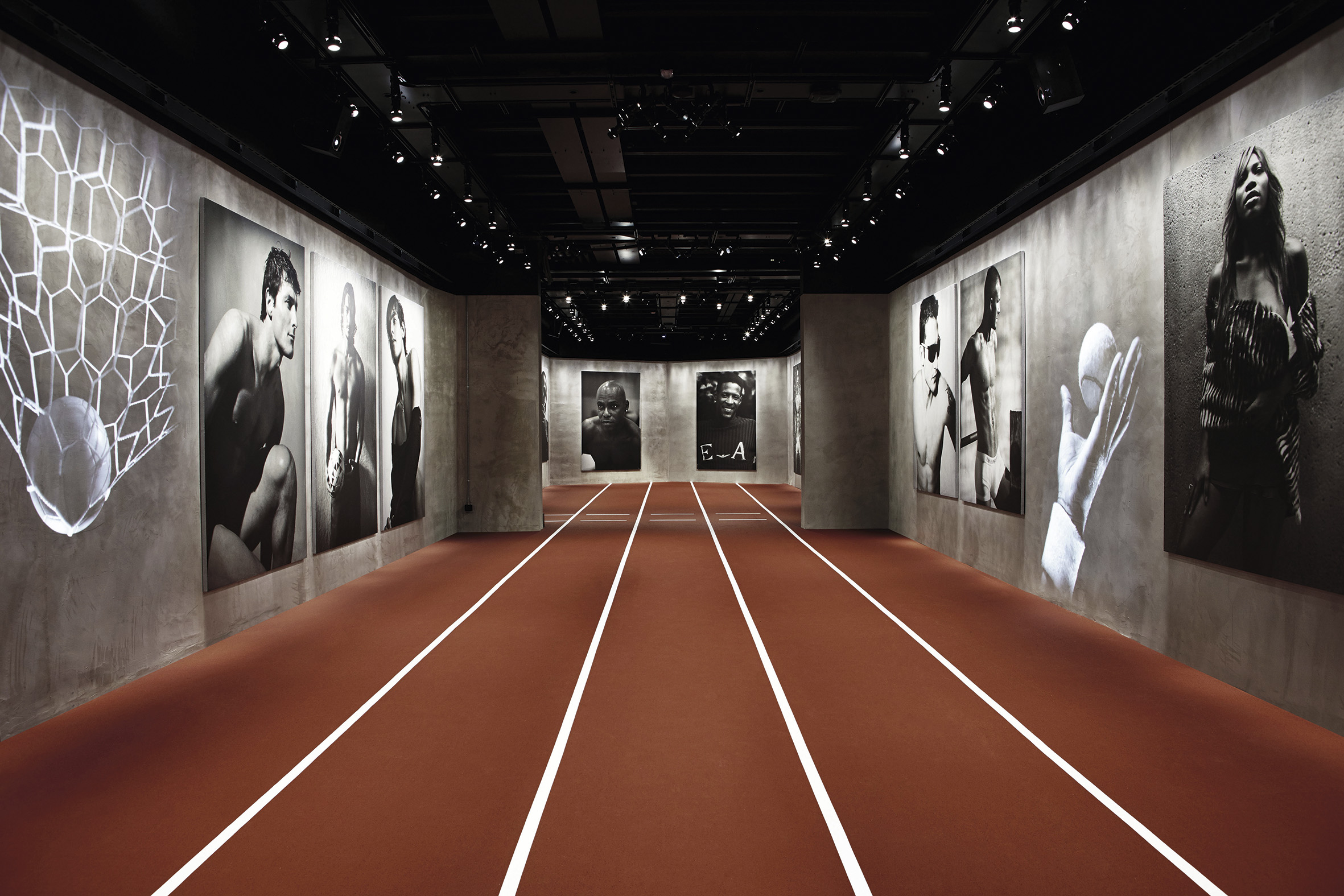 Ces clichés emblématiques, qui datent de 1985 à aujourd’hui, occupent tout le rez-de-chaussée d’Armani/Silos. Giorgio Armani a personnellement conçu le design de l’exposition afin d’y refléter l’espace et le sujet – les images sont imprimées sur des dalles géantes avec une finition en béton pour faire écho au style des murs, tandis que le sol se transforme en piste de course. Un énorme modèle grandeur nature d’un athlète en équilibre sur un globe est à l’honneur dans l’atrium central.