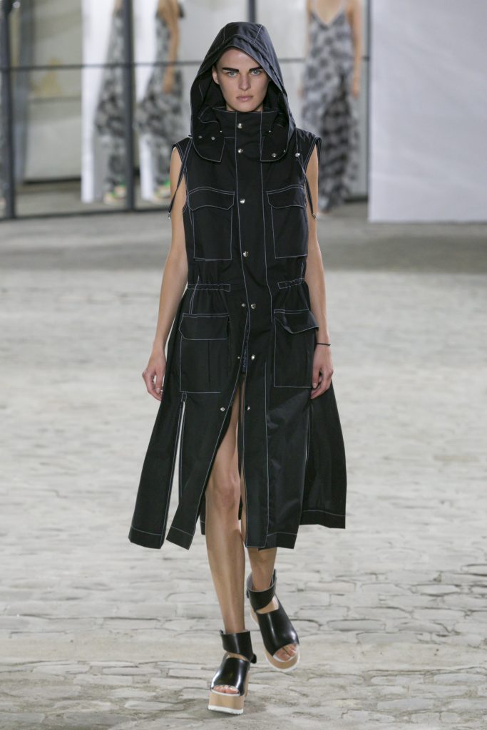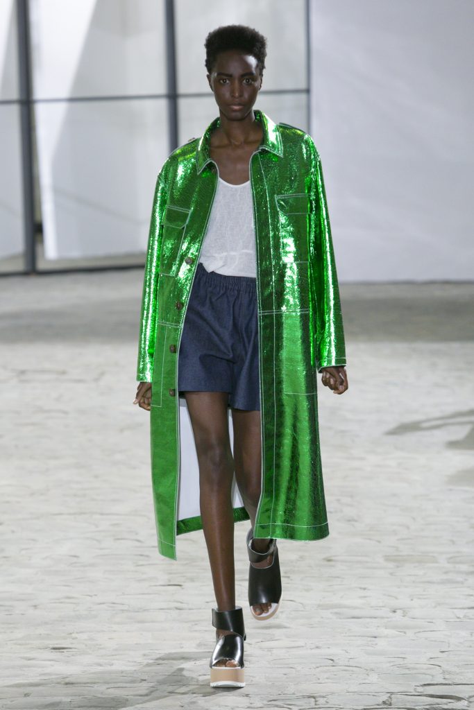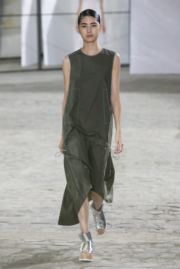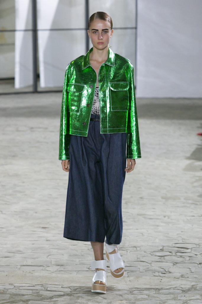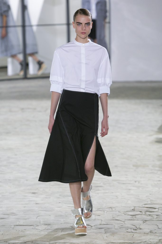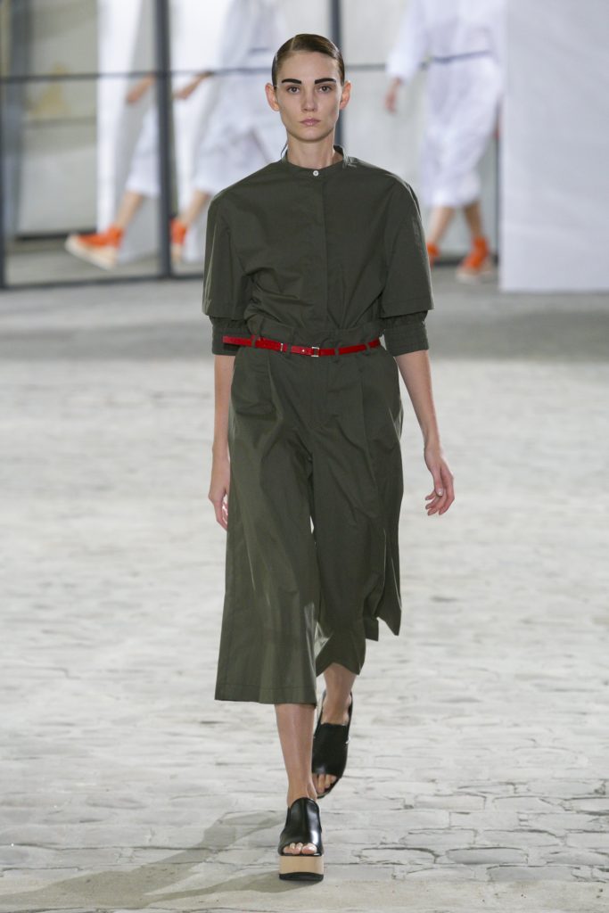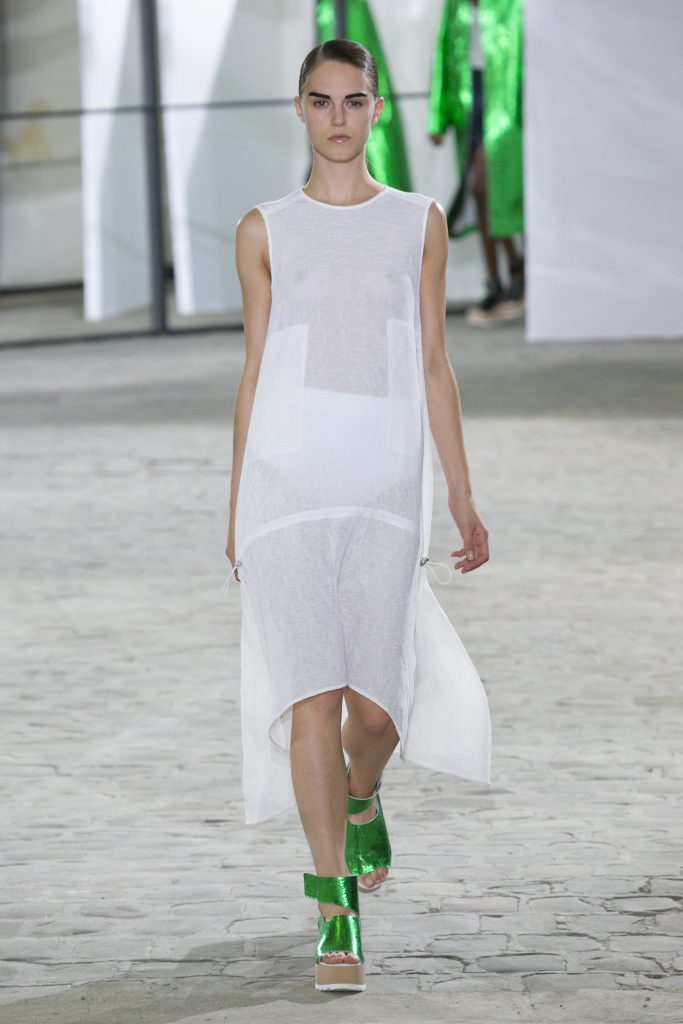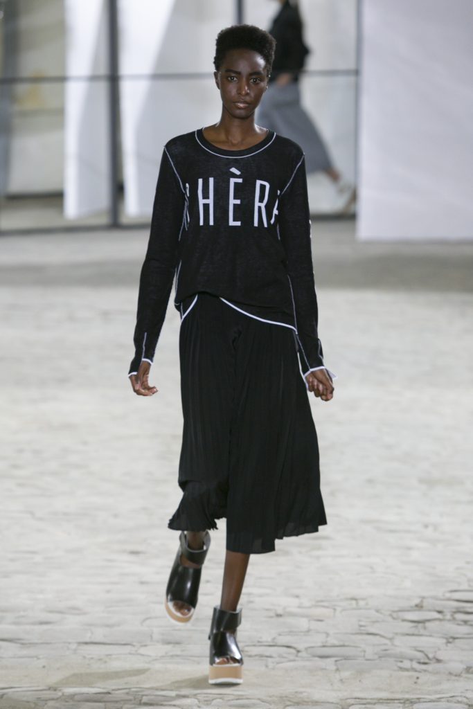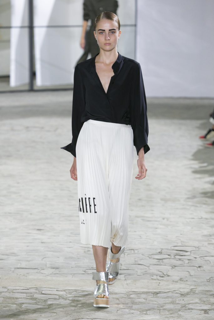 La créatrice secoue également les frontières entre sportwear et pièces classiques. Elle réarticule l’ ADN de la garde robe printanière. Esprit urbain qui s’inscrit dans la ligné VETEMENTS : parka à capuche, longue jupe fluide estampiller GAUCHERE et sweat s’immisce dans une collection dont le charme réside dans la vertu d’une effronterie discrète.