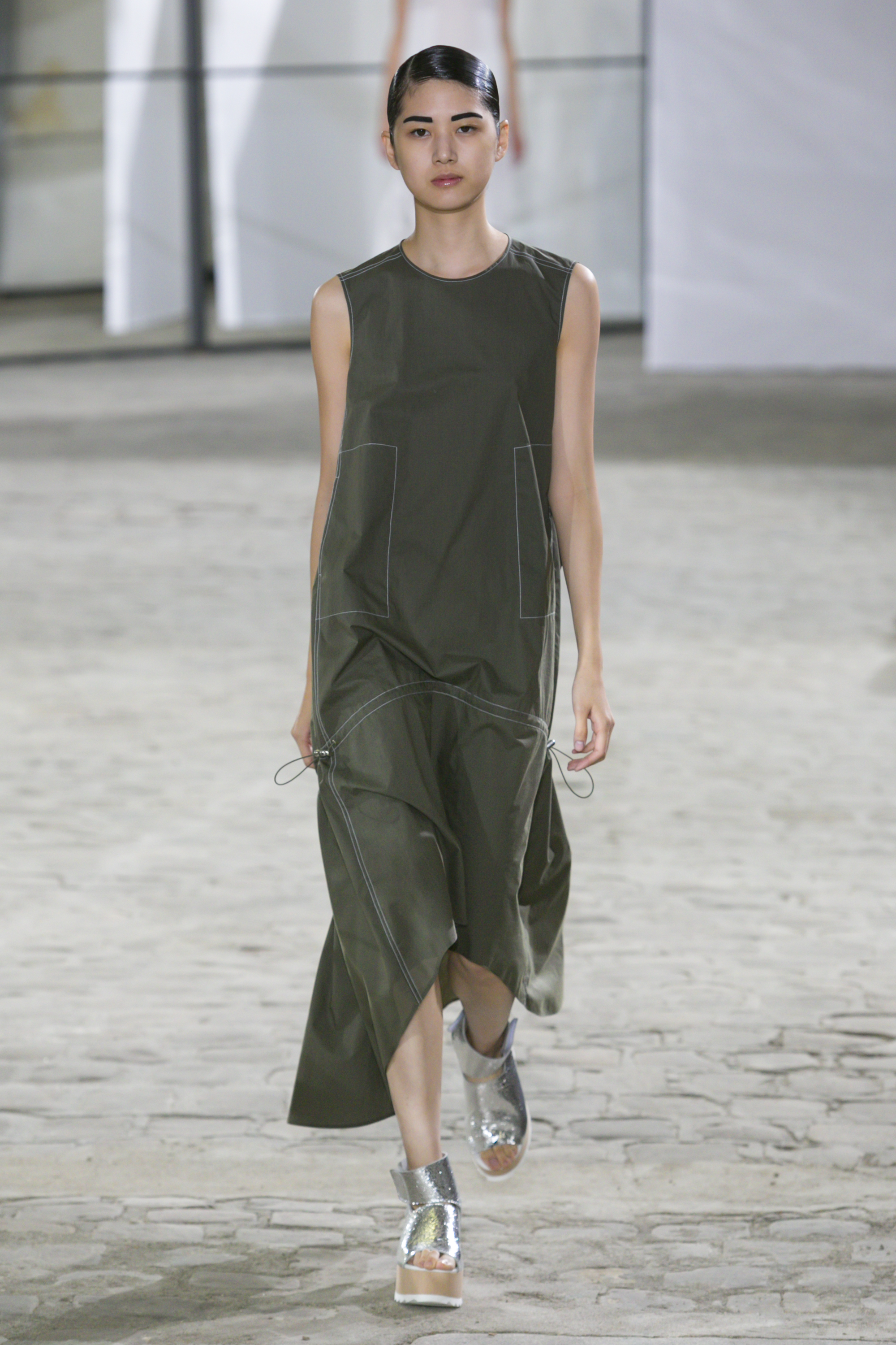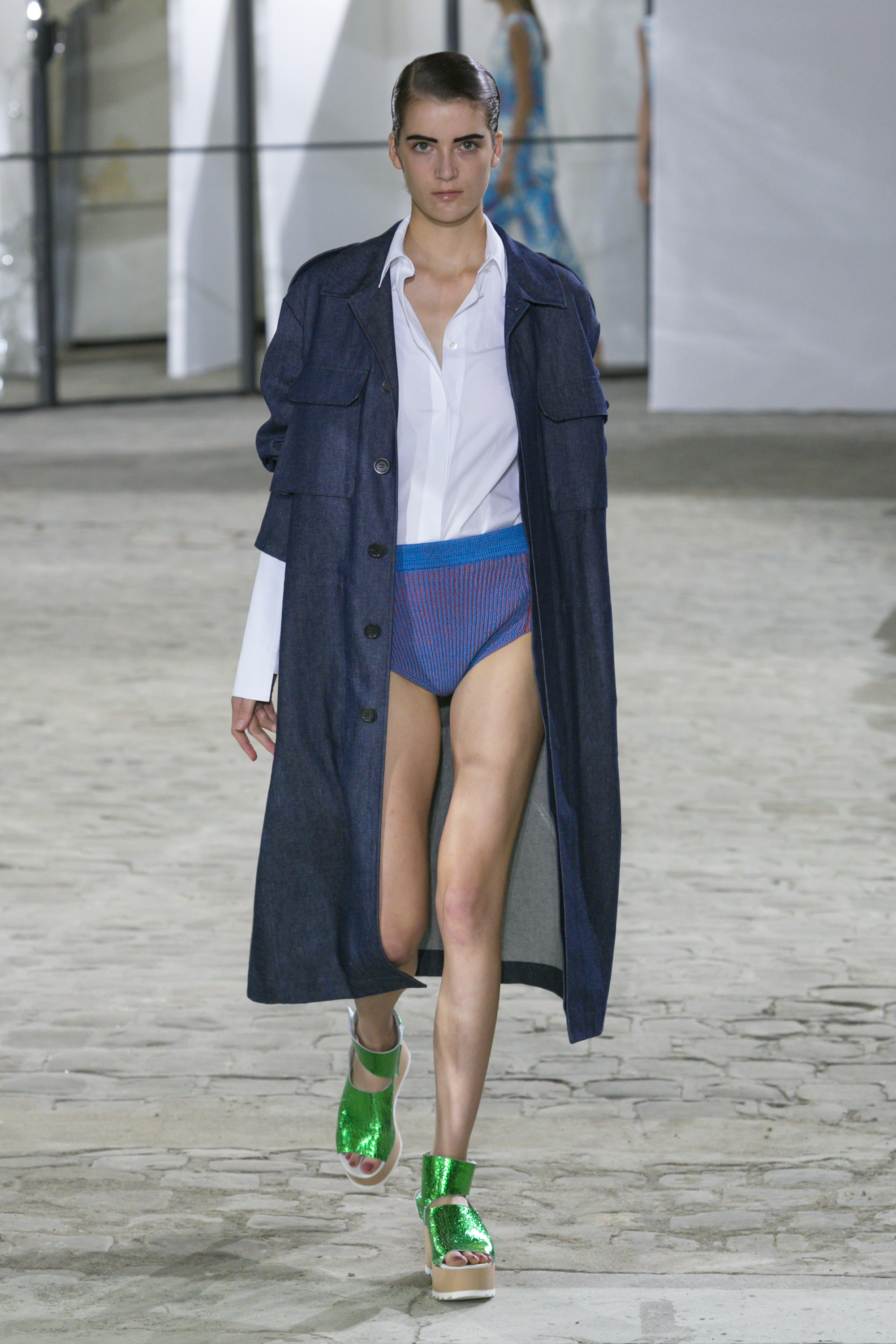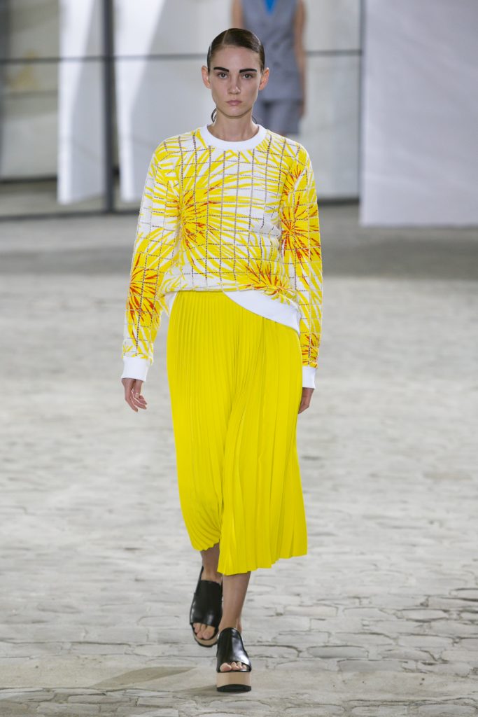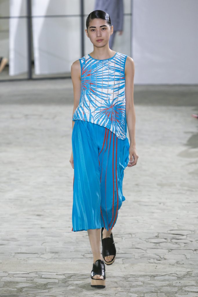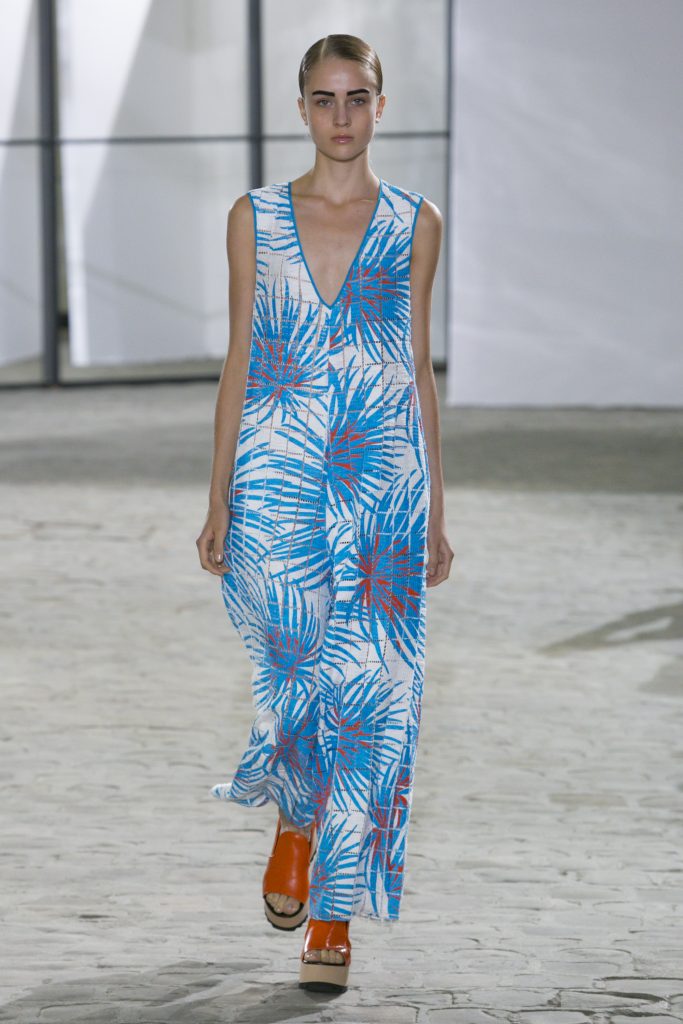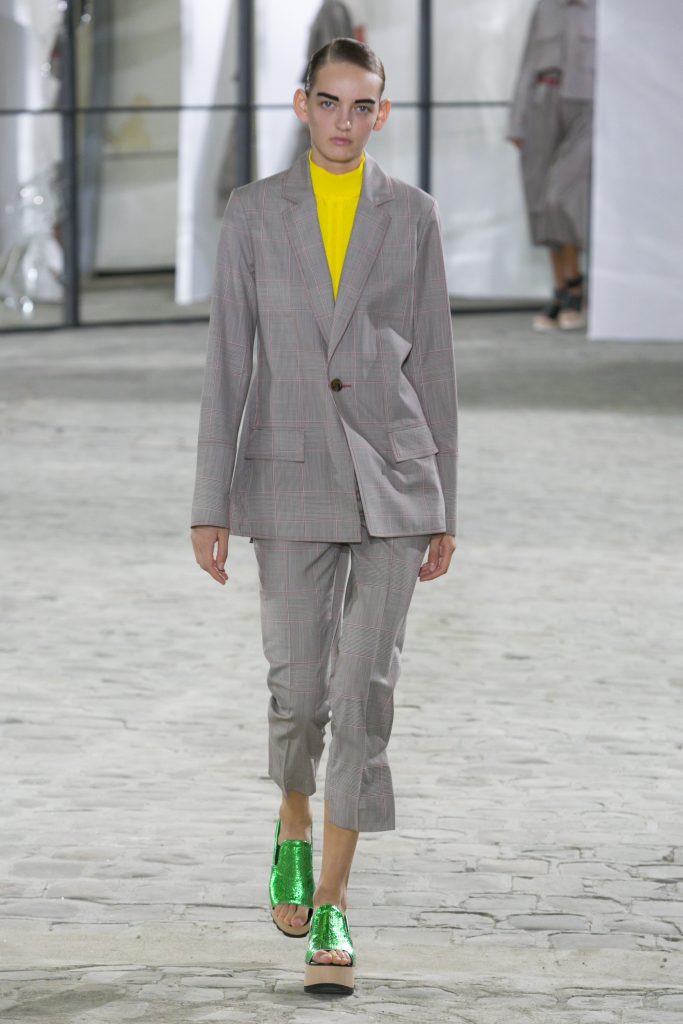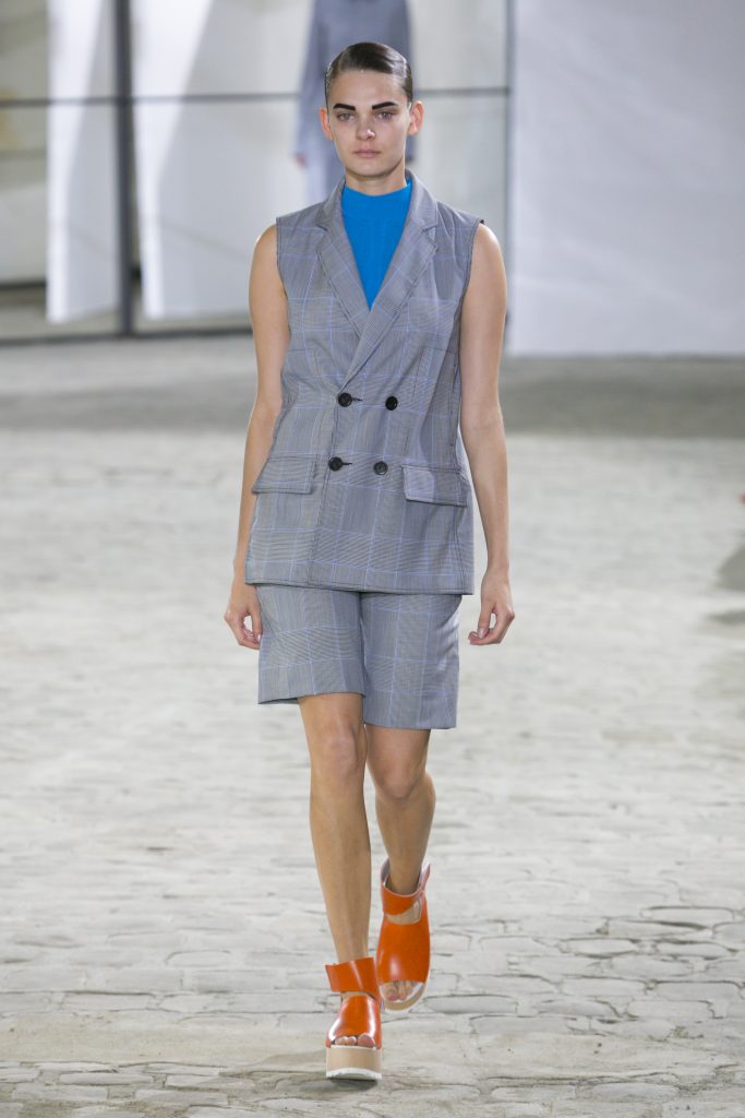 La créatrice secoue également les frontières entre sportwear et pièces classiques. Elle réarticule l’ ADN de la garde robe printanière. Esprit urbain qui s’inscrit dans la ligné VETEMENTS : parka à capuche, longue jupe fluide estampiller GAUCHERE et sweat s’immisce dans une collection dont le charme réside dans la vertu d’une effronterie discrète.