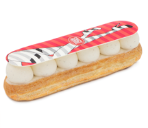 Surmonté d’une coque de chocolat blanc aux couleurs pop qui rappellent les jeux de lumières du Crazy Horse, cet éclair dissimule un crémeux à la vanille de Madagascar mêlé à une compotée framboise-gingembre reposant sur une ganache montée à la vanille de Madagascar et au gingembre.