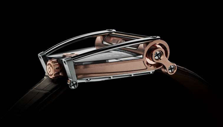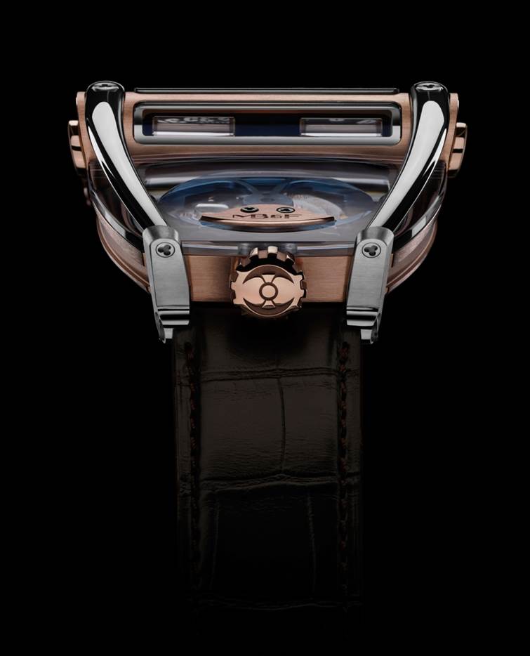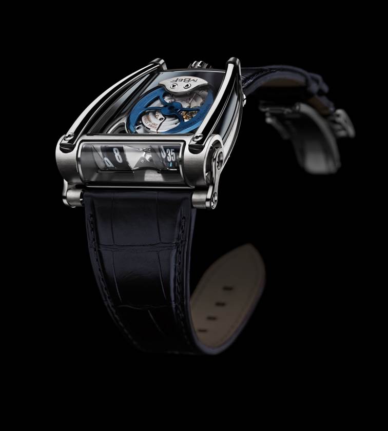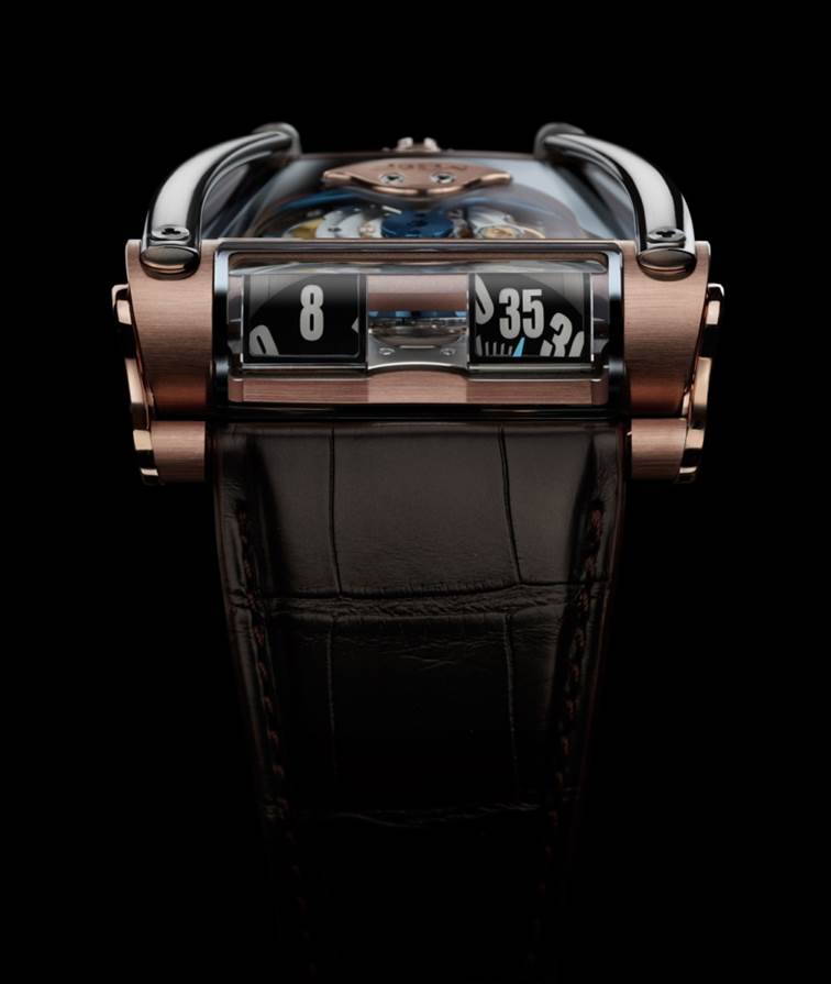 Le mouvement automatique HM8 offre heures sautantes bidirectionnelles et minutes traînantes – projetées verticalement grâce à deux prismes optiques en saphir. Une montre de pilote forcément, disponible en deux versions, combinant le titane grade 5 à l’or 18 carats rose ou blanc. Probablement notre création la plus tridimensionnelle à ce jour!