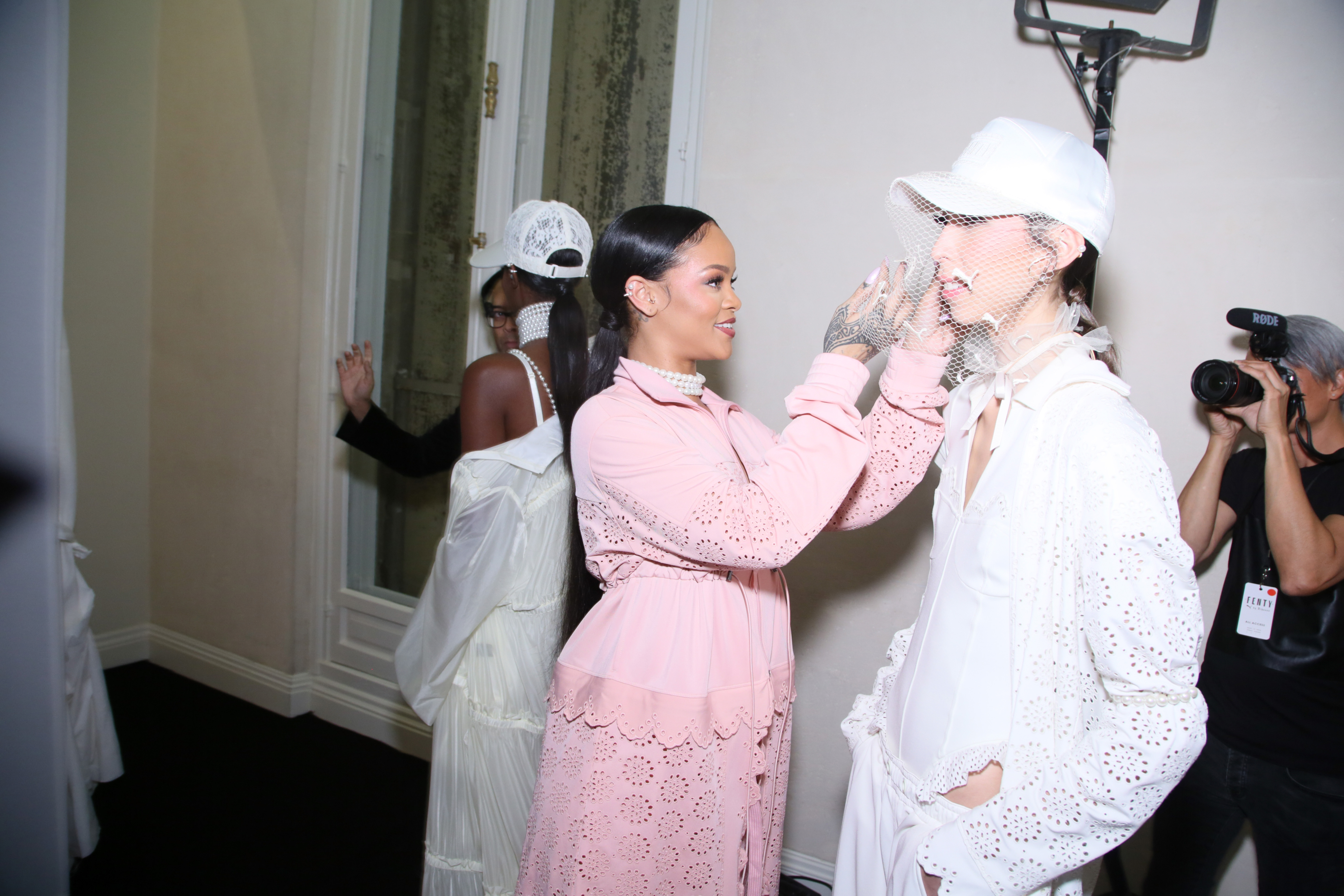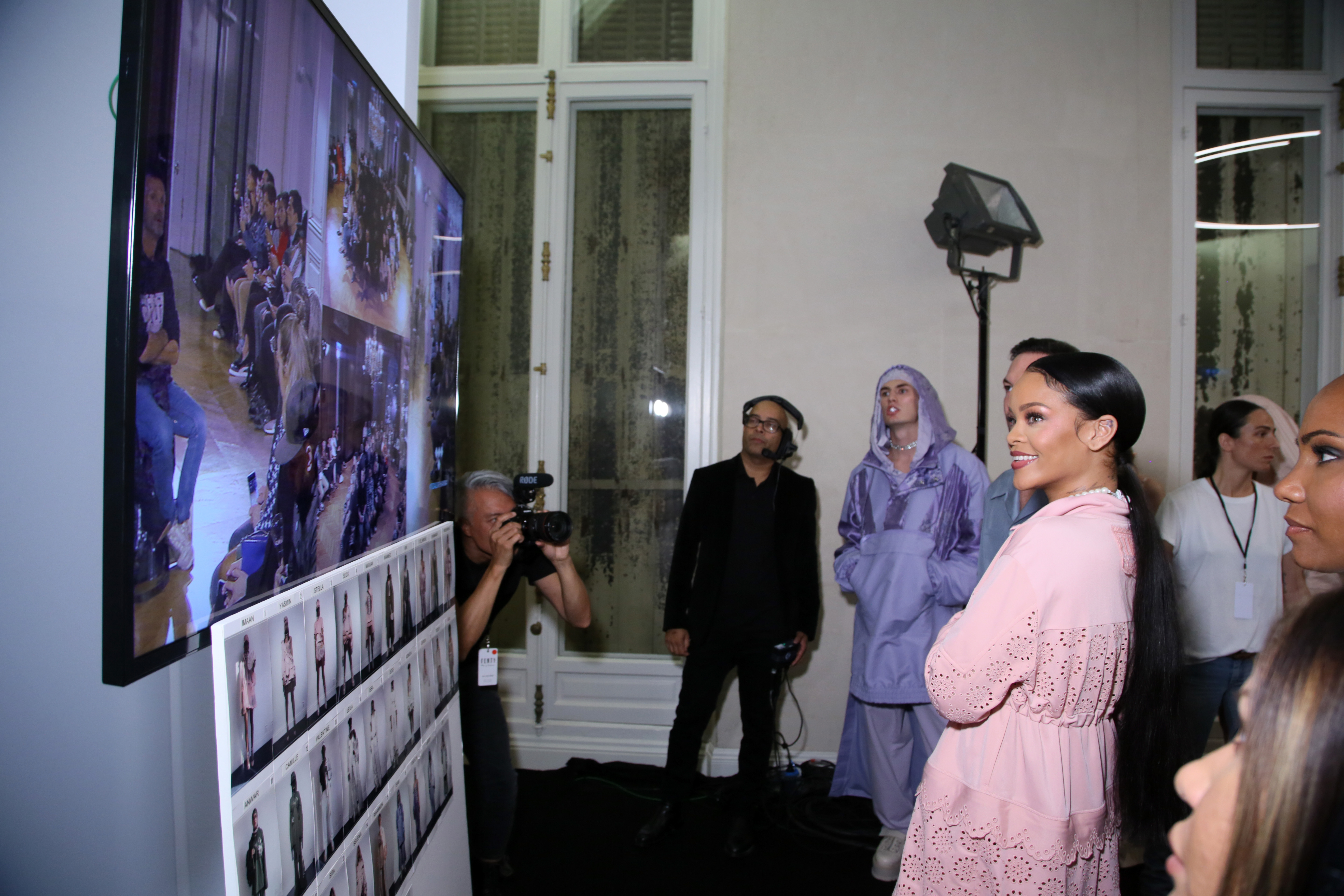 - PARIS, FRANCE – SEPTEMBER 28: Rihanna is seen with models backstage during FENTY x PUMA by Rihanna at Hotel Salomon de Rothschild on September 28, 2016 in Paris, France. (Photo by Victor Boyko/Getty Images for Fenty x Puma)