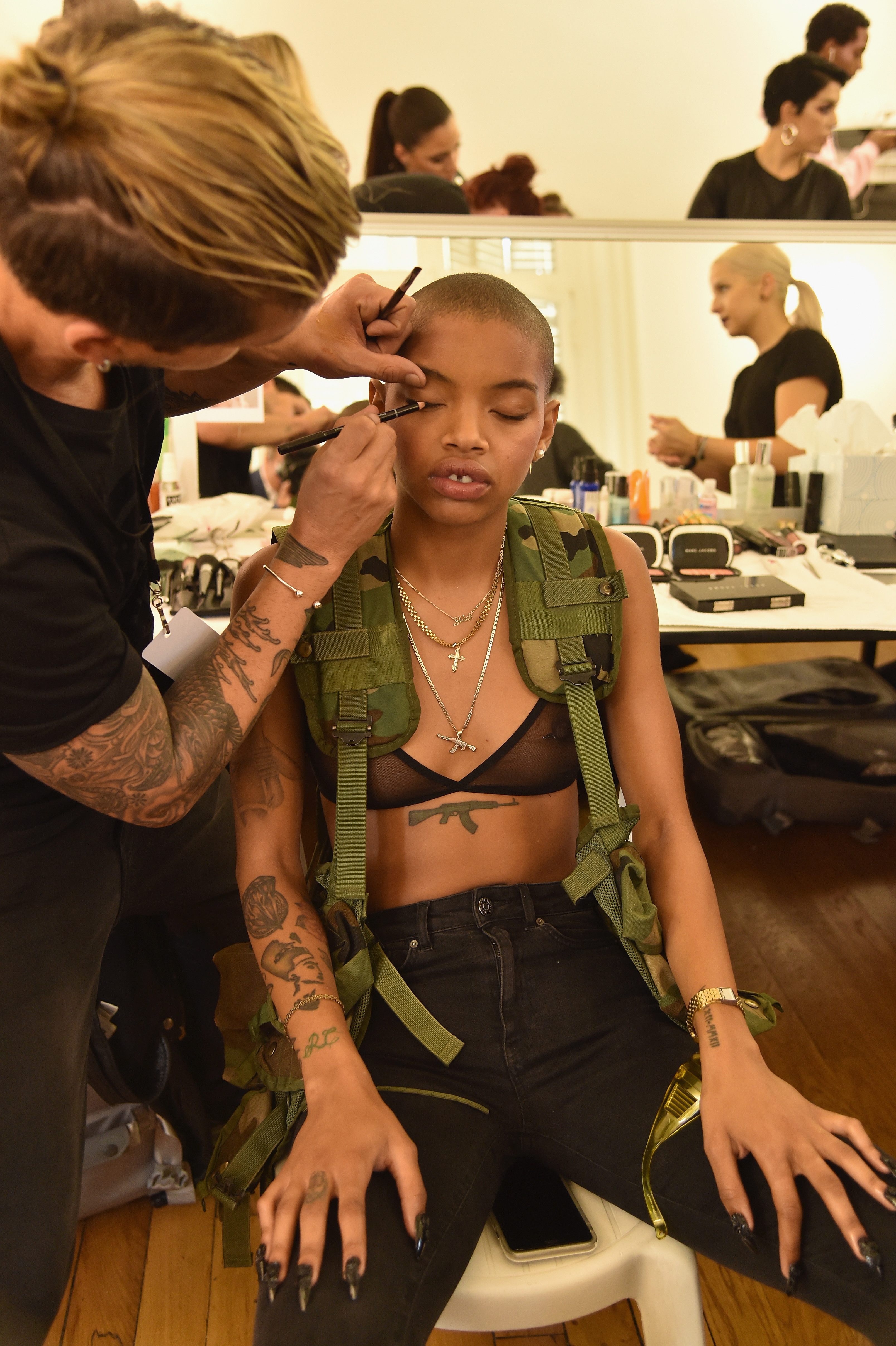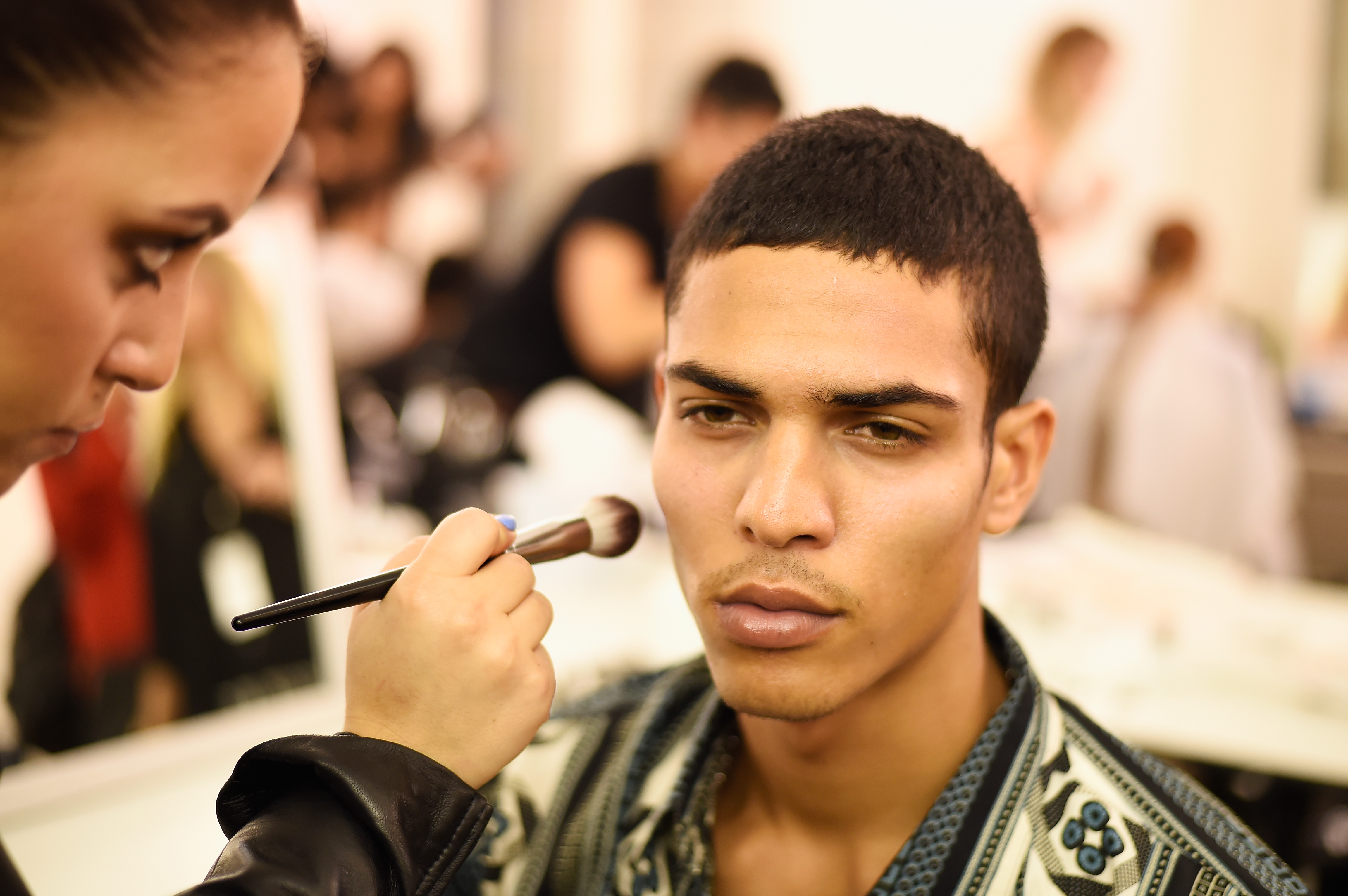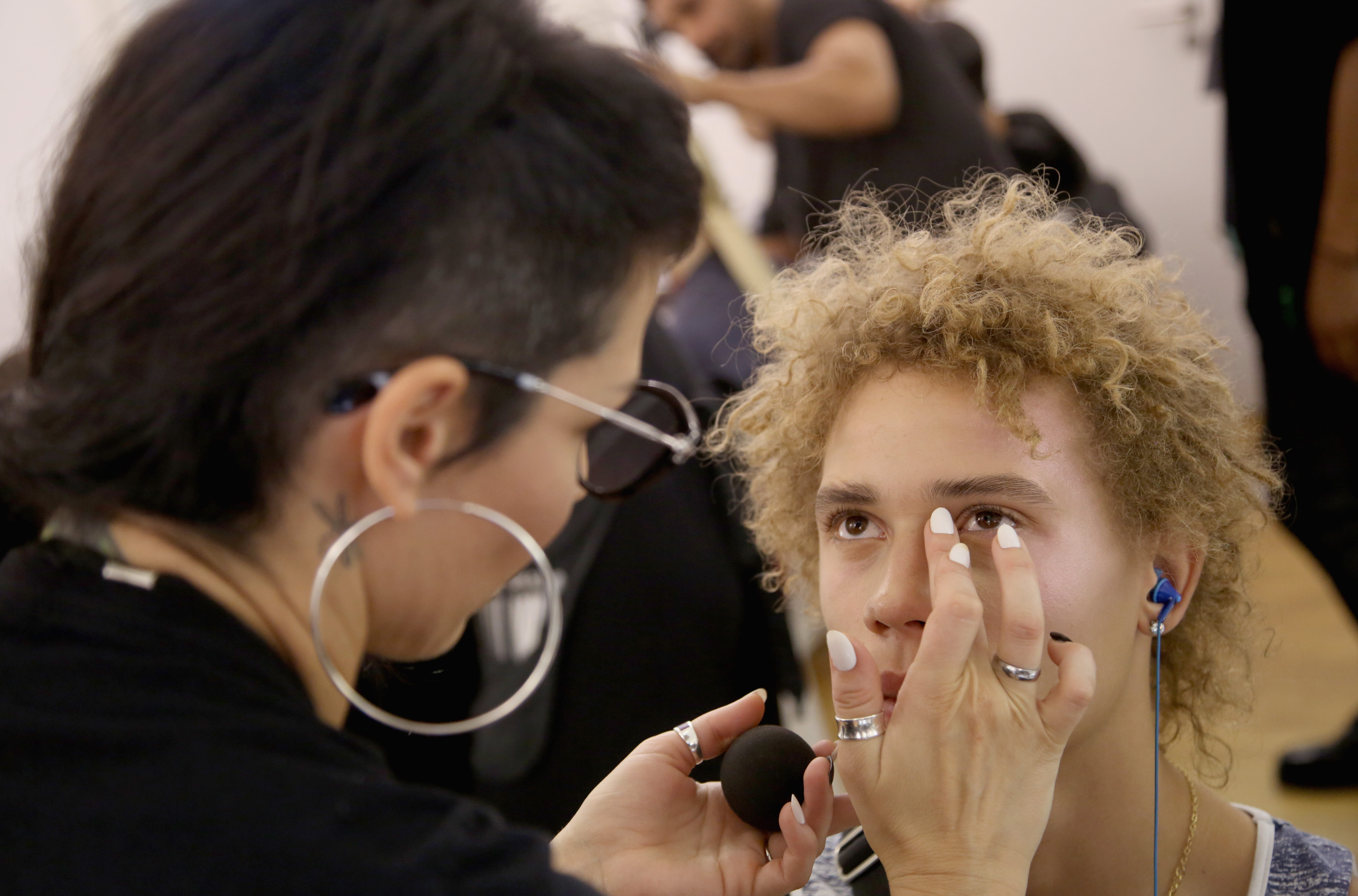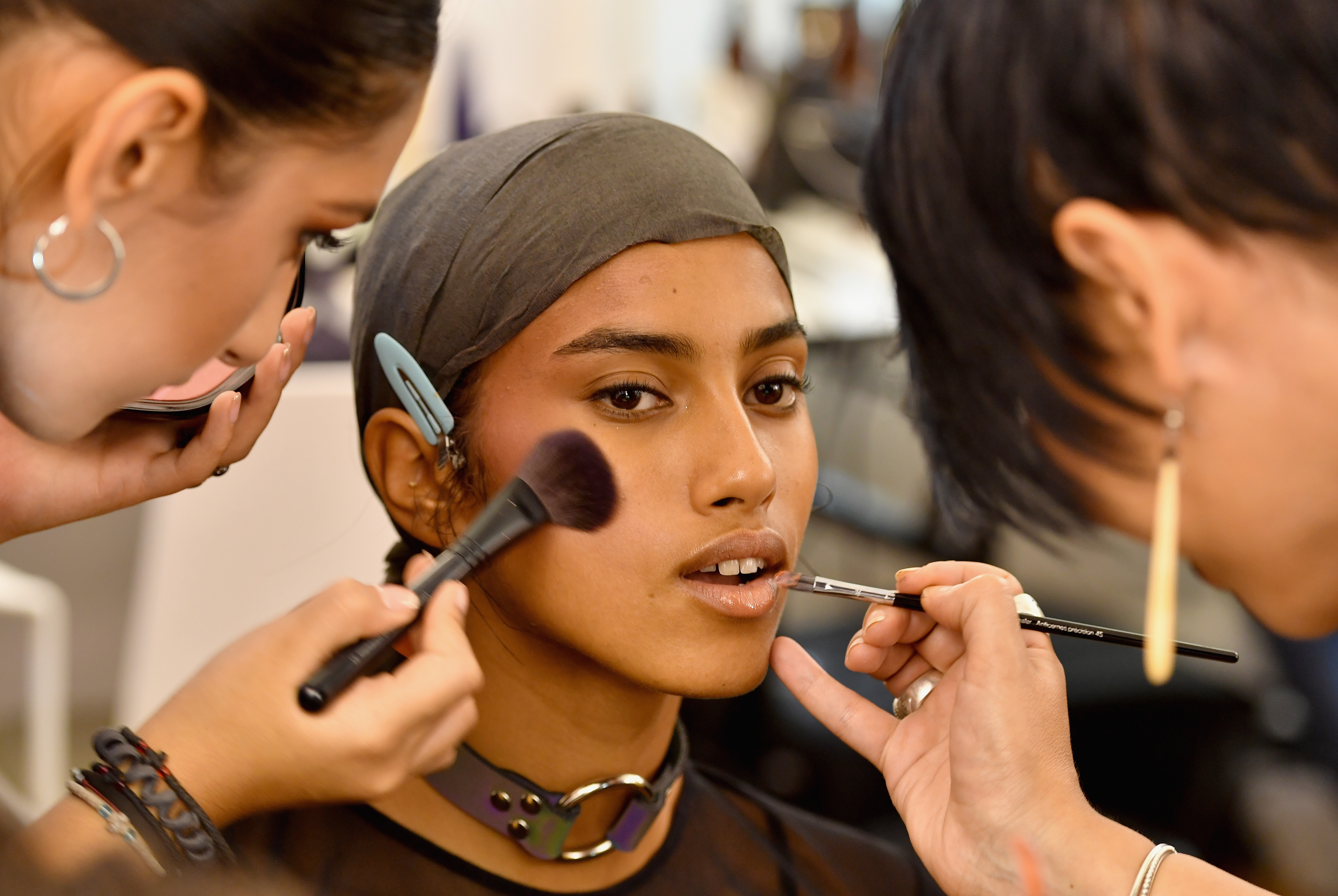 - PARIS, FRANCE – SEPTEMBER 28: A model has makeup applied backstage during FENTY x PUMA by Rihanna at Hotel Salomon de Rothschild on September 28, 2016 in Paris, France. (Photo by Victor Boyko/Getty Images for Fenty x Puma)