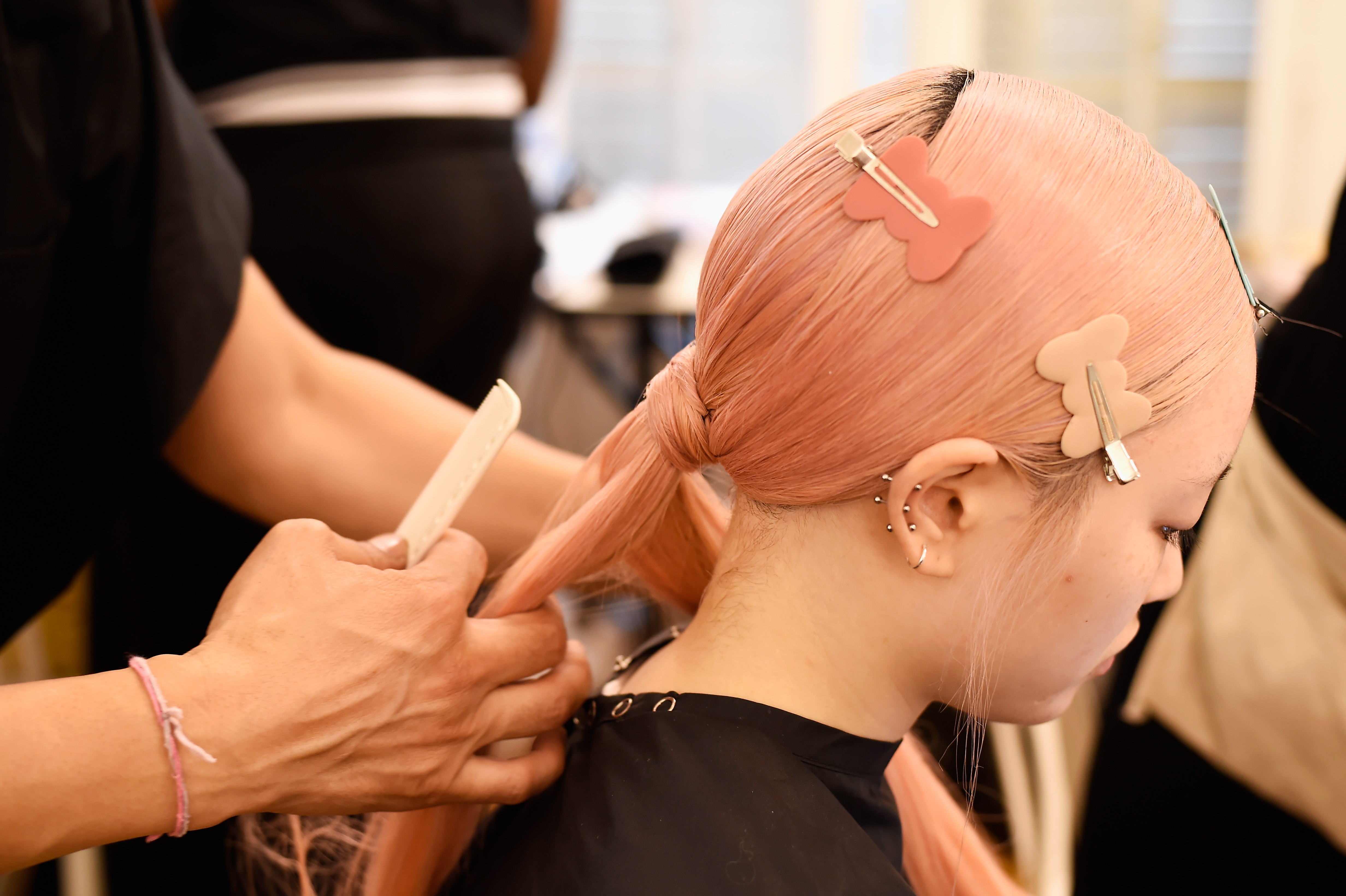 - PARIS, FRANCE – SEPTEMBER 28: A model has their hair done backstage during FENTY x PUMA by Rihanna at Hotel Salomon de Rothschild on September 28, 2016 in Paris, France. (Photo by Victor Boyko/Getty Images for Fenty x Puma)